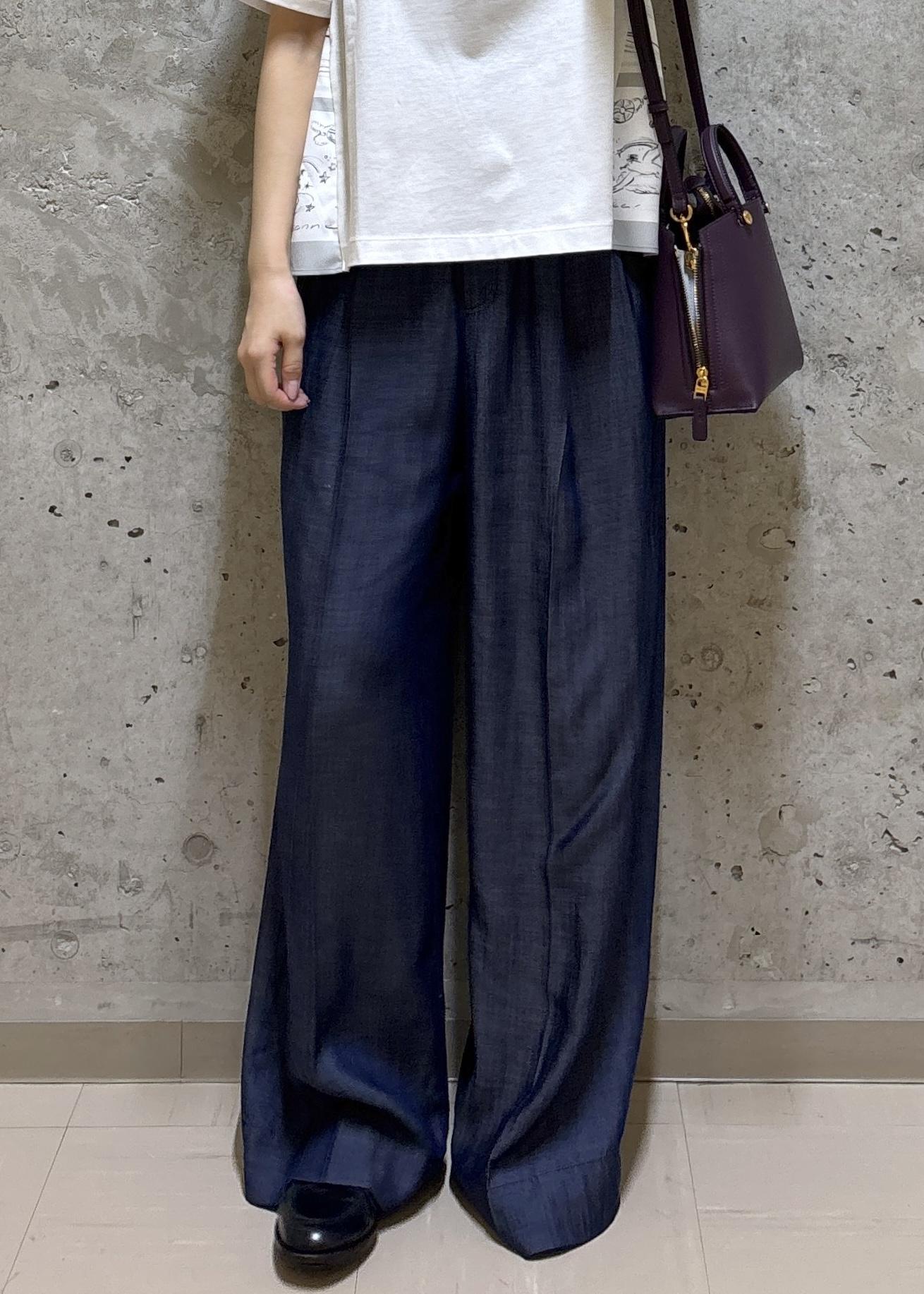 キレイ目なデニム調。薄手のサラッとした手触りでほぼシワも付きにくく、裏地なしなので夏でも快適に着られます。