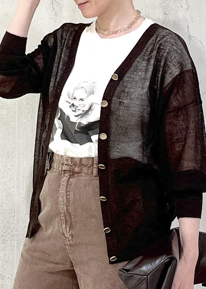 ほんのり透け感があり、夏から秋への端境期にぴったりな気分のカーディガンです。独特の凹凸がある素材なので、直接触れても気持ち良い肌触りです。