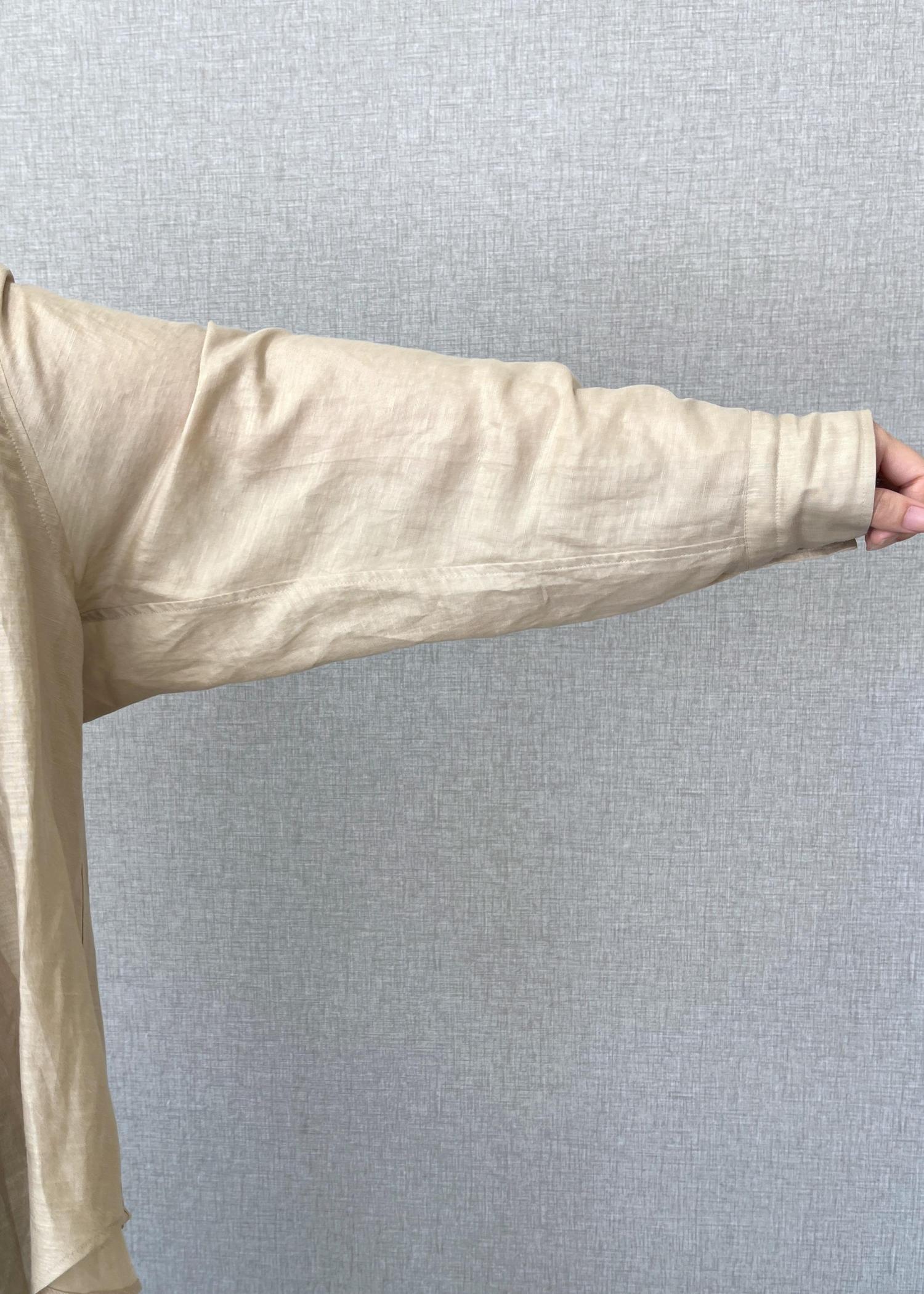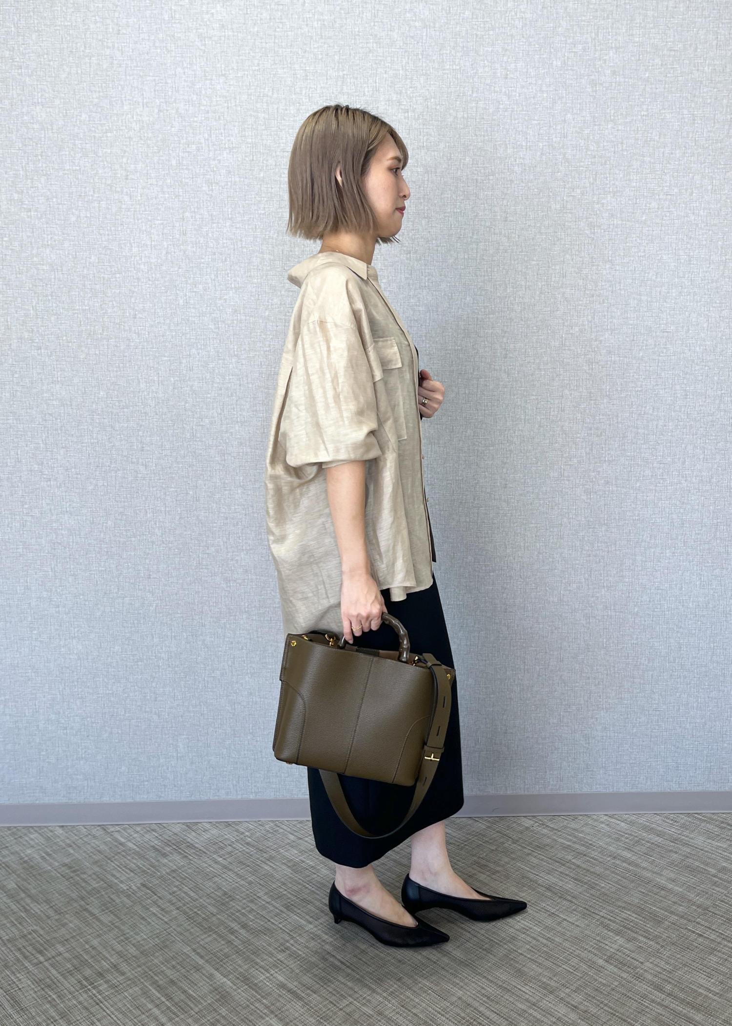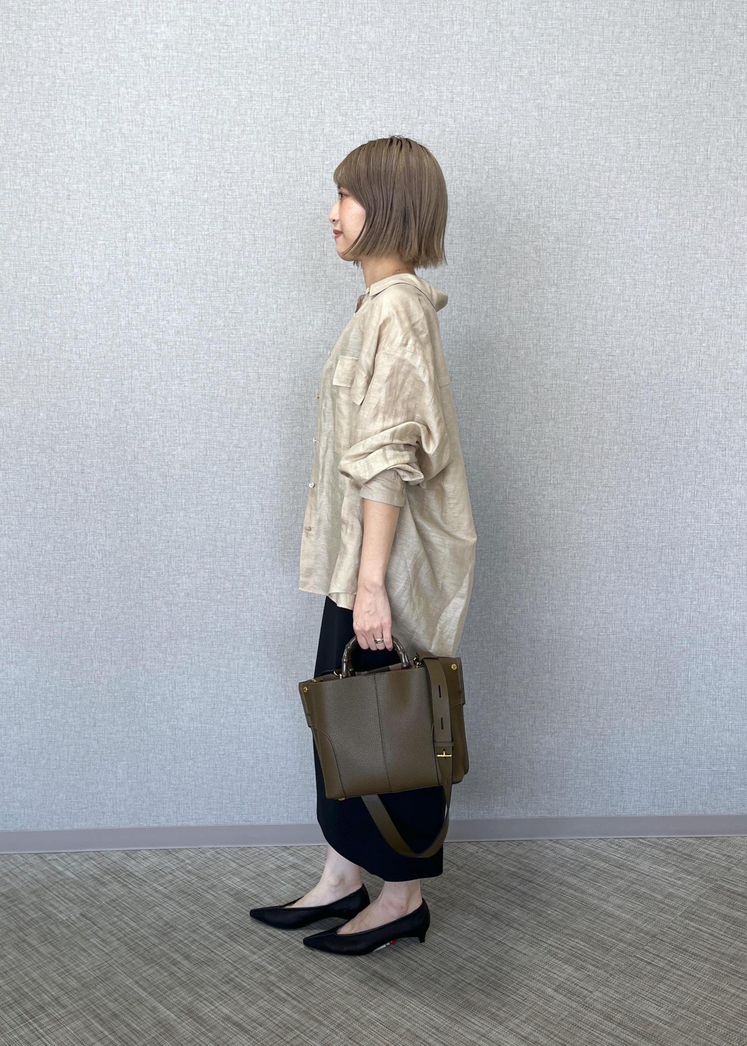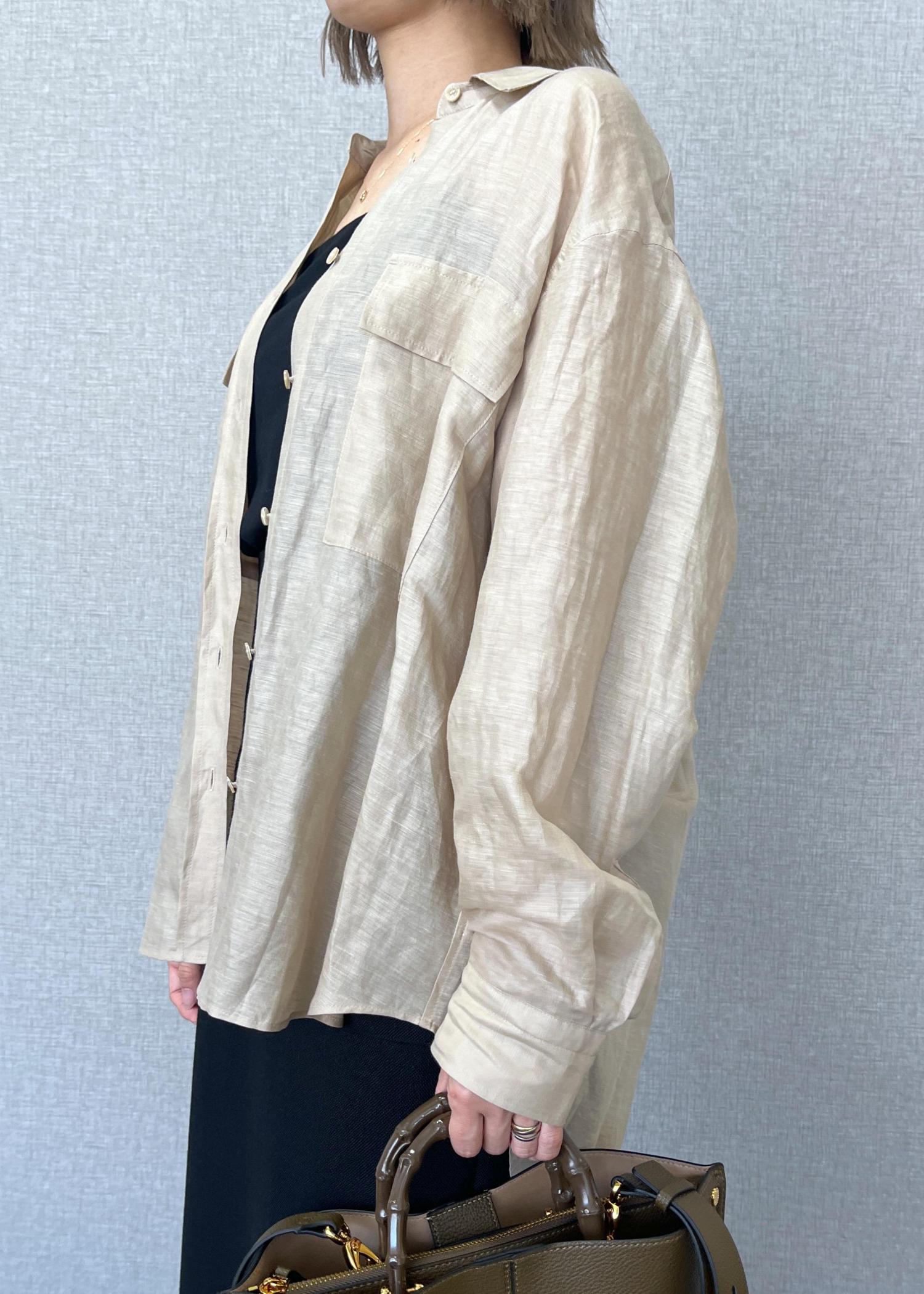 アウトレットROPÉブライトリネン フラップシャツブラウス/洗えるベージュ / F¥16,500レビュージャストサイズが似合う体型ですが、このシャツは程よい抜け感を作り出せる1枚です。