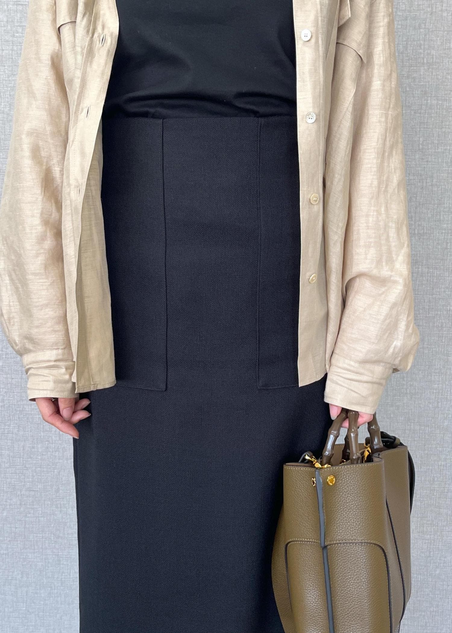ROPÉリネンライク ポケット付きタイトスカート/イージーケアブラック / 38¥20,900レビュー痩せ型、骨格ウェーブで38サイズが腰回りに余裕があり綺麗に着こなせました。
