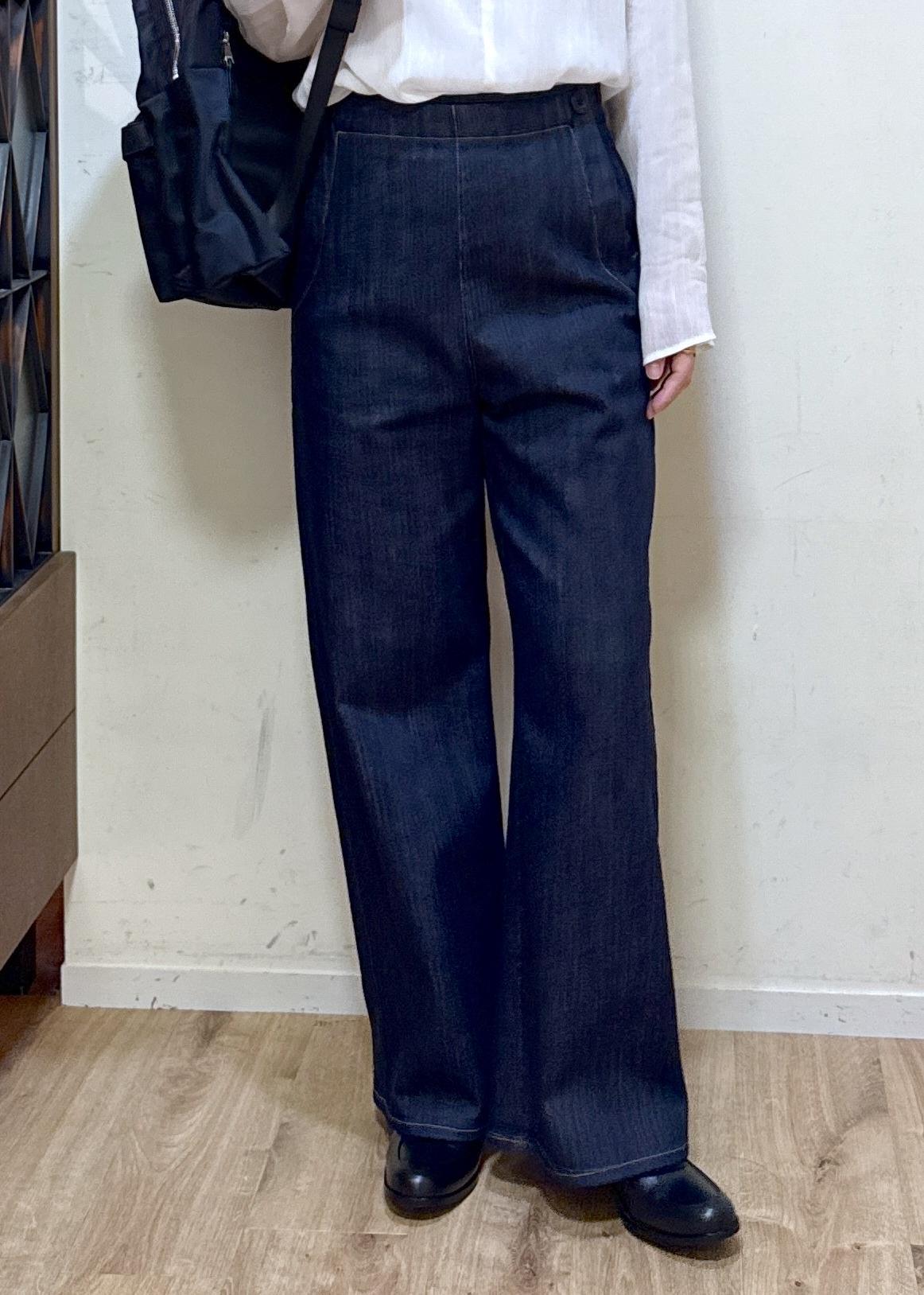 ワイドのように見えますが、履くとスッキリして綺麗めにコーディネートができるデニムパンツです。