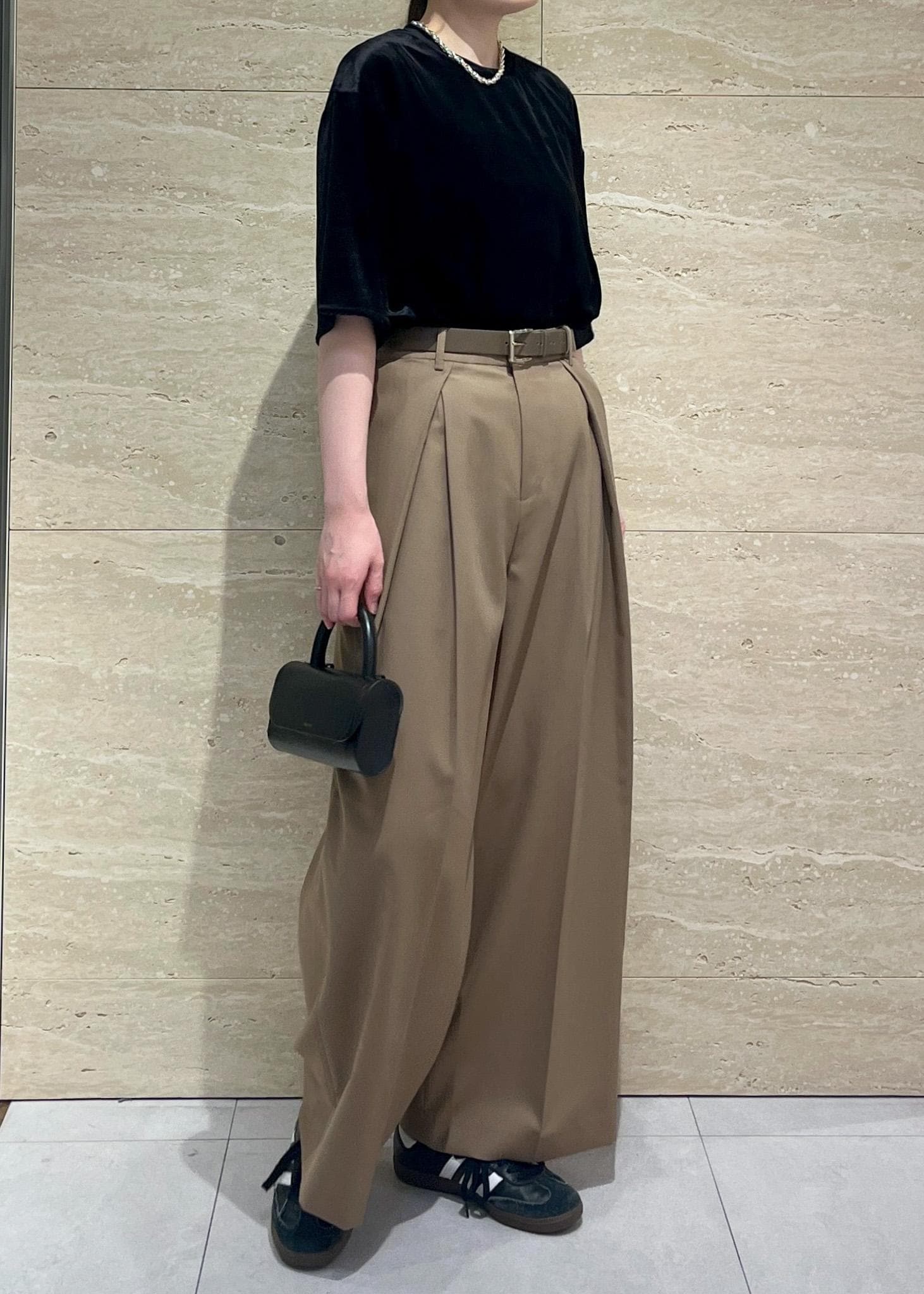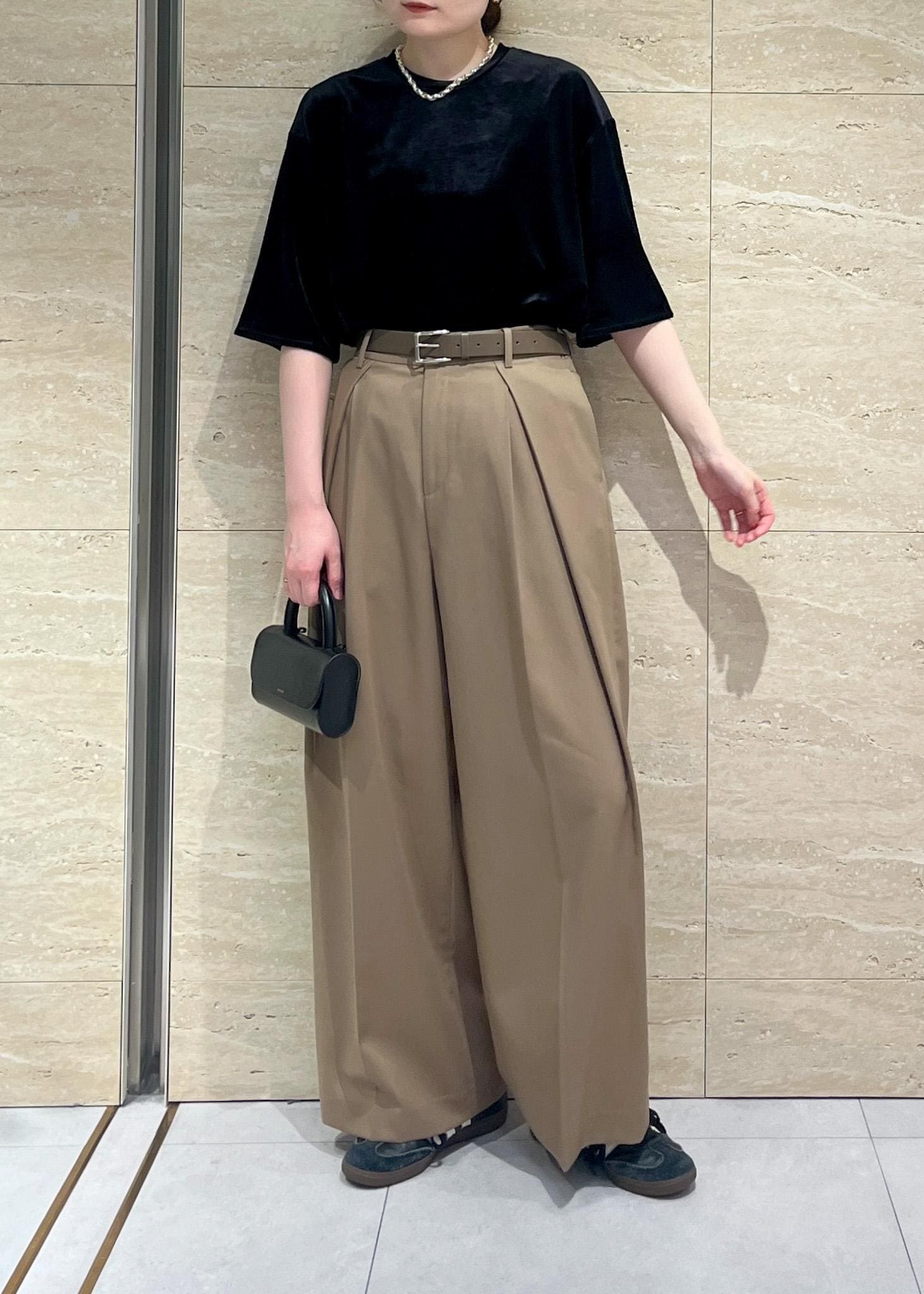 カジュアルっぽくみえますが、ベロア素材が艶があるのでバランスがとりやすいアイテムです。