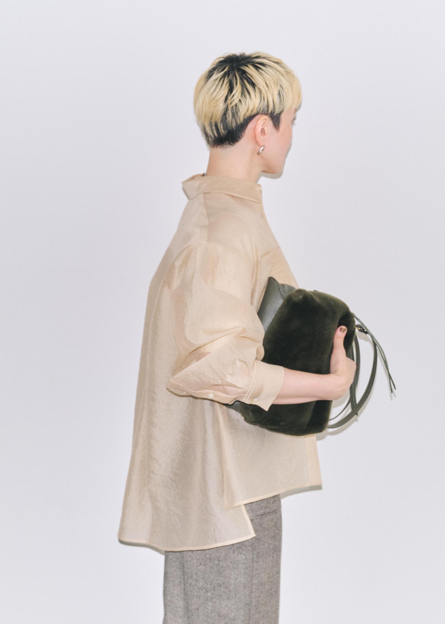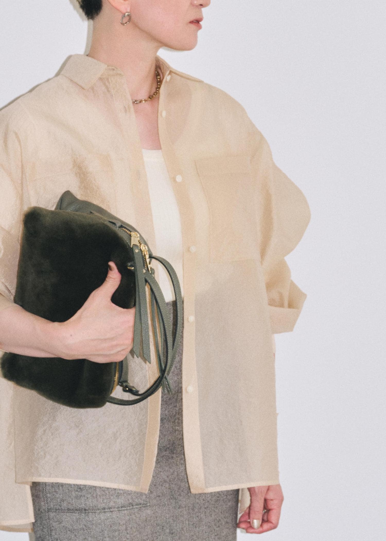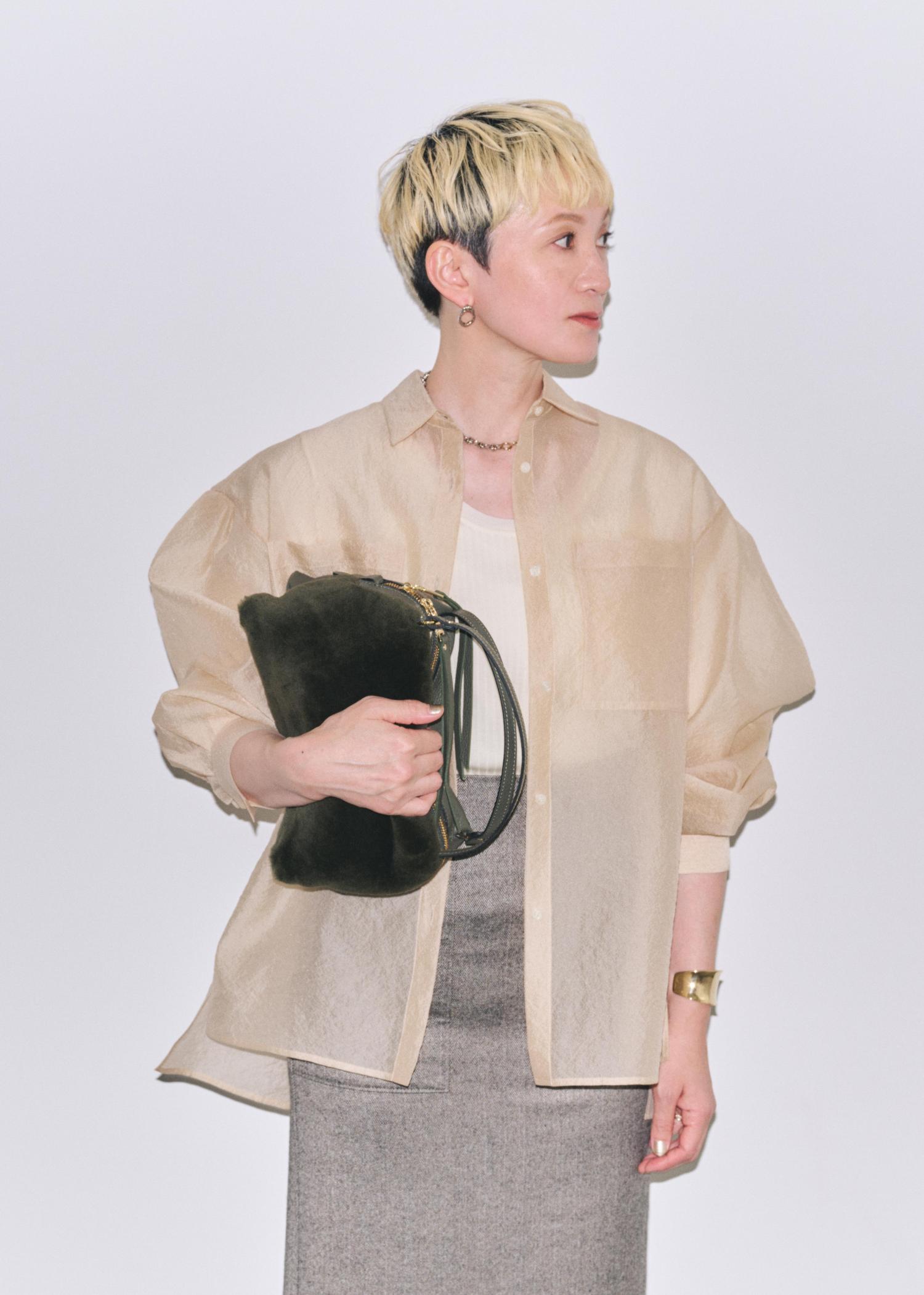 独特なざらっとした触り心地のオーガンジー素材で、少し張り感があり、ゆったりとしたシルエットです。