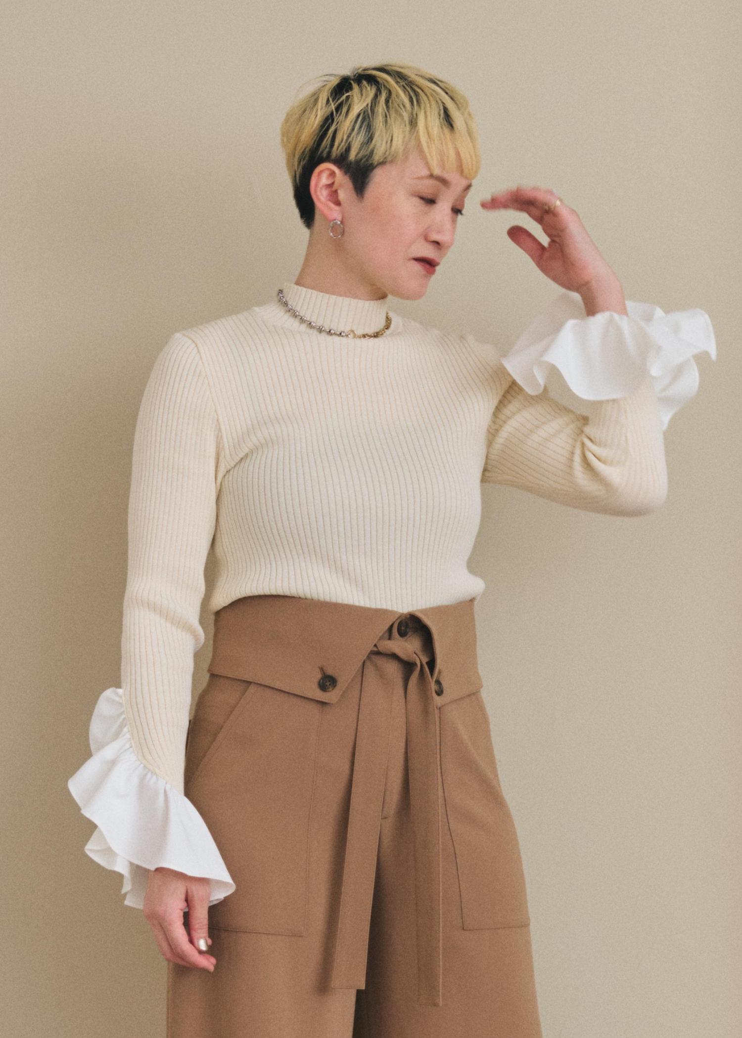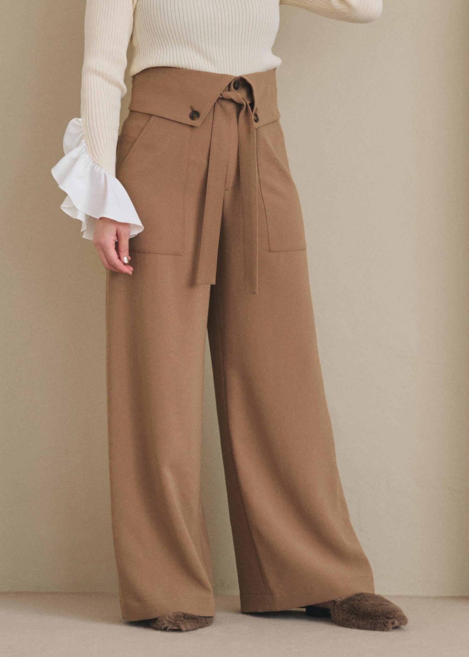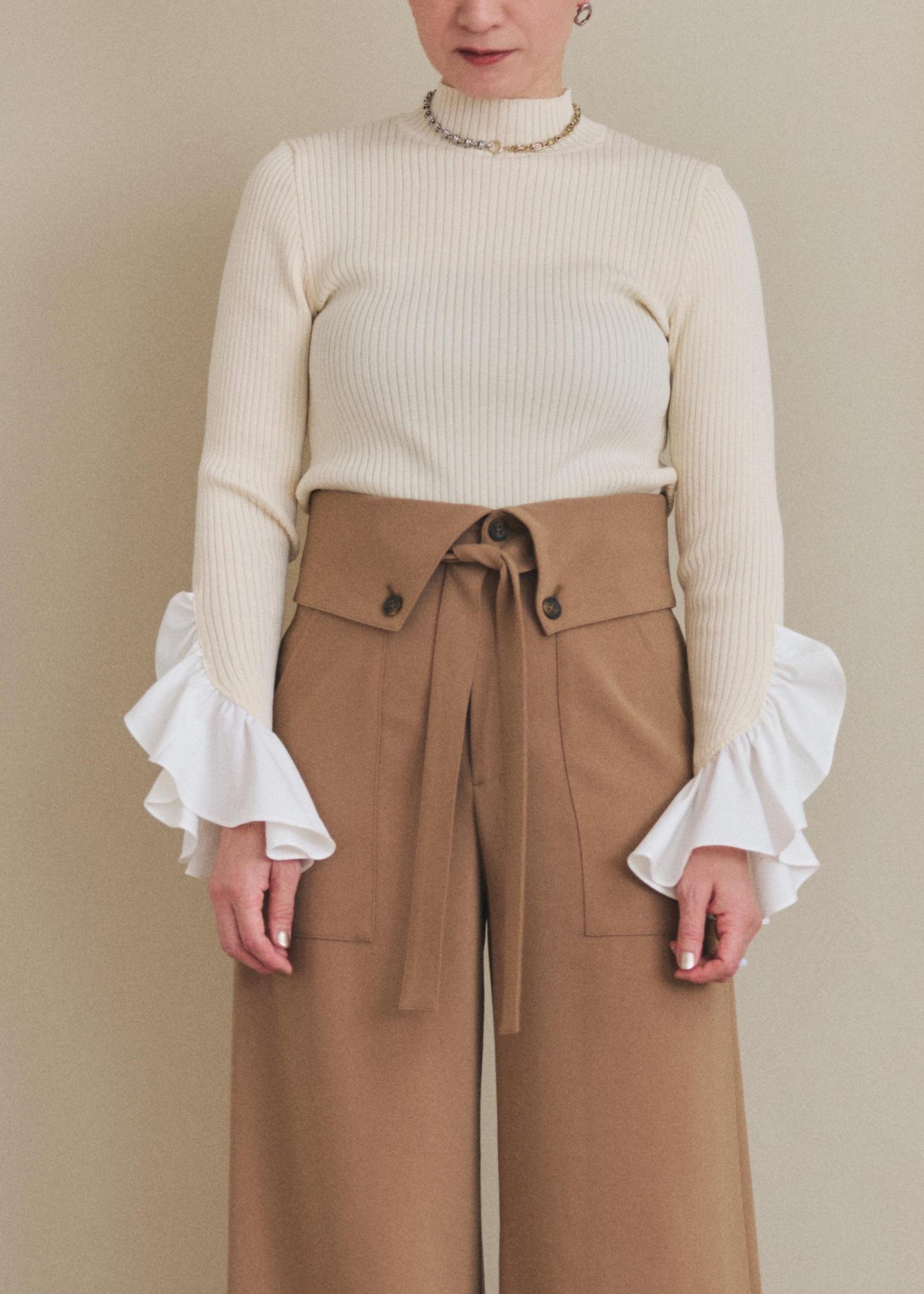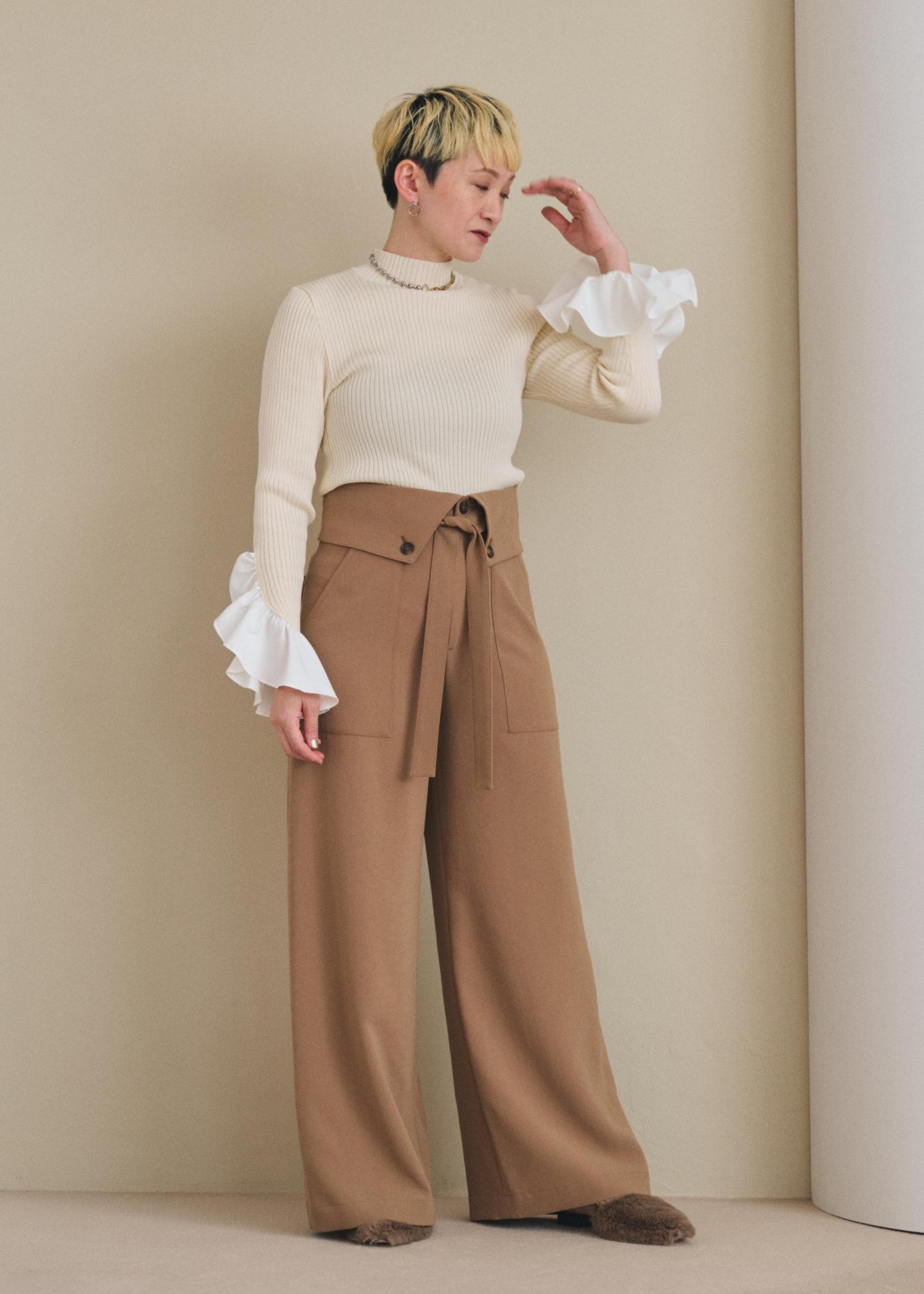 ウエストの少し高めの位置に折り返しがあるので、気になる腰回りもすっきり見えます。同布のベルトはひと結びする位のバランスがおすすめ。