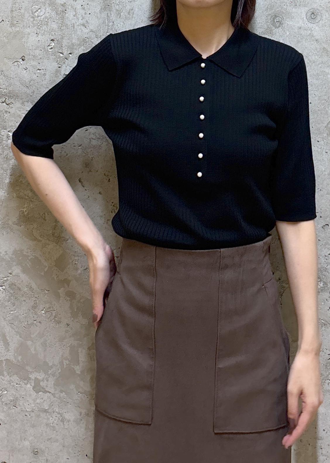 パールボタンが華やかで、スッキリとしたシルエットのポロ襟ニット。
