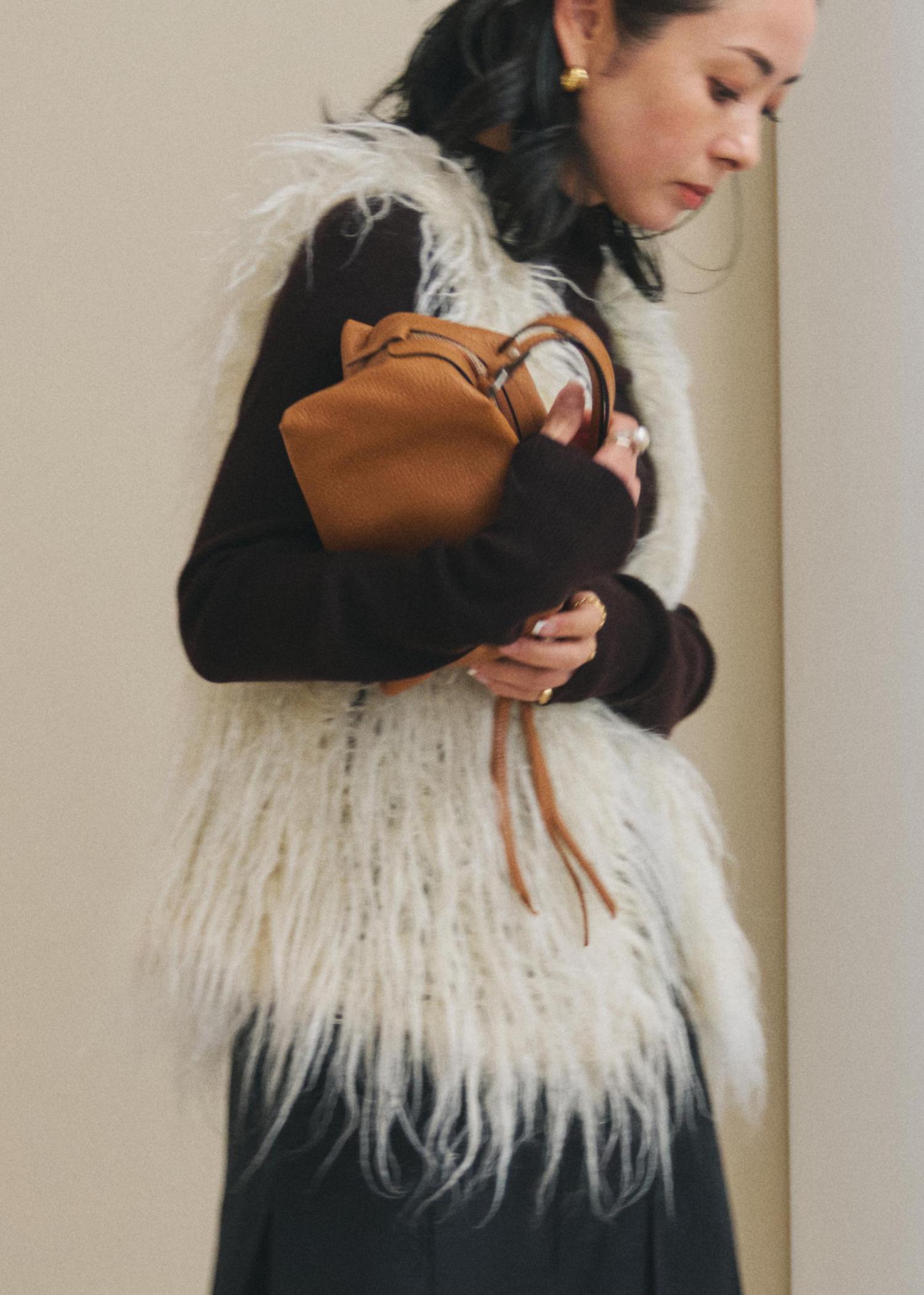SALON adam et ropéモヘヤロングシャギーハンドニットベストオフホワイト / F¥29,700レビューアルパカの膨らみを丁寧にブラッシングしているので薄手なのにボリュームがあるように見えるニットジレ。インナーには薄手のニットだけで暖かい。コートを羽織っても、シャツと合わせて梅春のシーズンも。スタイリングのバリーションが楽しめるアイテム。パネルスカートを合わせて華やぎをプラスしてみました。