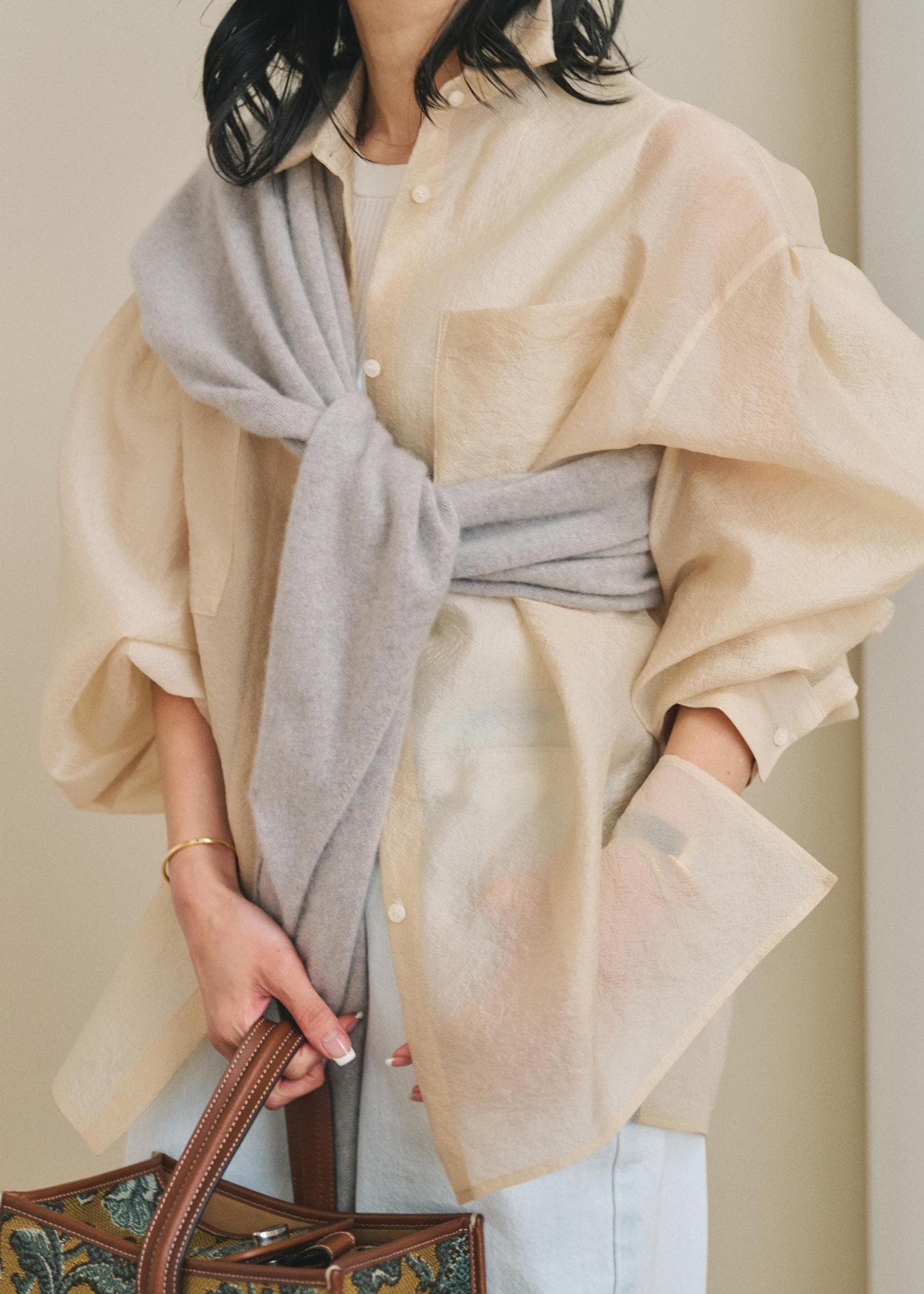 ROPÉ SELECT【一部店舗限定】【REALM(レルム)】SLEEVE VOLUME SHEER SHIRTS|シャツベージュ / 38¥31,900レビュー大人の肌を美しく見せてくれるシャツ。色のトーン、ハリツヤが上がるようなそんな色が魅力のベージュ。素材は中空糸を使用していることもあり、オーバーシルエットなので羽織としても外との空気を遮断し夏は涼しく、冬暖かいのが魅力。前後差あり、サイドのスリットもポイントなのでアウトのスタイルもおすすめです。