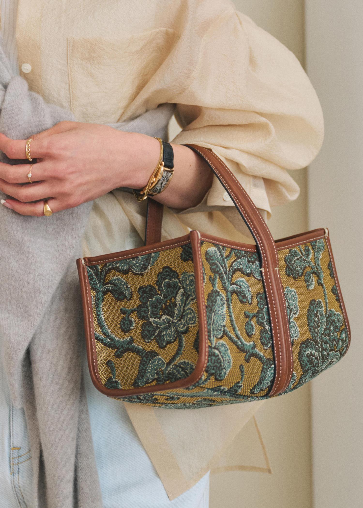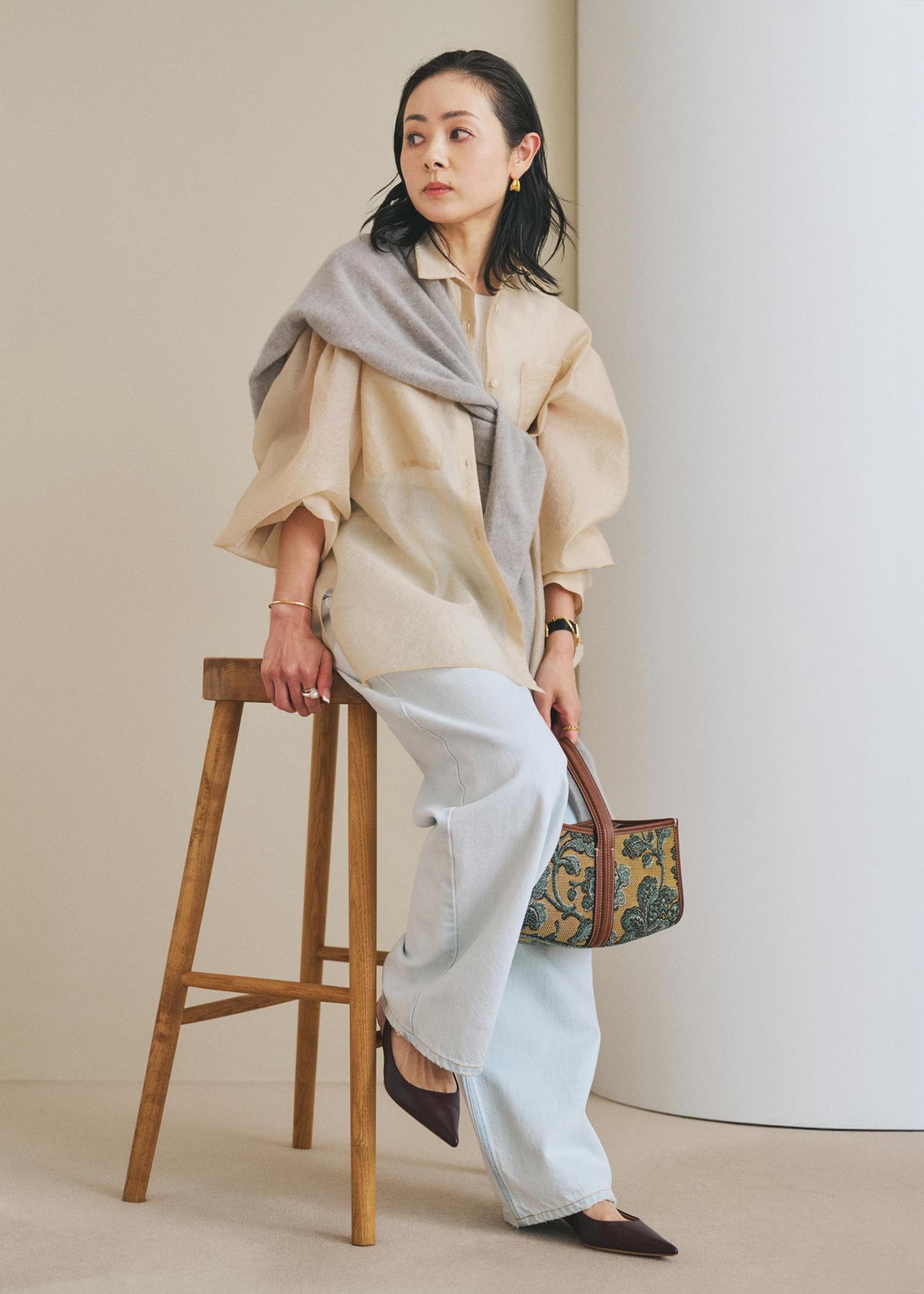バッグはA VACATIONの新作、「SEE SAW」。moi salon et ropé の直営店のみの展開。ベージュのトーンをさらに引き上げてくれる合わせの色もお気に入り。