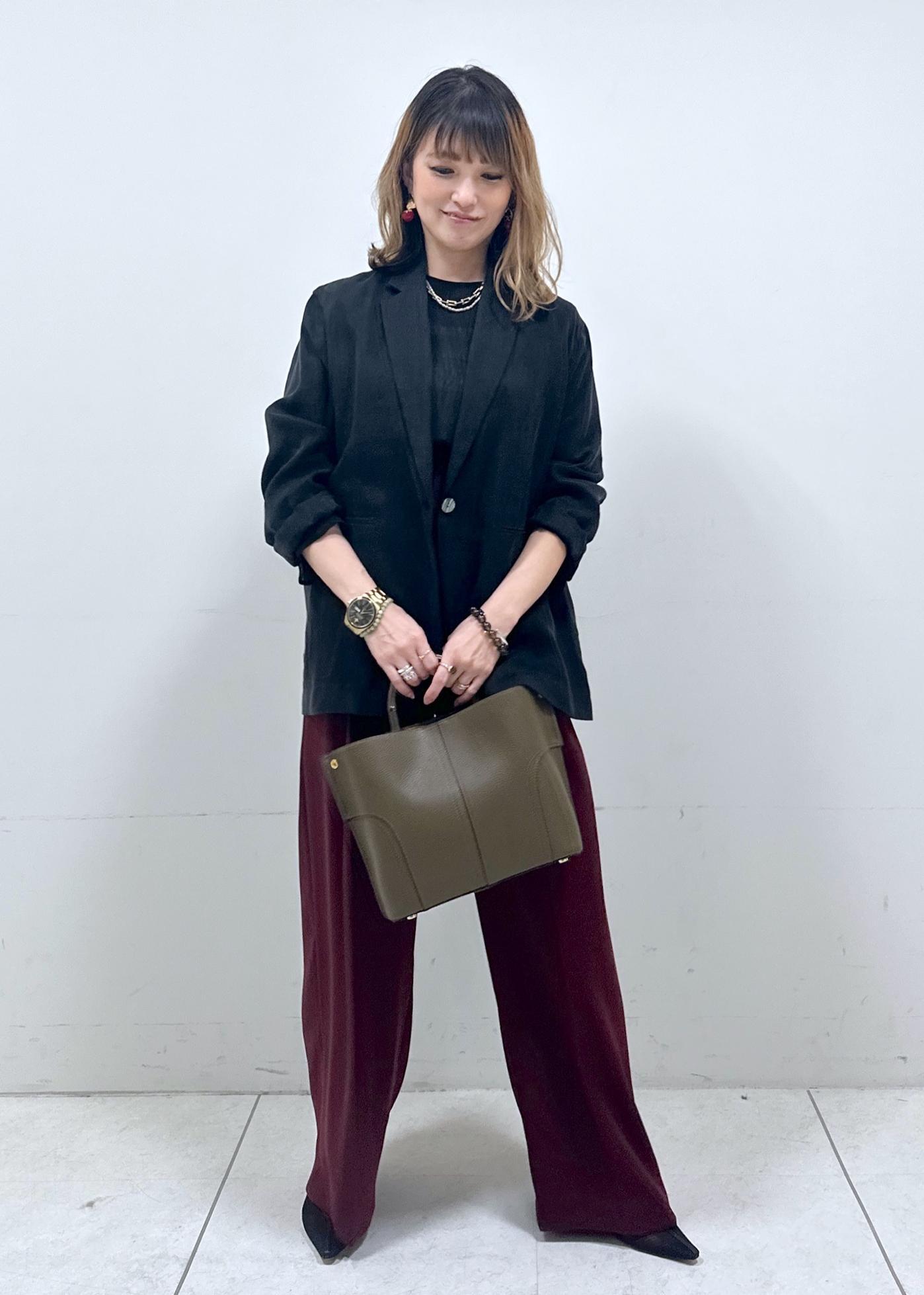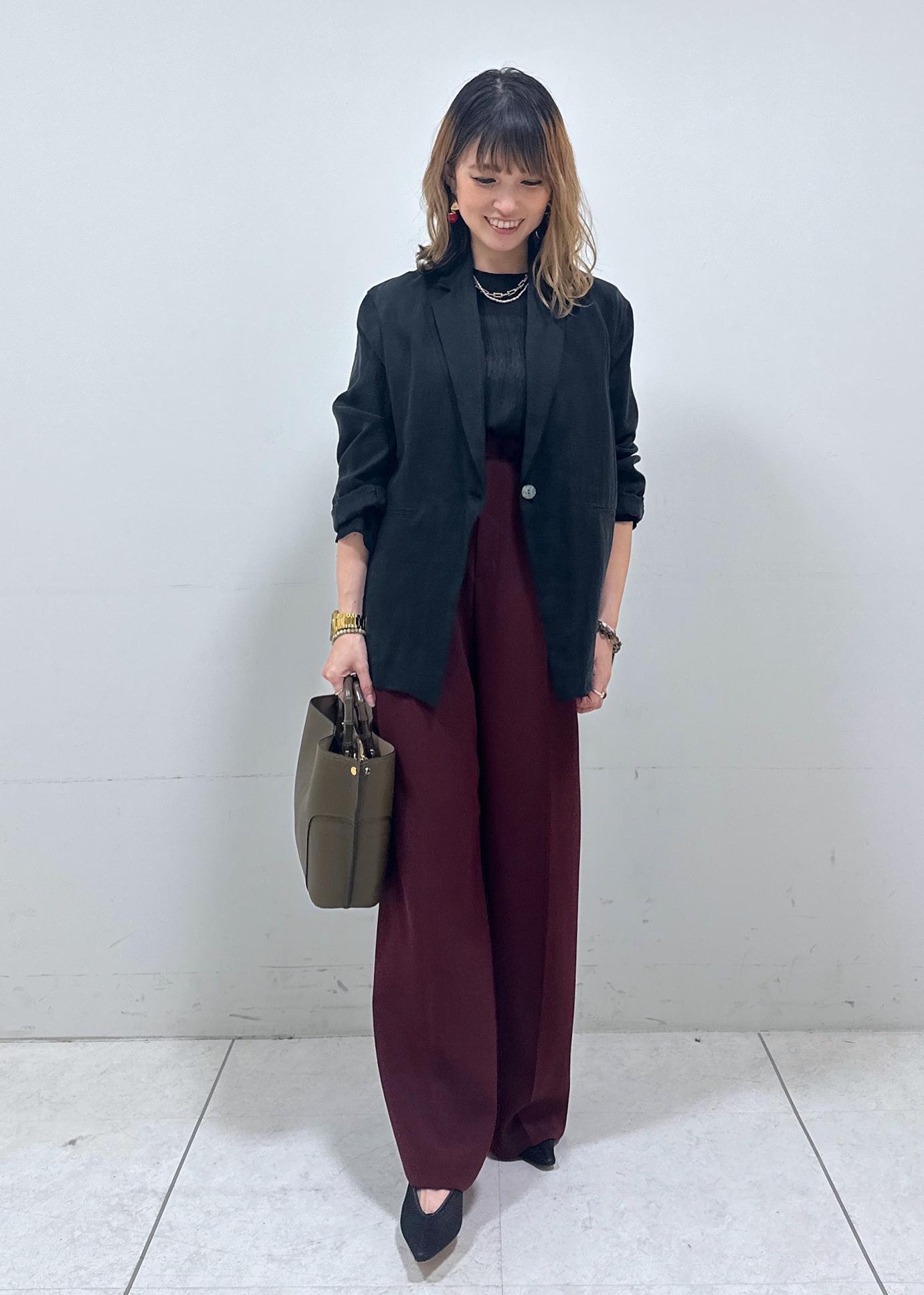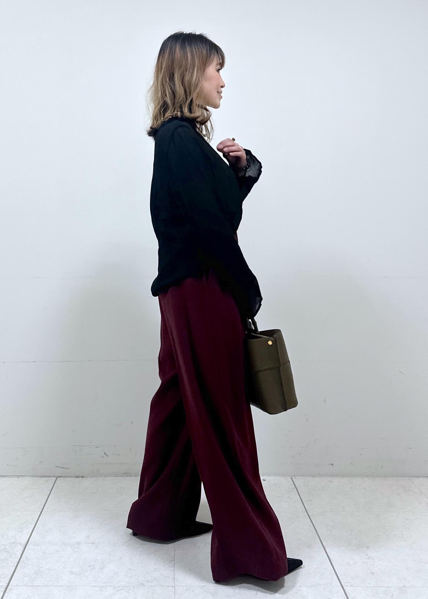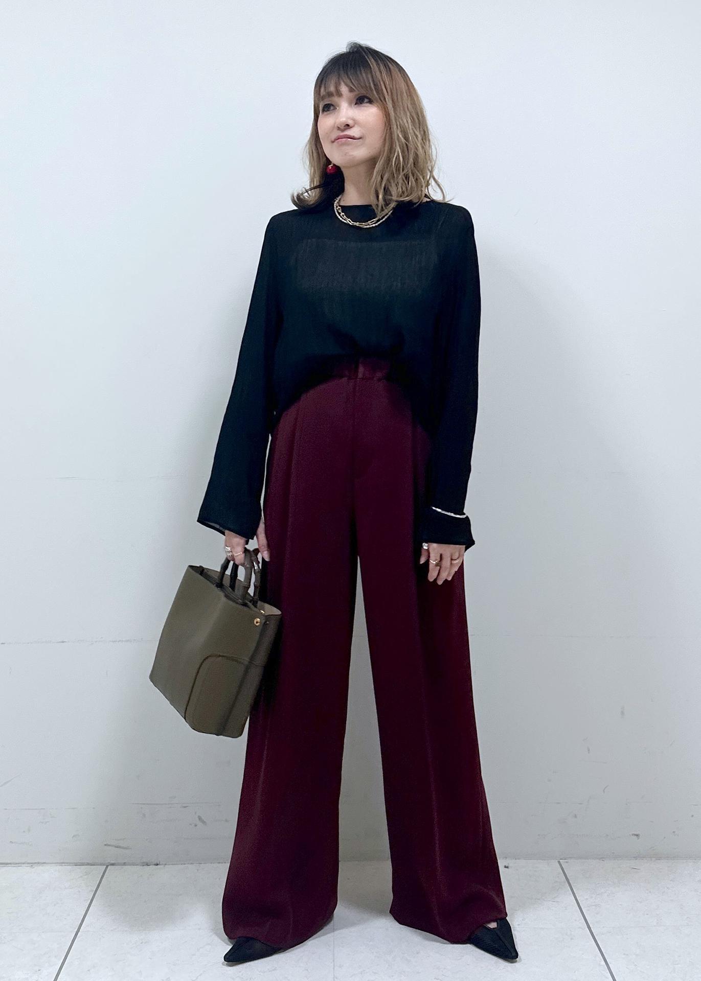 シアー感のあるブラックを、秋らしいカラーのボルドーと合わせました!