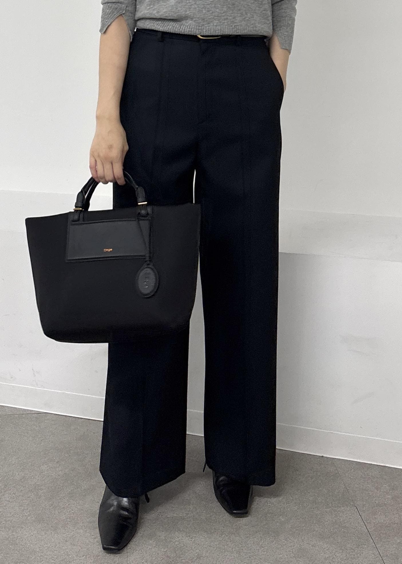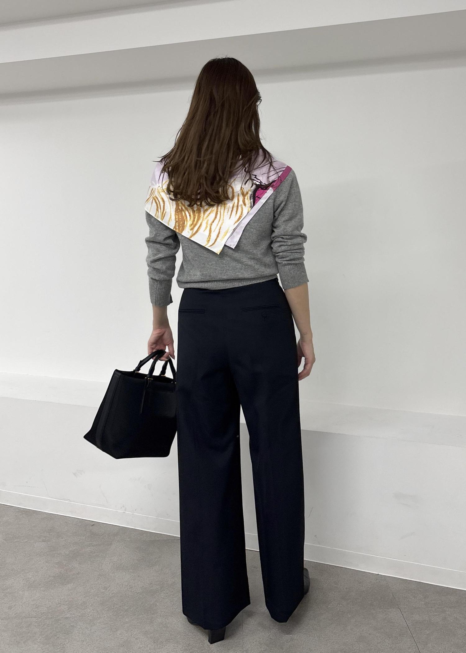 ROPÉ梳毛ギャバ プリーテッド ワイドパンツブラック / 38¥29,700レビュータック無しのシルエットが綺麗なパンツ。ウール100%で暖かい着心地かつ、表面は起毛感無く肌あたりも滑らかです。程よく艶感もありシーズンの幅も広く合わせられると感じました。全体のサイズ感はジャスト。ウエストは後ろ側のみゴムで前側はぴしっと見え。骨盤が広めの体型ですが窮屈感は無く、着丈は私の身長でかかとから1cmほど上あたり。