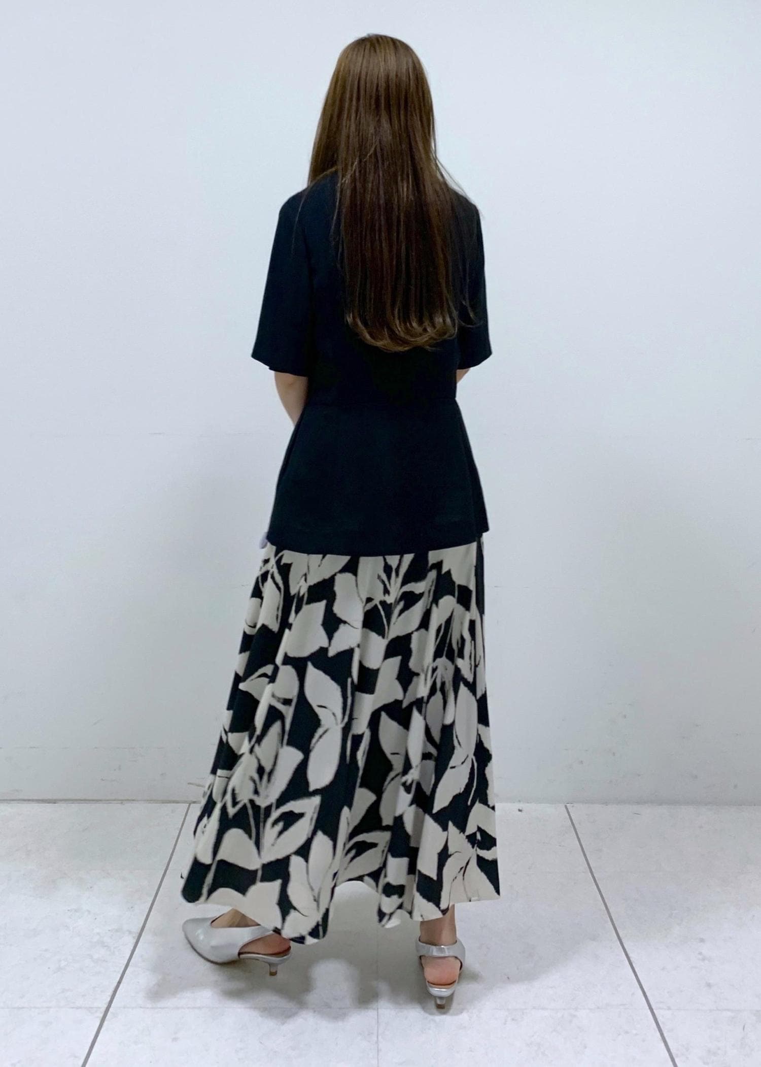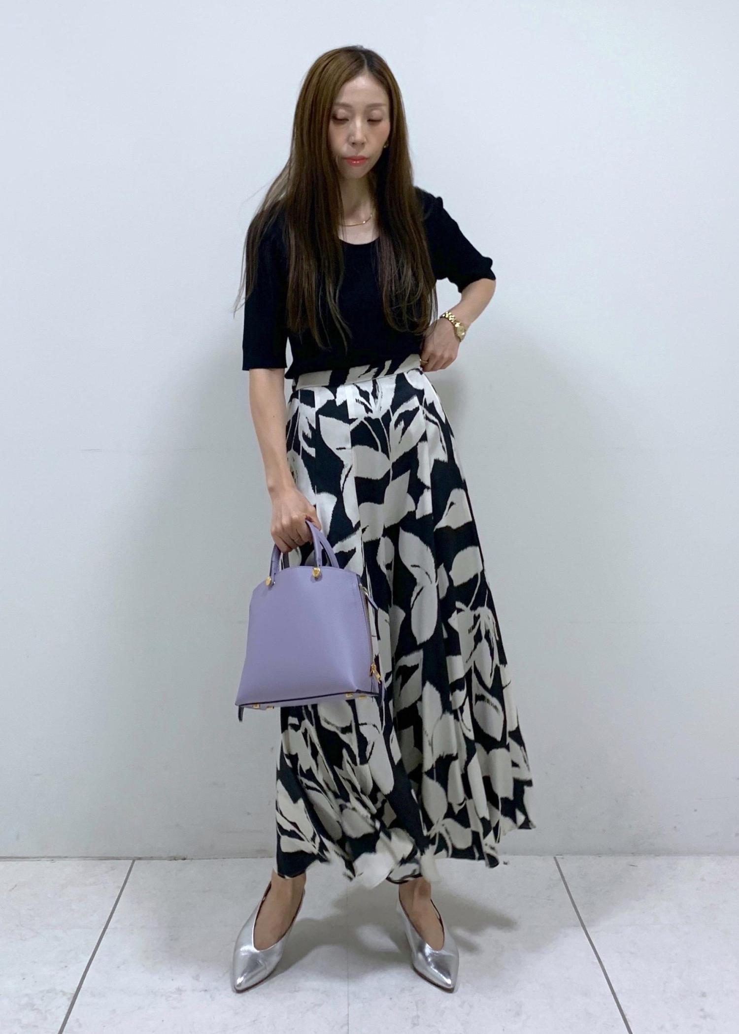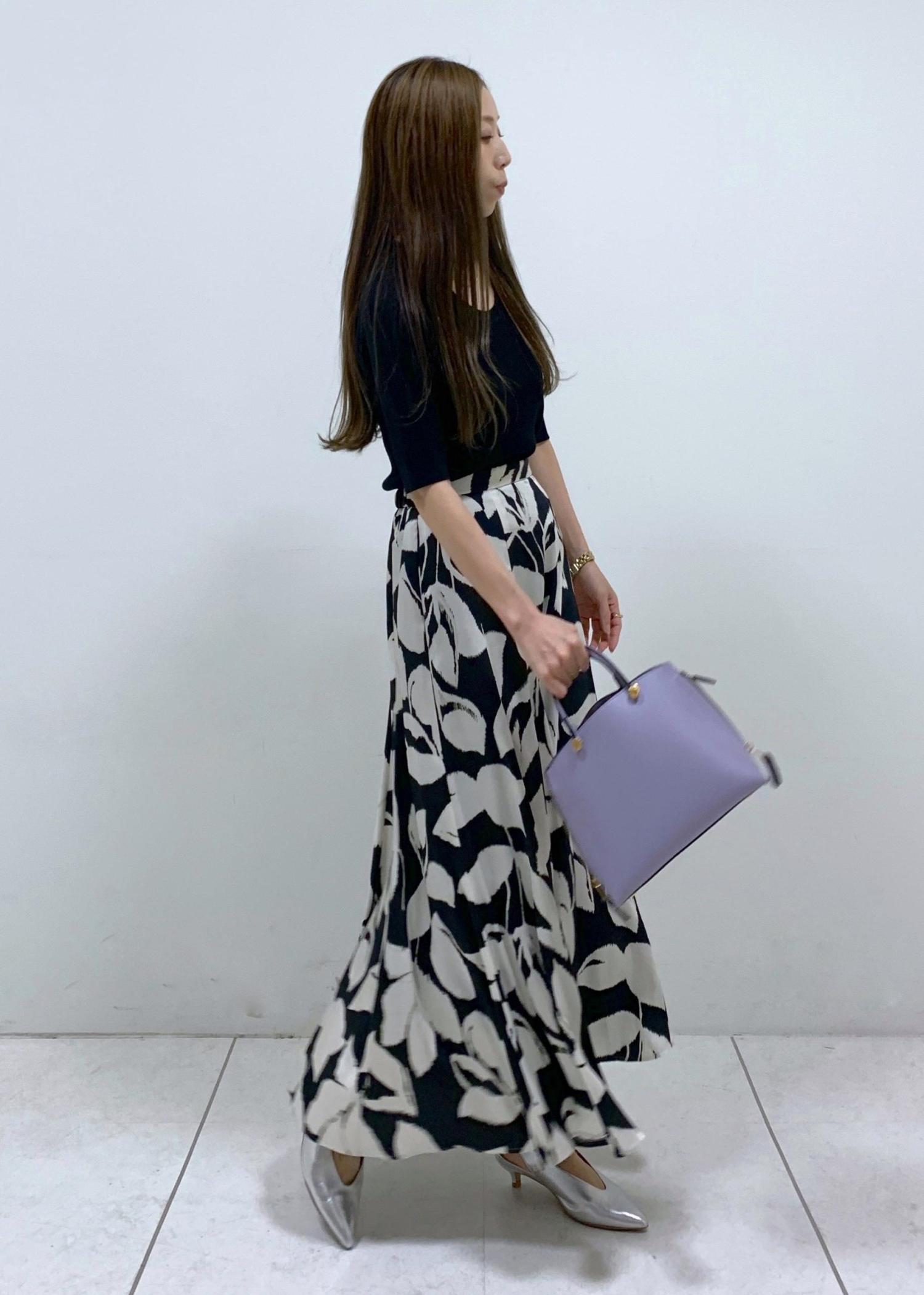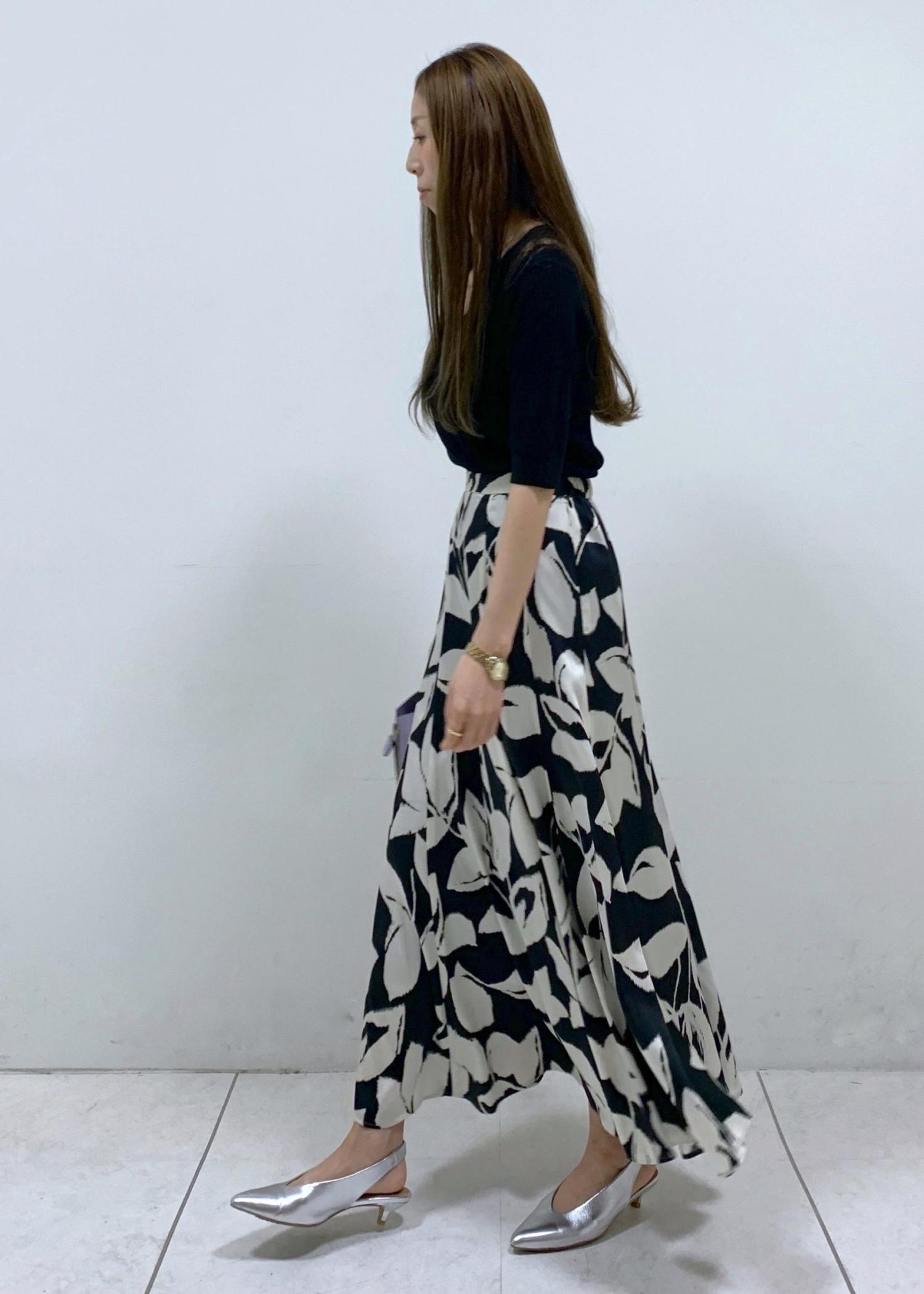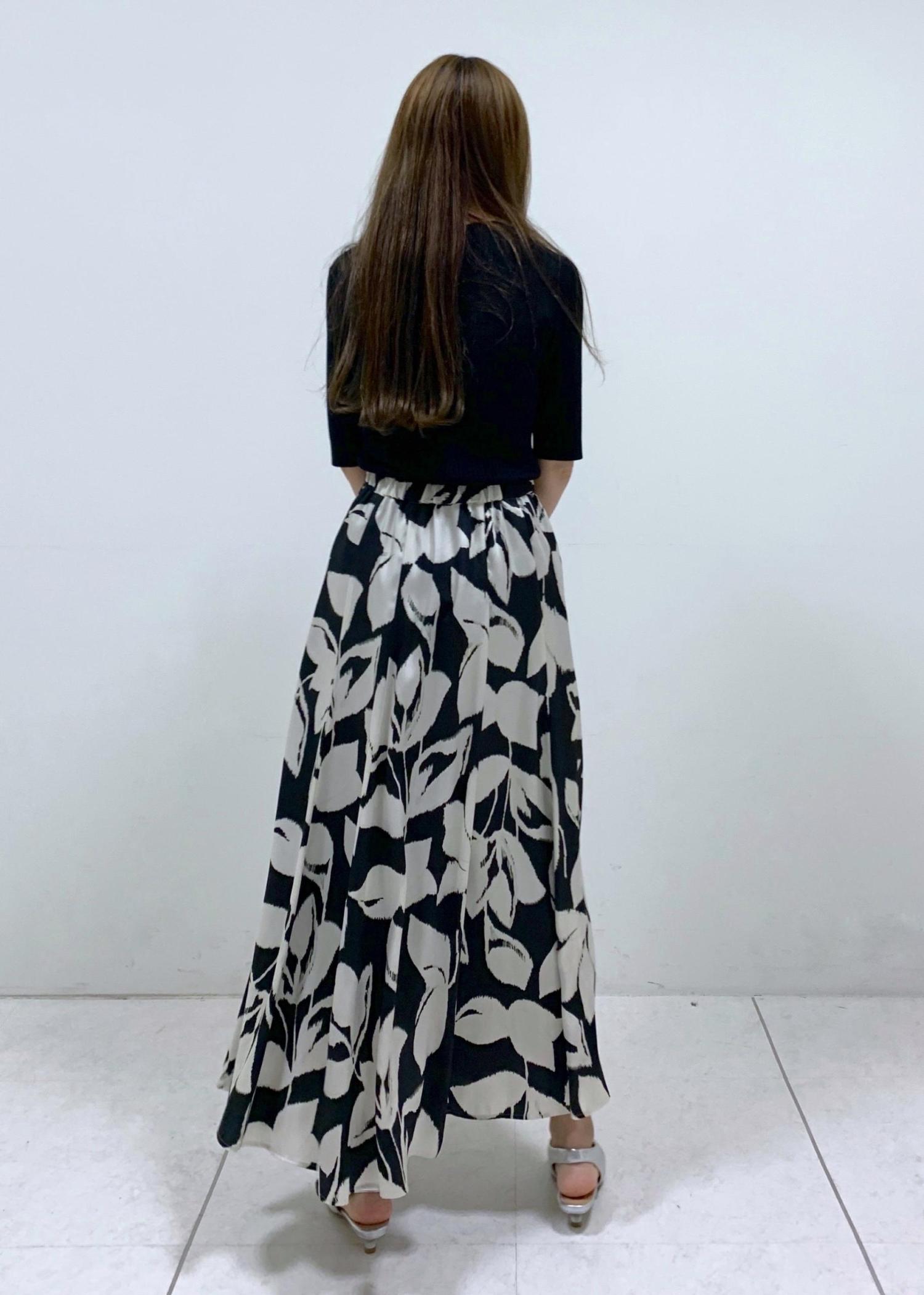 華やかなデザインが目を引くフレアスカートで、モノトーンはカラートップスとも合わせやすいです。