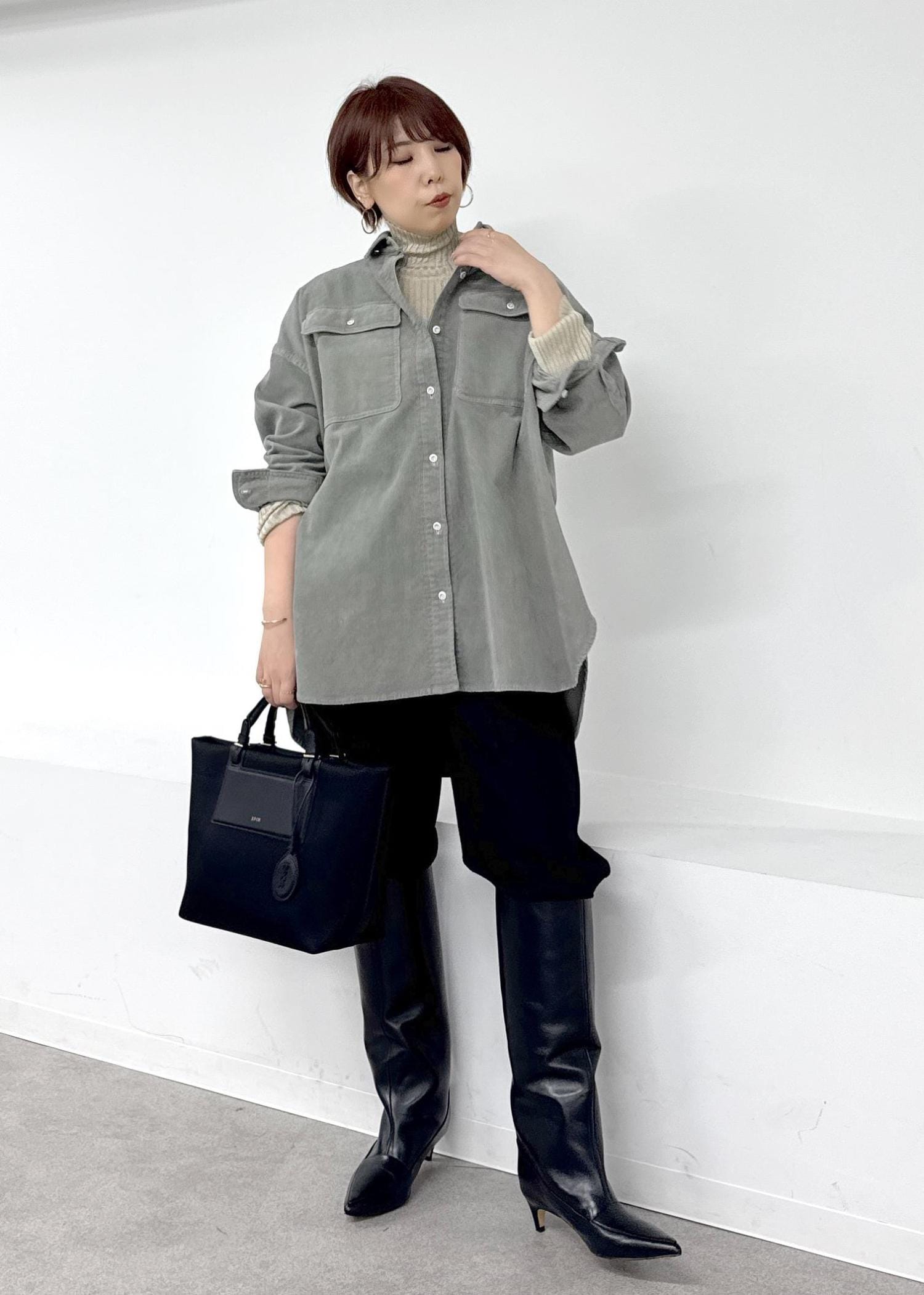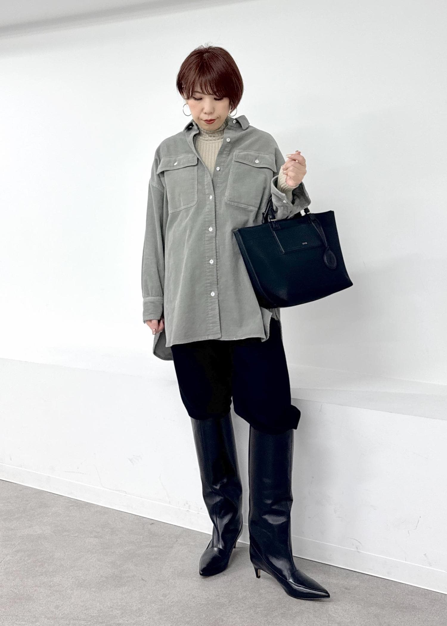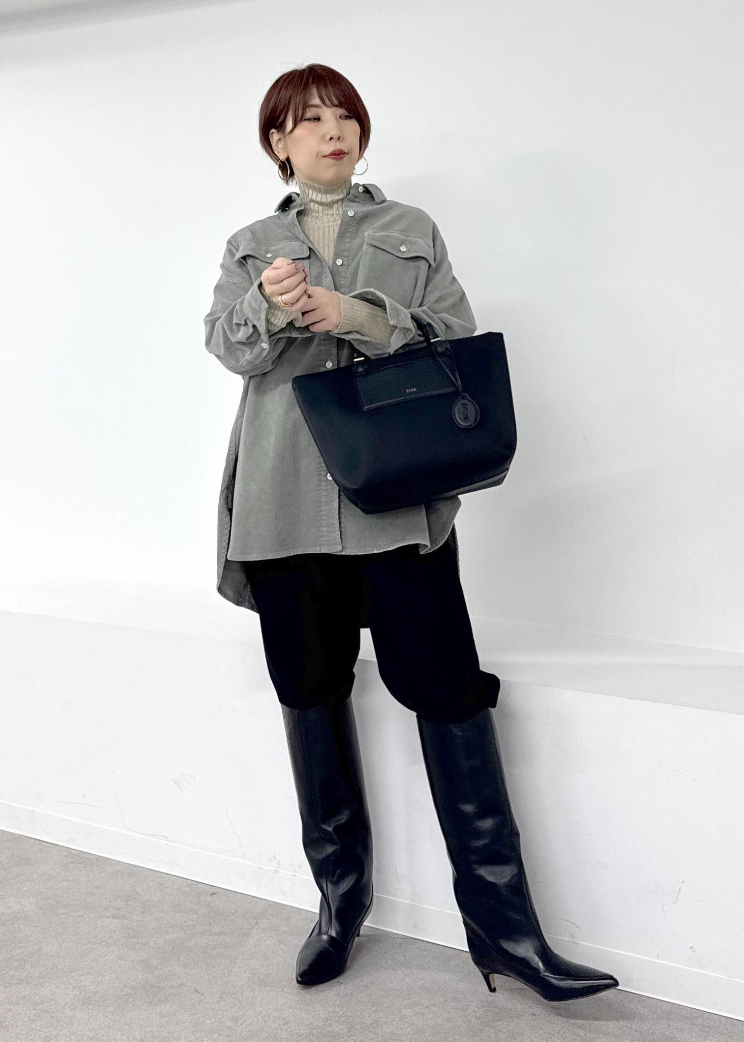 メンズライクな印象ですが、ロングブーツと合わせて女性らしさをプラス♪
