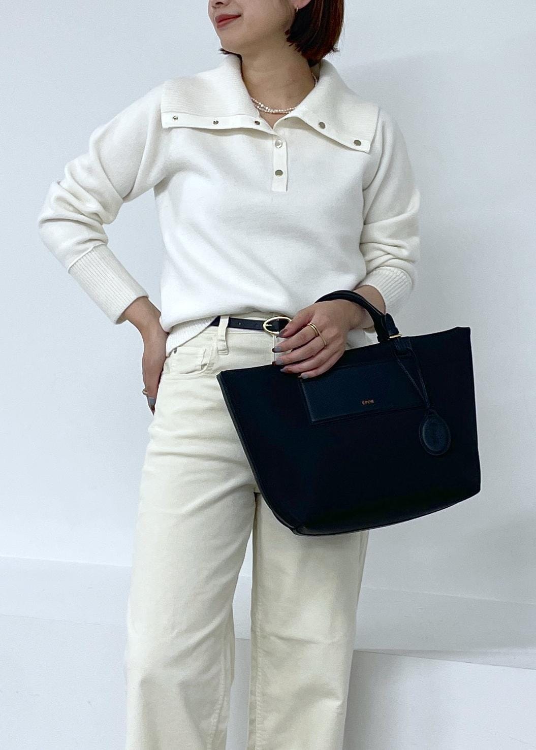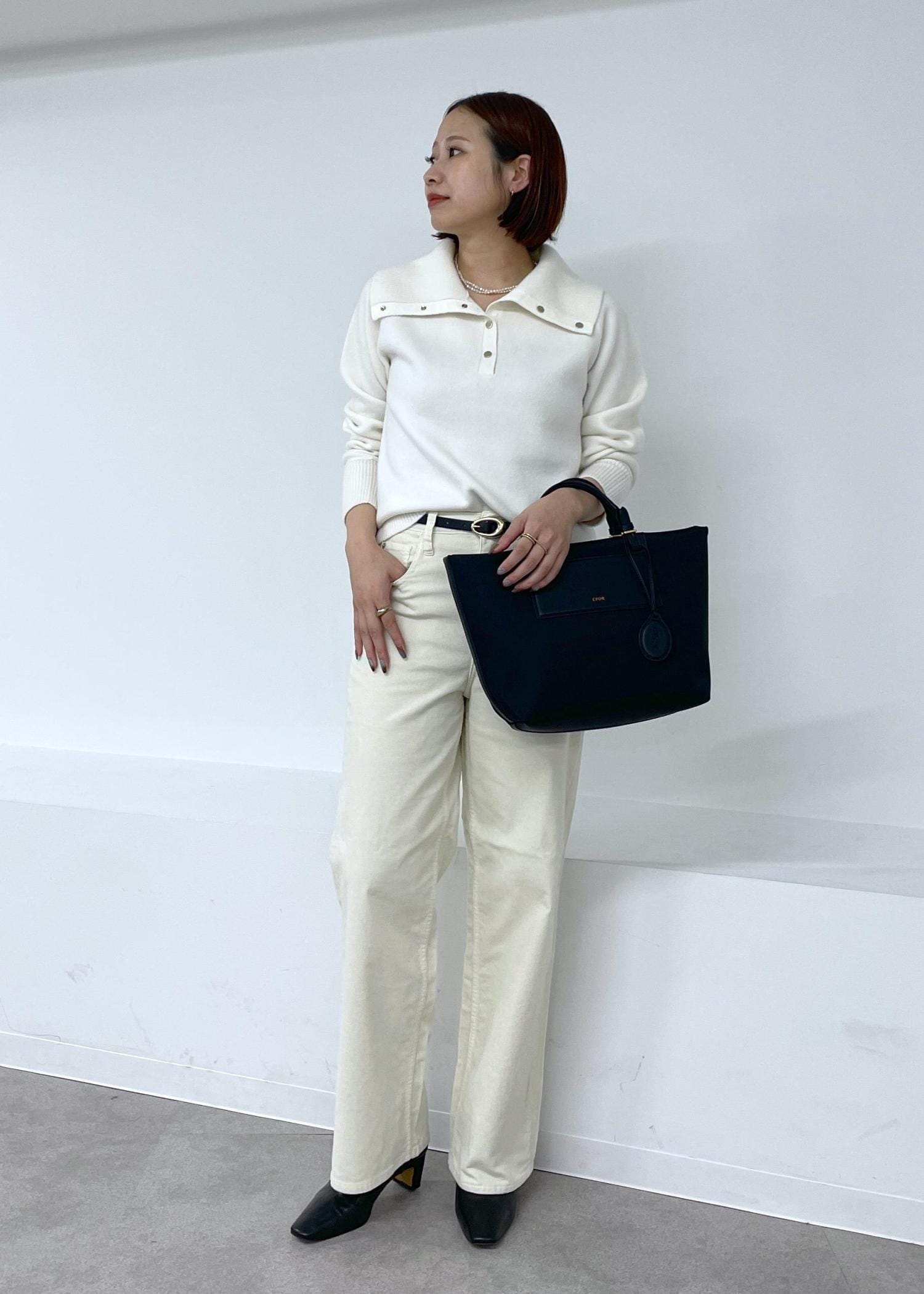 ROPÉ接結ウールドットボタンハイネックニット/イージーケアオフホワイト / F¥28,600レビューゆったりとした身幅ですが丈感はコンパクトなのでボトムを選ばず合わせることができます!デザイン性のあるトップスなので着るだけで主役になるニット。