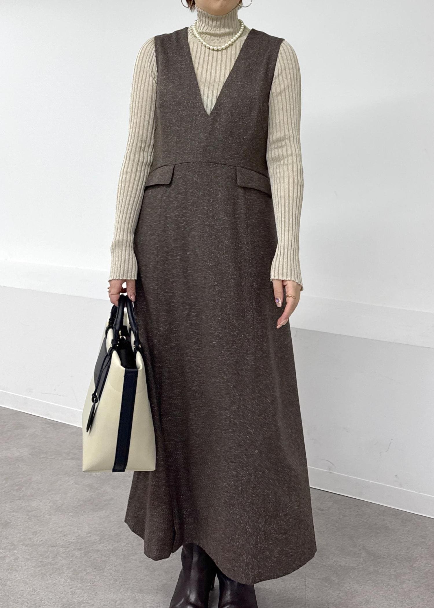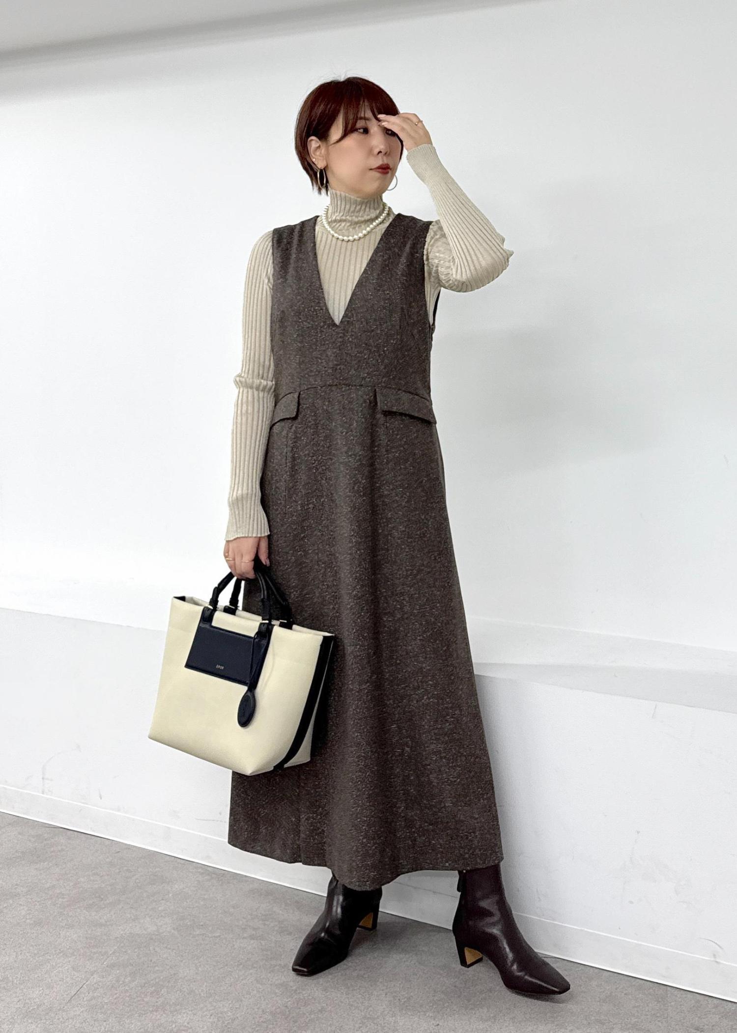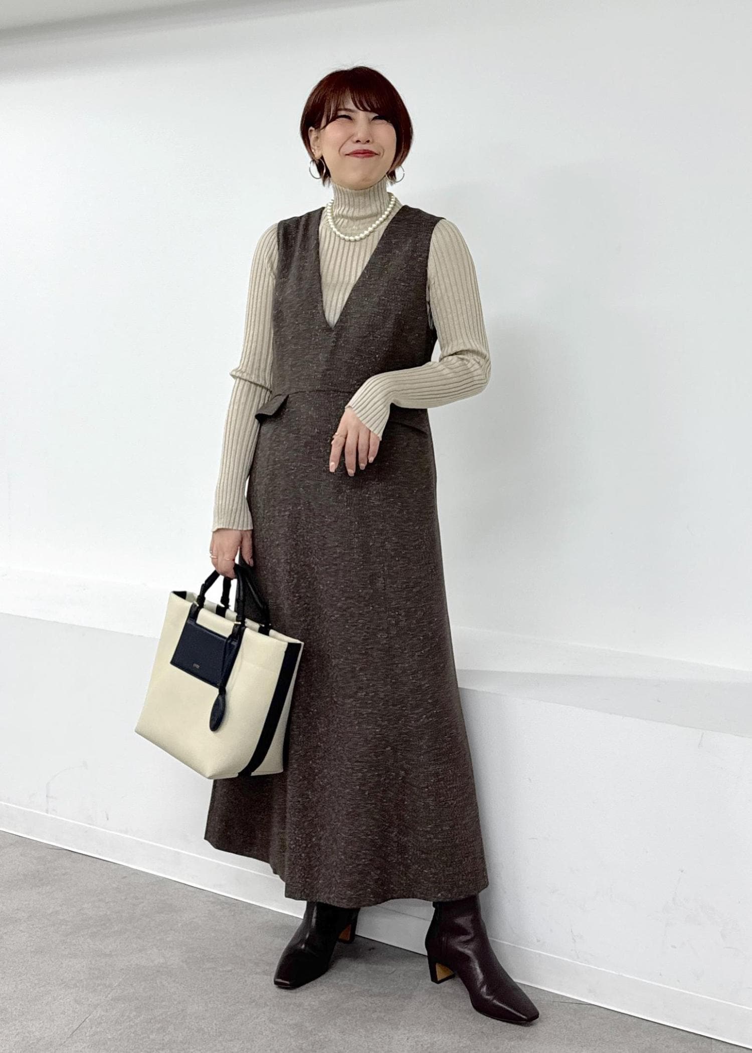ROPÉスノーツイードジャンパースカート/イージーケアブラウン / F¥30,800レビュー深めのVネックで大人っぽい印象のジャンパースカート。ワンサイズですが、ウエストやアーム部分には