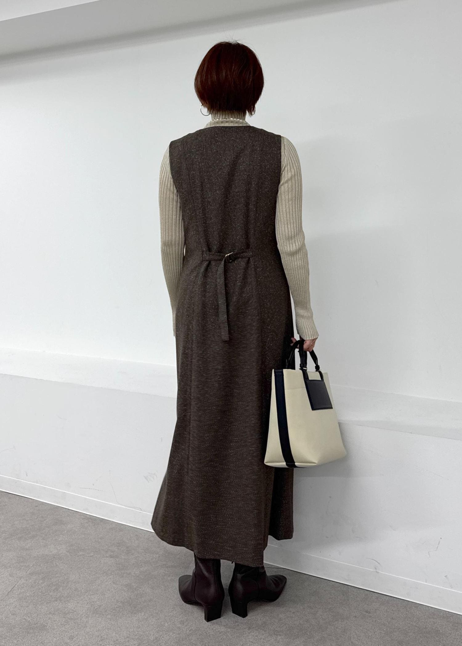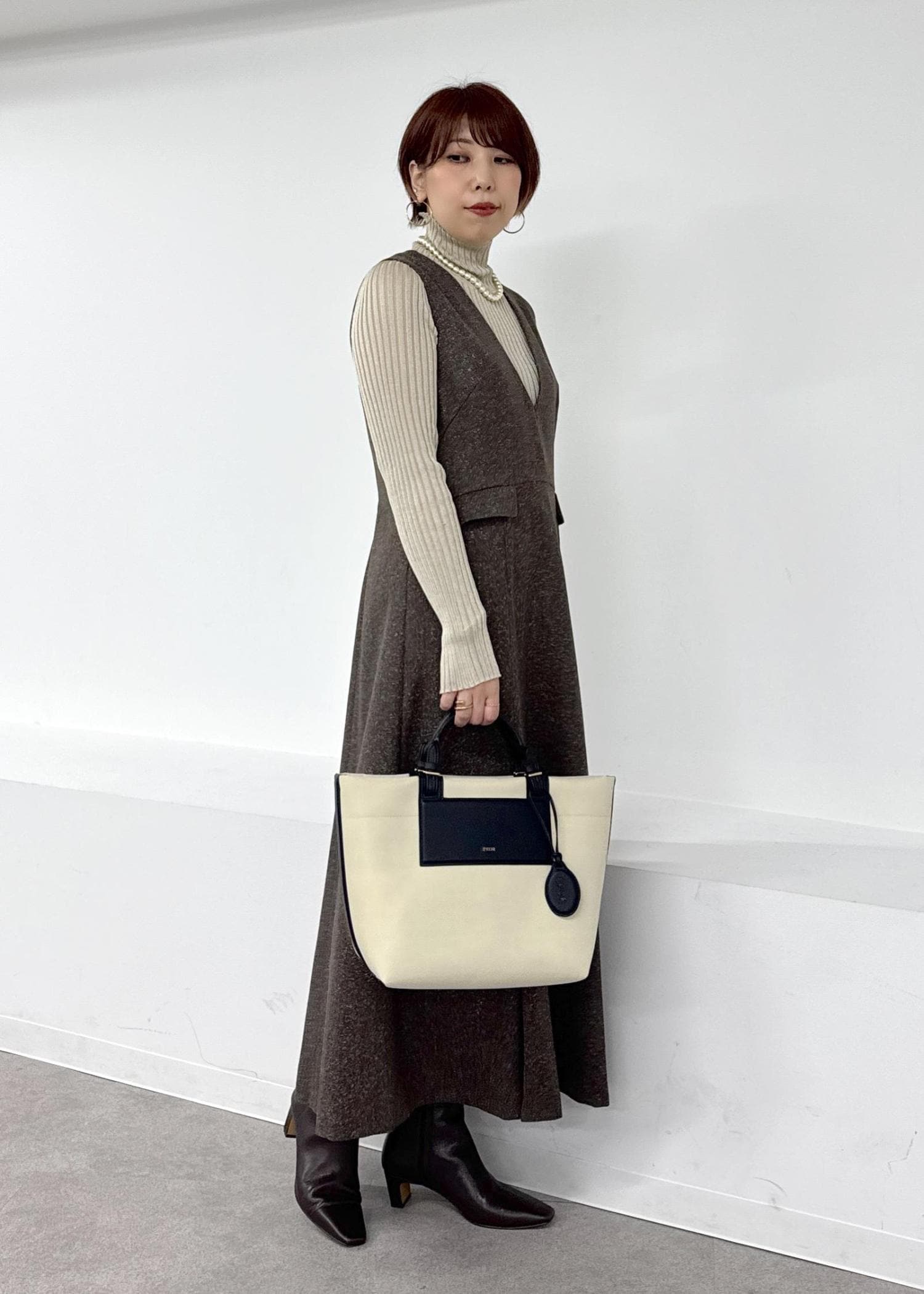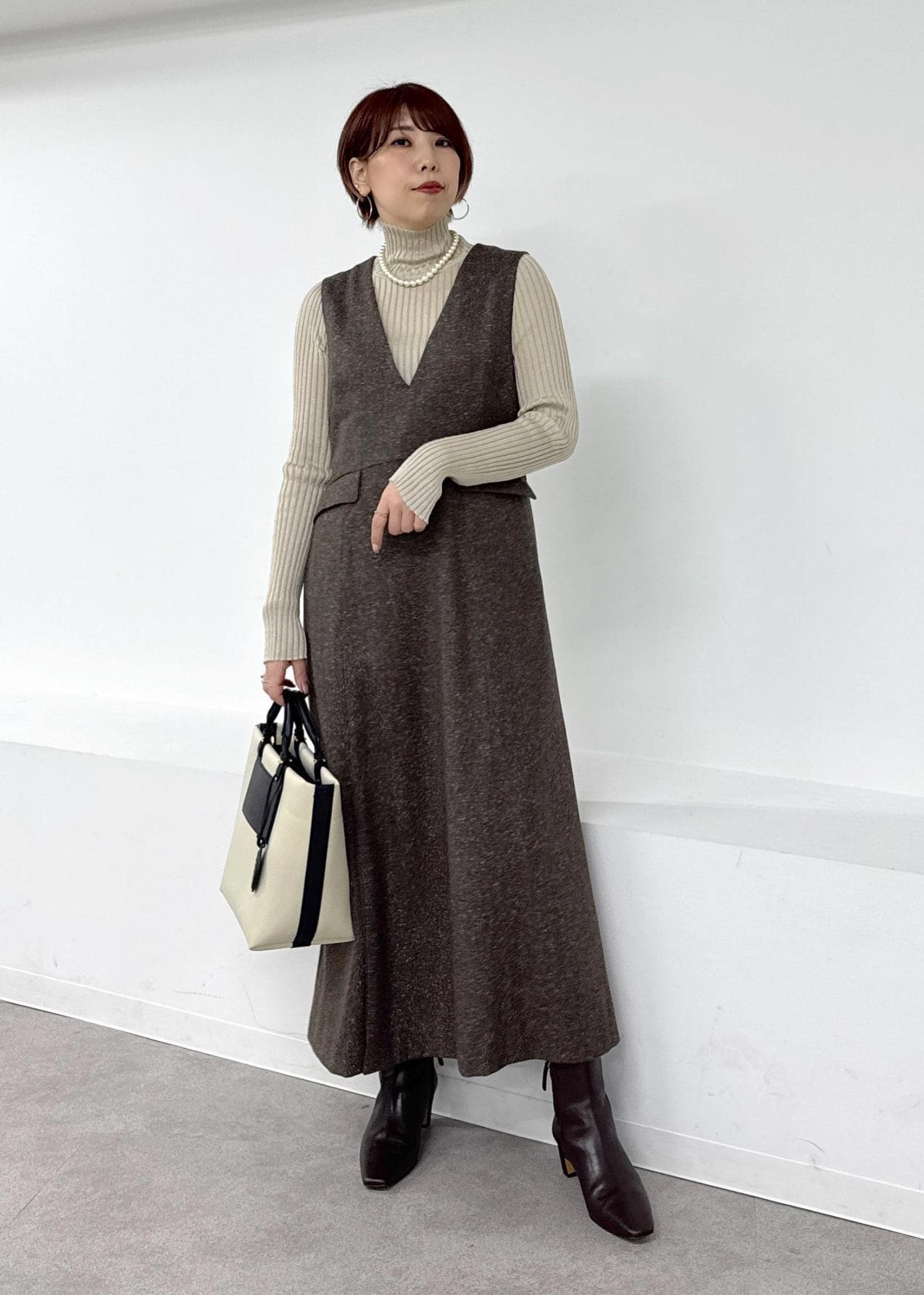 ROPÉスノーツイードジャンパースカート/イージーケアブラウン / F¥30,800レビュー深めのVネックで大人っぽい印象のジャンパースカート。ワンサイズですが、ウエストやアーム部分には