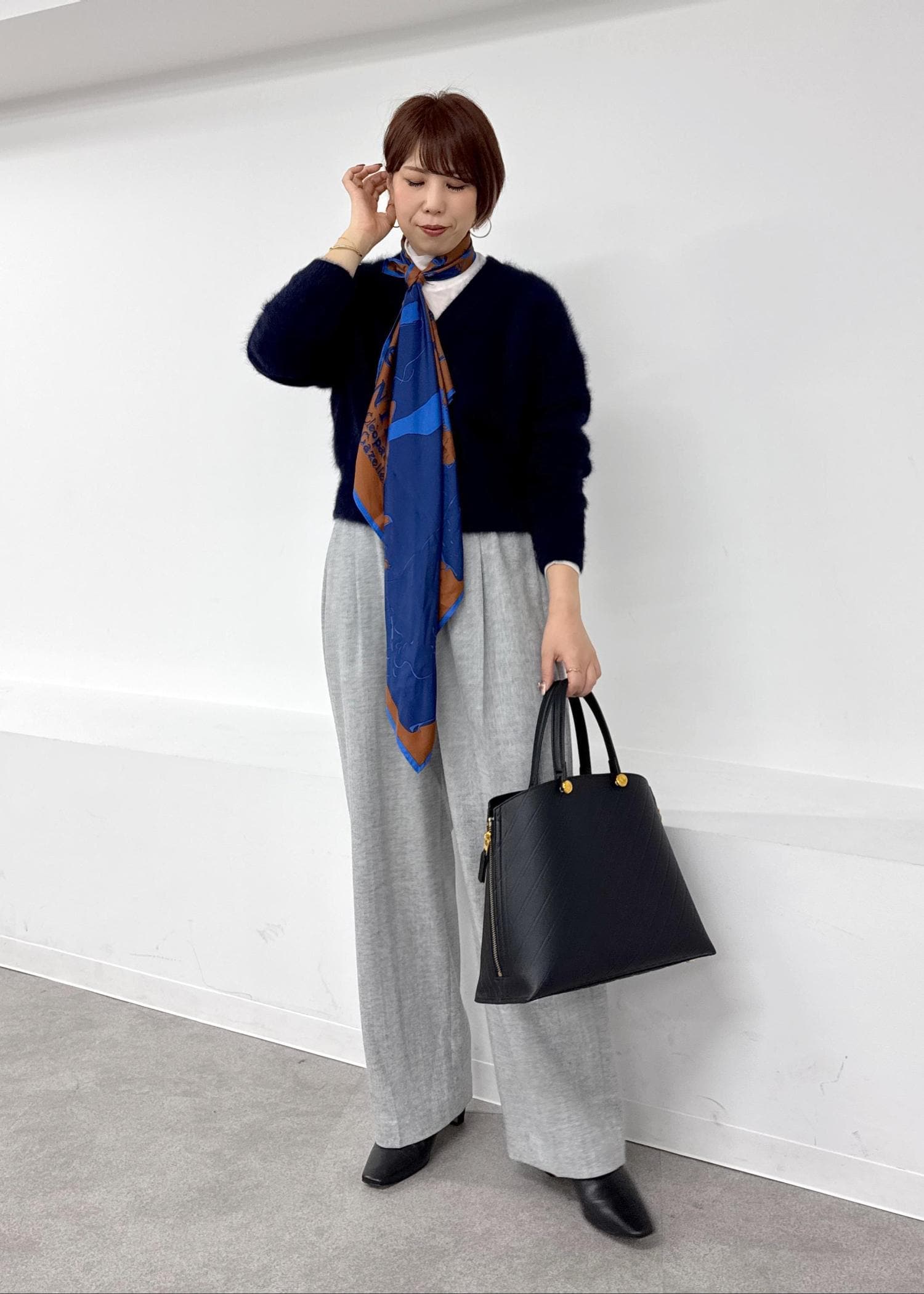 シンプルな服装に華やかなスカーフをプラスしたコーデ。