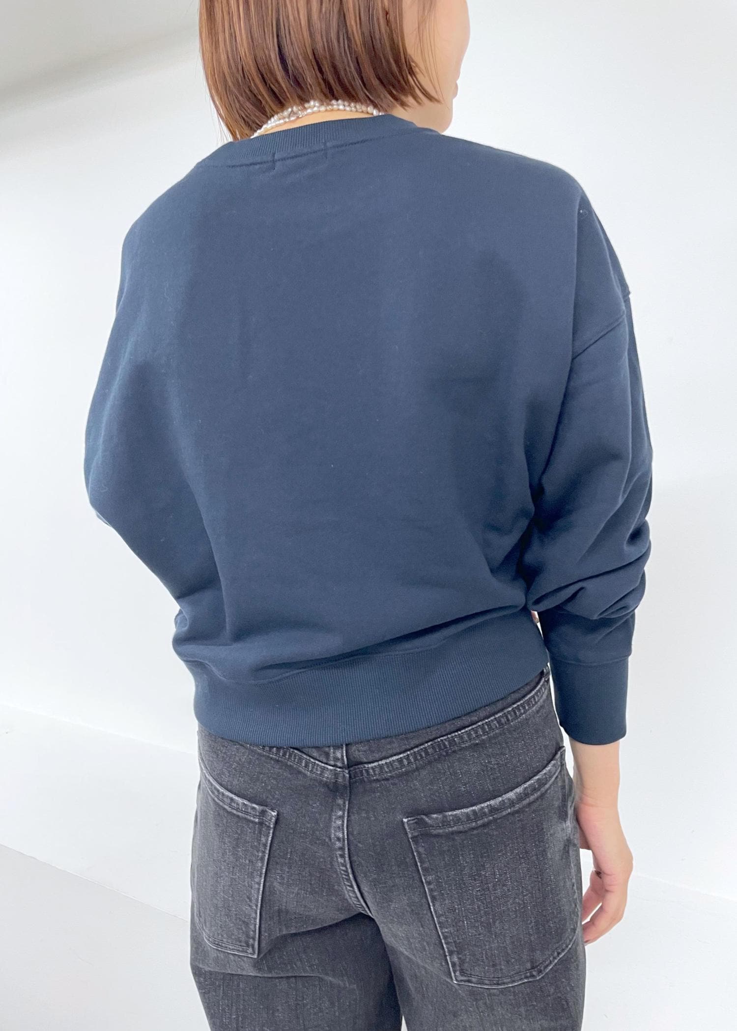 着丈はショート丈なので骨盤あたりです。全体的にサイズ感はコンパクトですが薄手のニットをインナーに着ても窮屈感なく着ることができました。ボリュームスリーブのアイテムだと少し腕周りはキツく感じるかもしれません。 -