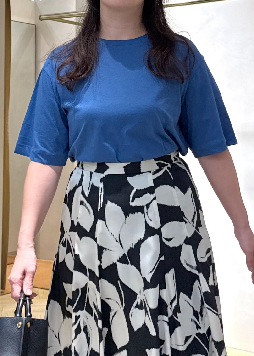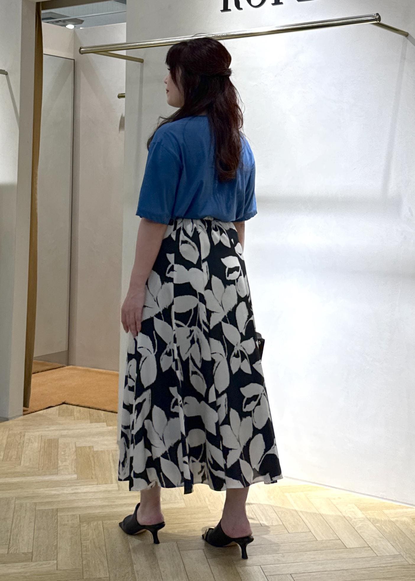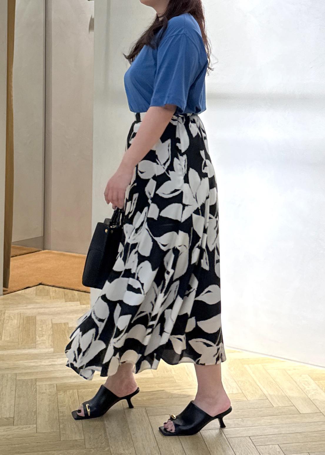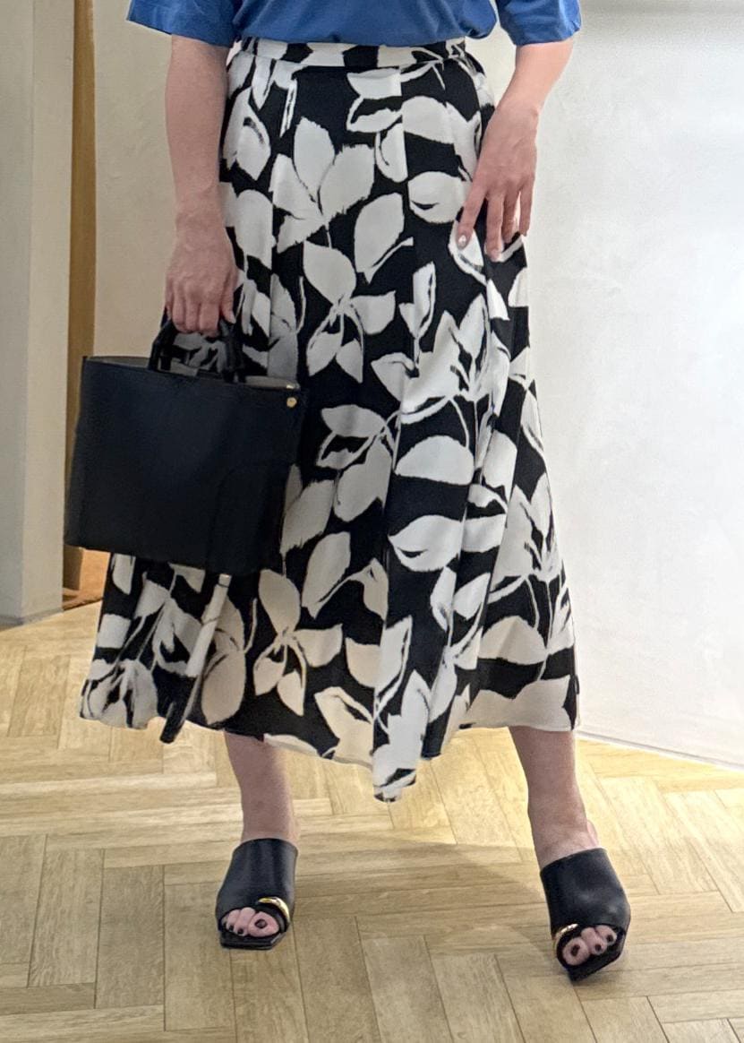 カジュアルになりすぎず華やかなプリントスカートとの相性も抜群です。