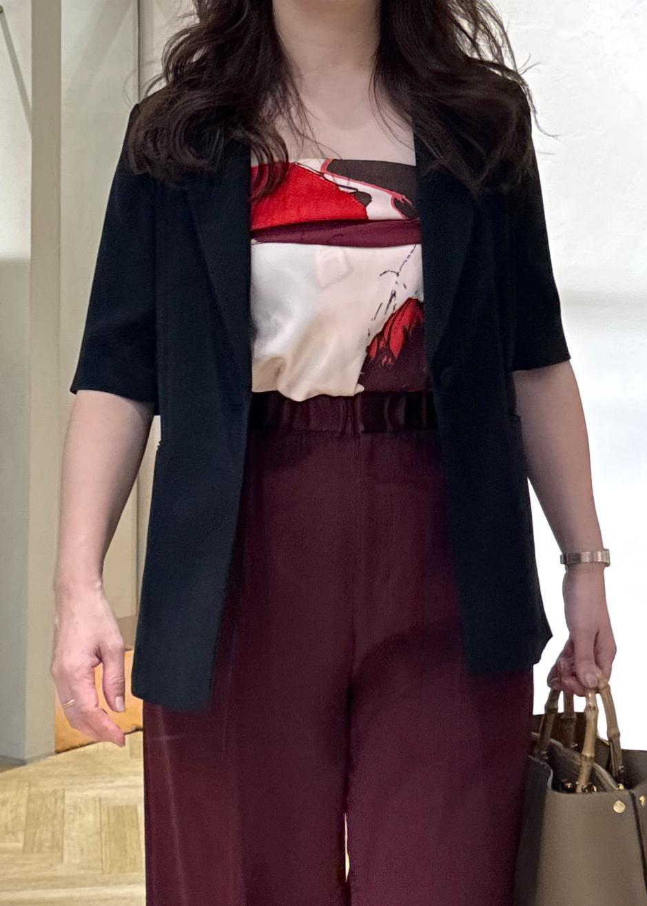 ジャケット、パンツはベーシックなのでトレンドのスカーフアレンジでワンポイントを出しました。