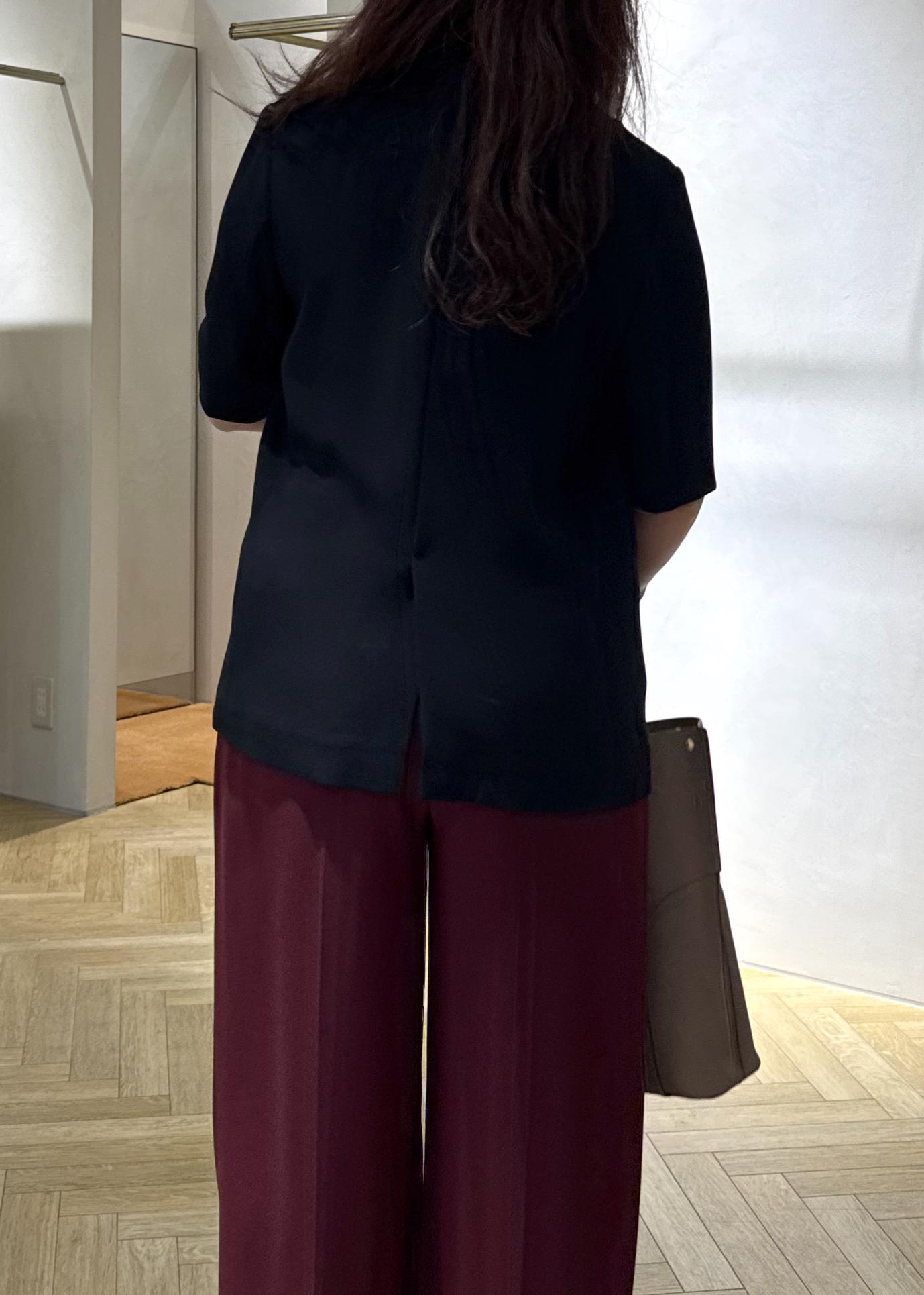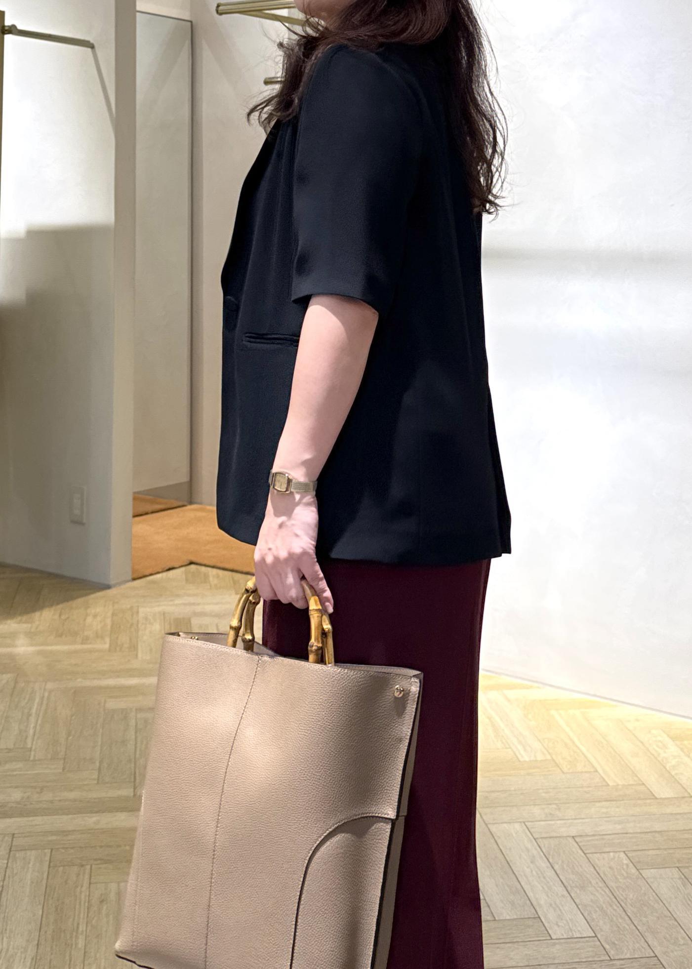 ROPÉ【洗える・カセット服・新色追加】トリアセバックサテン ハーフスリーブジャケット/セットアップ対応ブラック /¥31,900レビュー38サイズを着用しています。