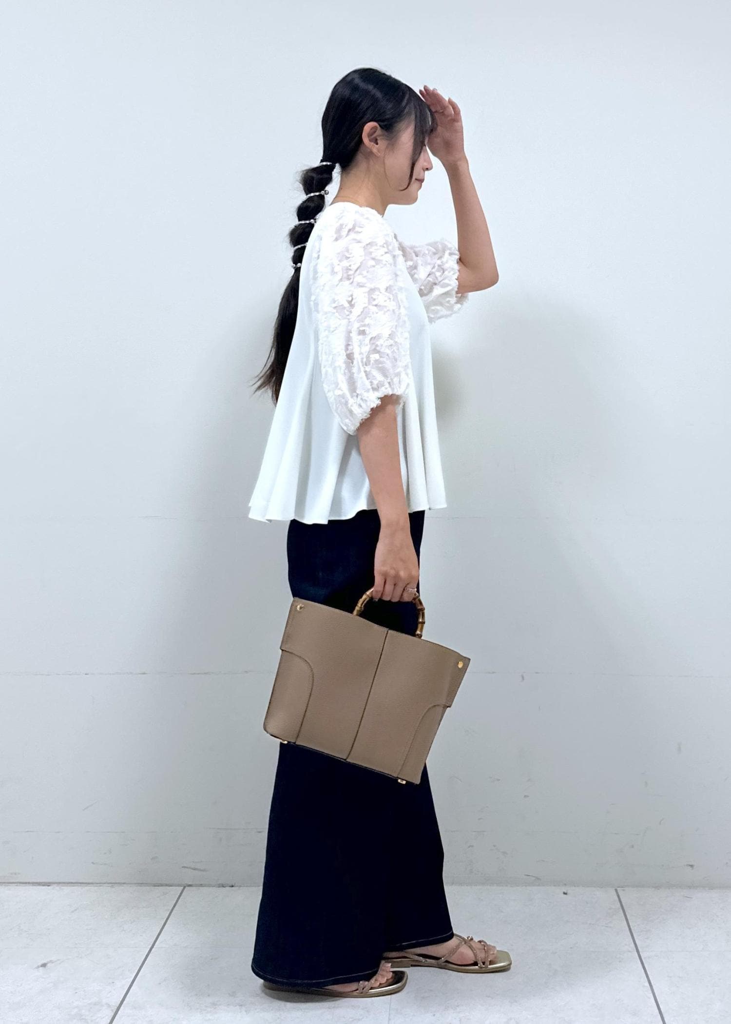 袖が少しシアーなジャガード素材で、膨れすぎないパフデザインです。