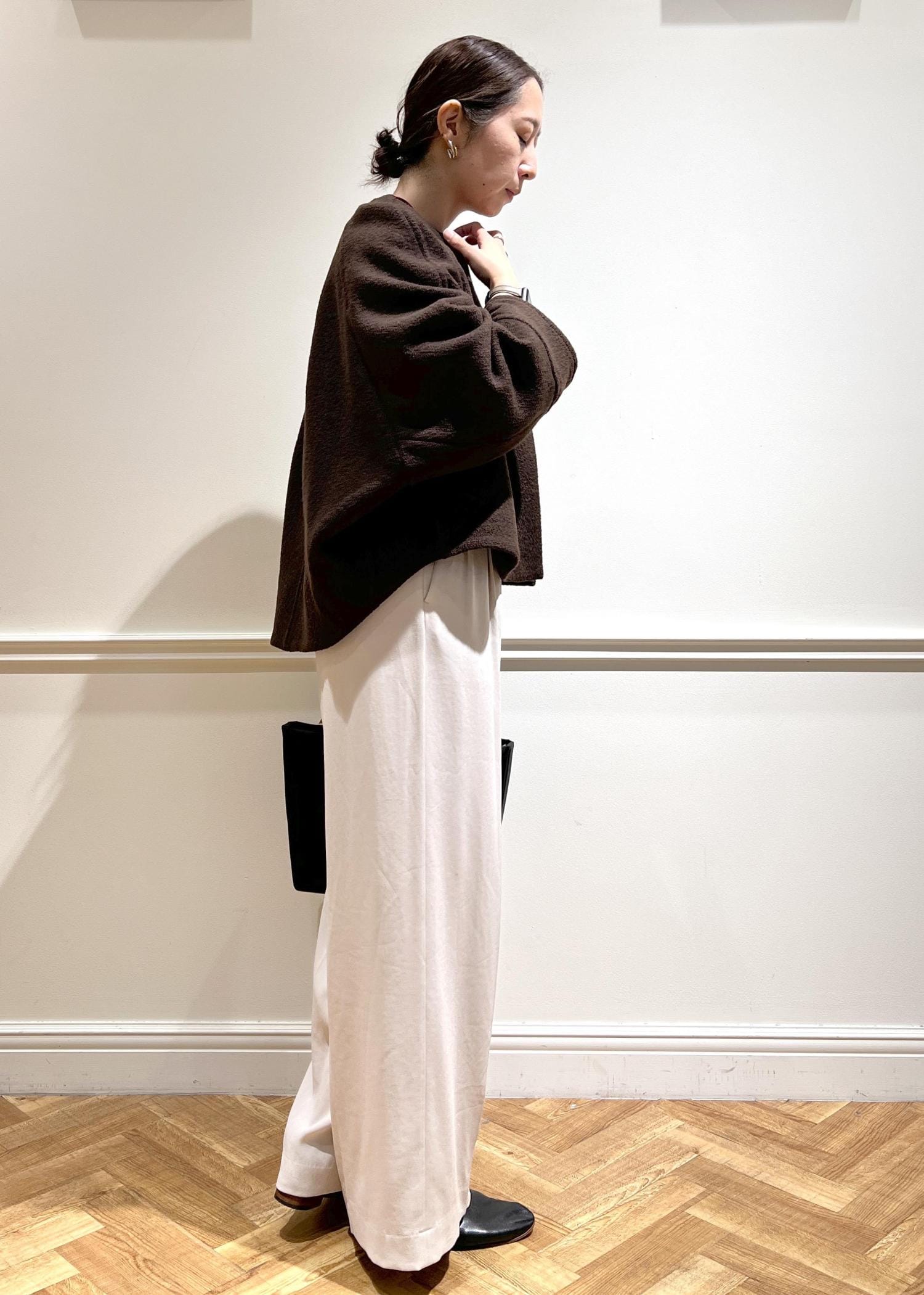 素材の光沢と落ち感がとても美しく柔らか。白いブラウス等で合わせると少しあらたまる席でもお使いいただけます。 -