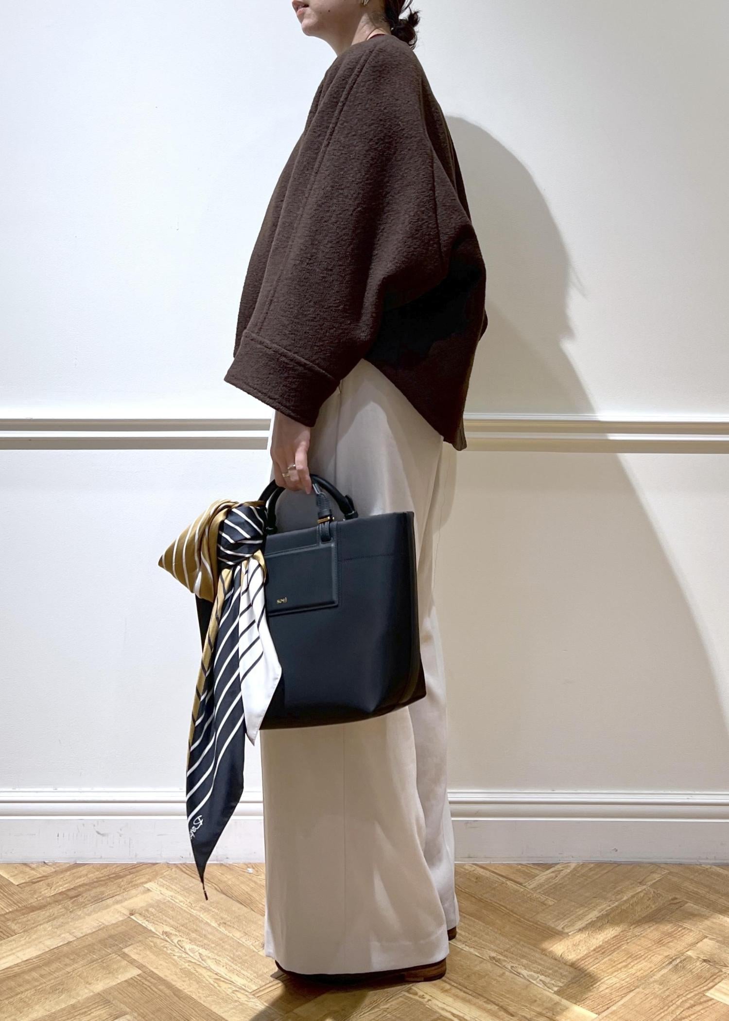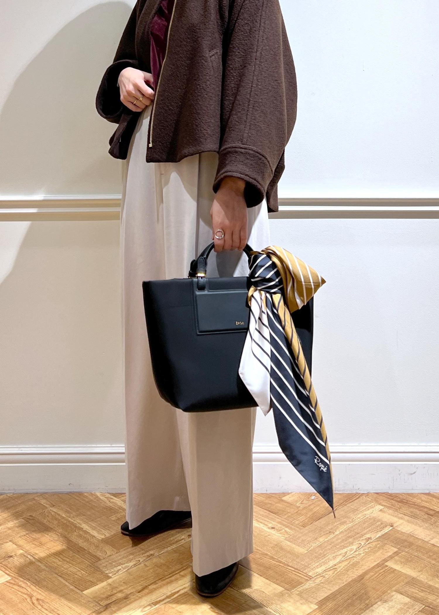 ROPÉストライプパターンシルクスカーフブラック / F¥17,600レビューコーディネートで、ブラウンとブラックが重たくなる時に合わせると、シルクの光沢と白の配色が全体を軽く仕上げてくれます。