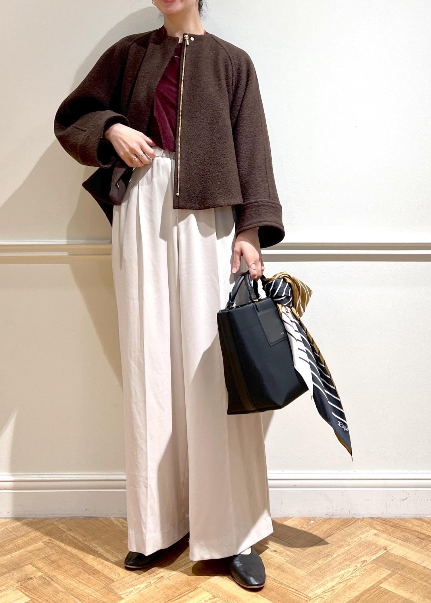 ショートコートで軽快にしつつフォルムの美しさが全体に動きを出してくれます。曲線的なデザインなので、合わせるボトムは直線(ストレートパンツやタイトスカート等)という選び方は簡単ですっきりしたスタイルになるのでおすすめです♪