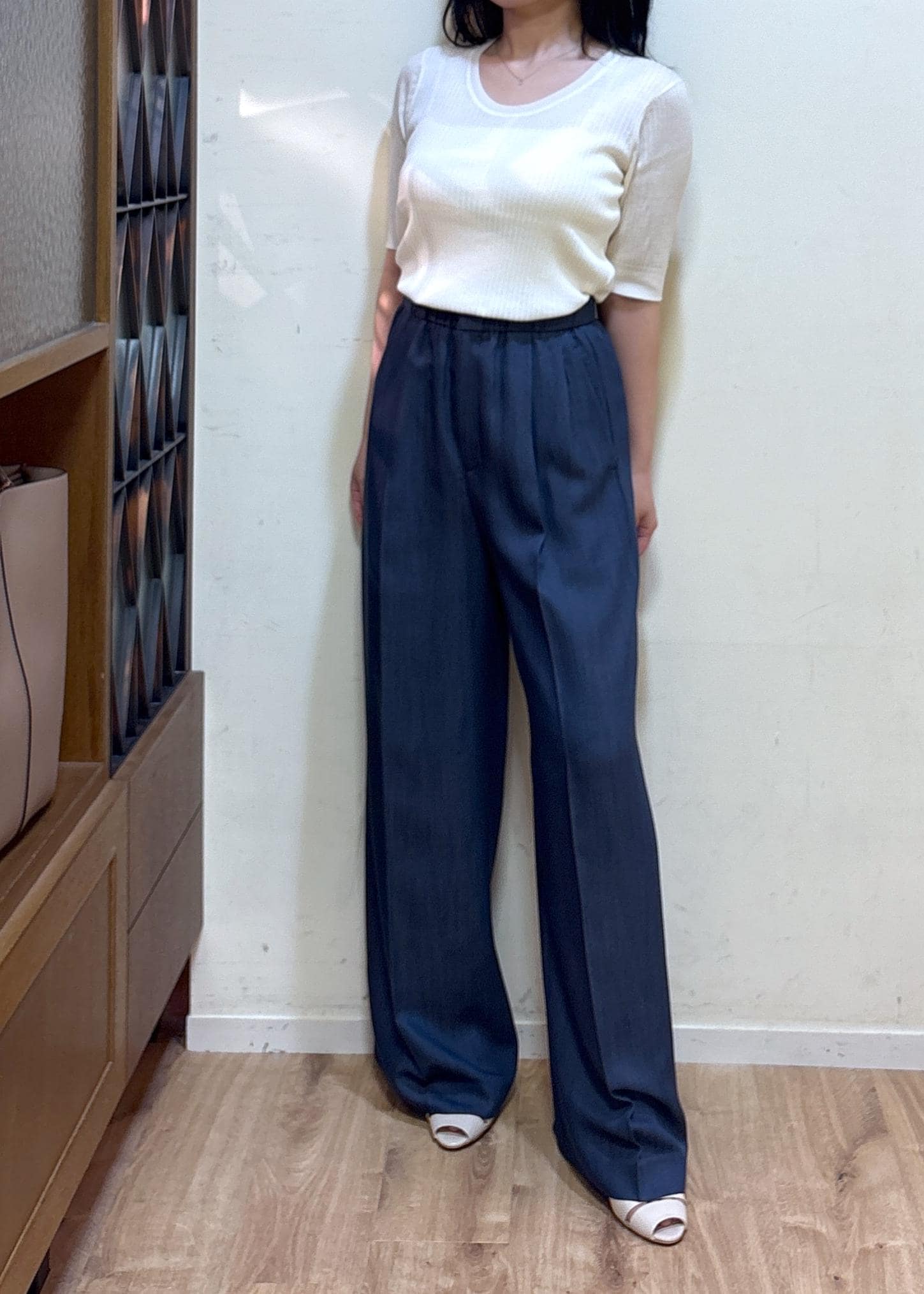 ROPÉ【洗える・カセット服・新色追加】バックサテンイージーワイドパンツ/お仕事・通勤・セットアップ対応ネイビー系 / 36¥27,500レビュー身長152cm 36サイズ着用