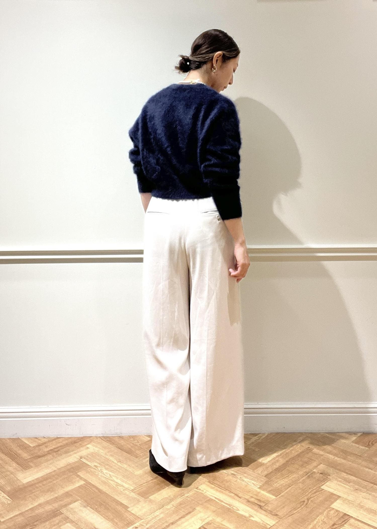 素材の光沢と落ち感がとても美しく柔らか。白いブラウス等で合わせると少しあらたまる席でもお使いいただけます。 -