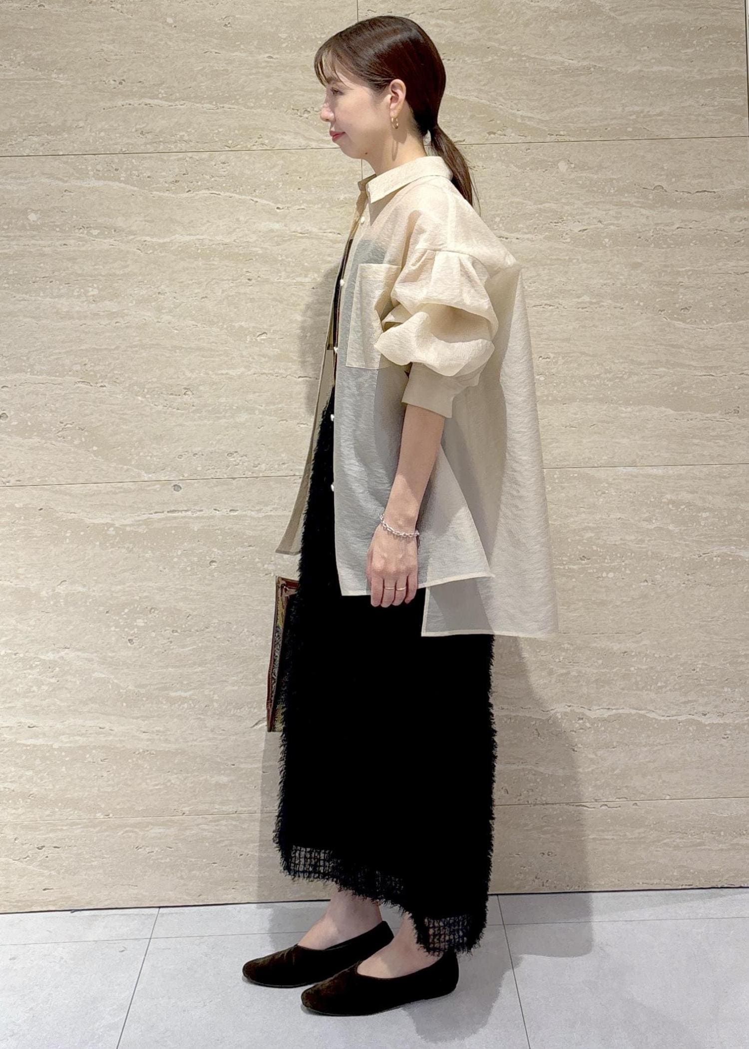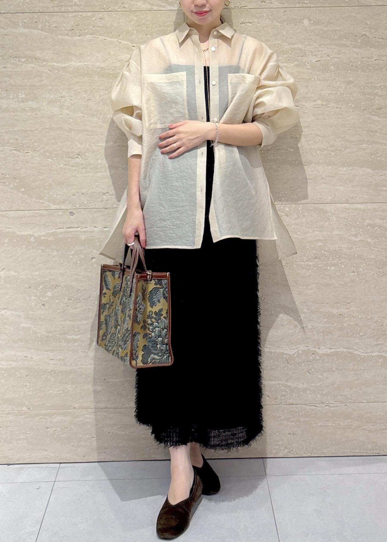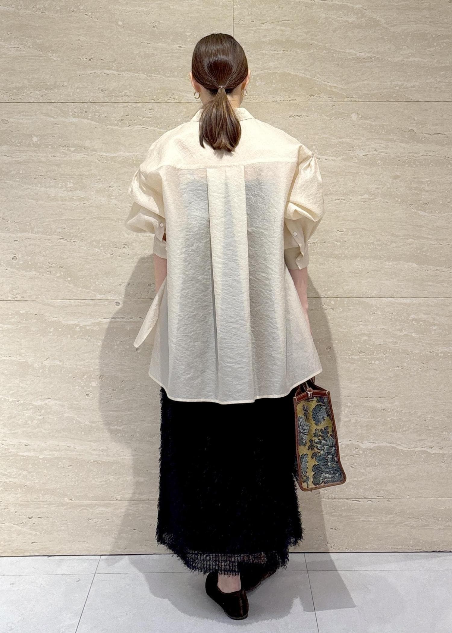 張りのある素材とボリュームある袖のデザインが存在感があるシアーシャツに、