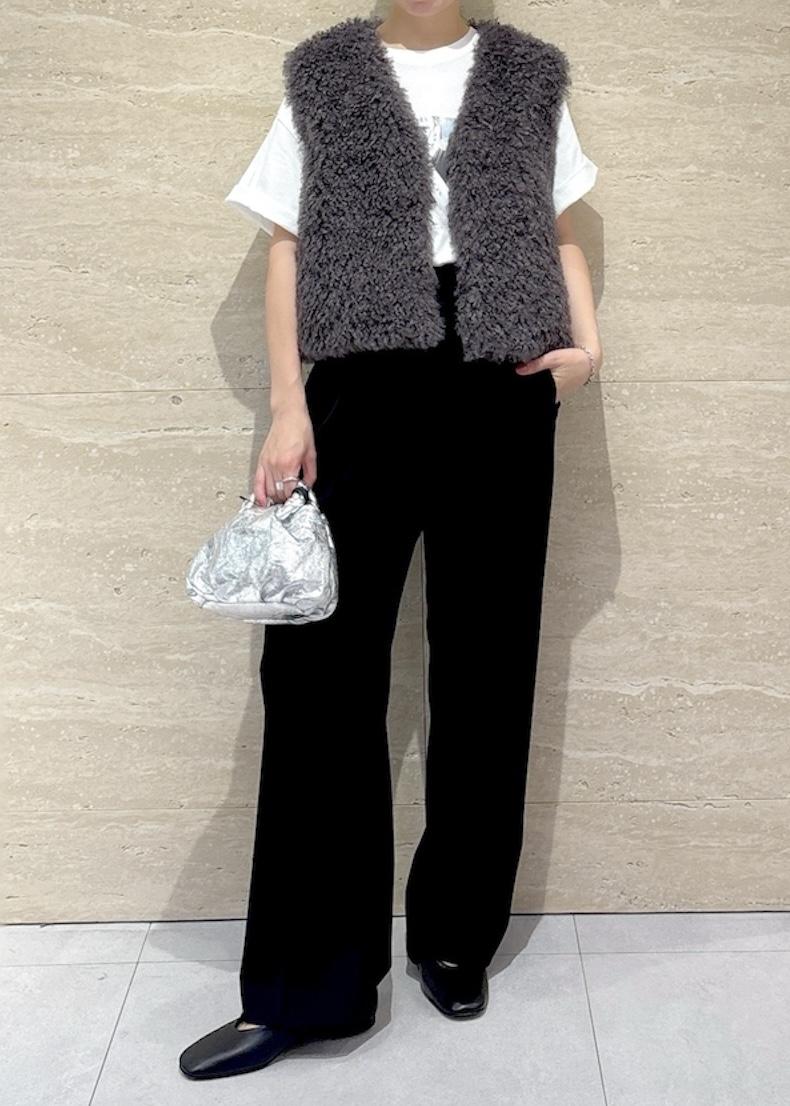 いつものTシャツ×パンツスタイルにファーベストを足すだけで一気に華やかな秋コーデの完成です!!