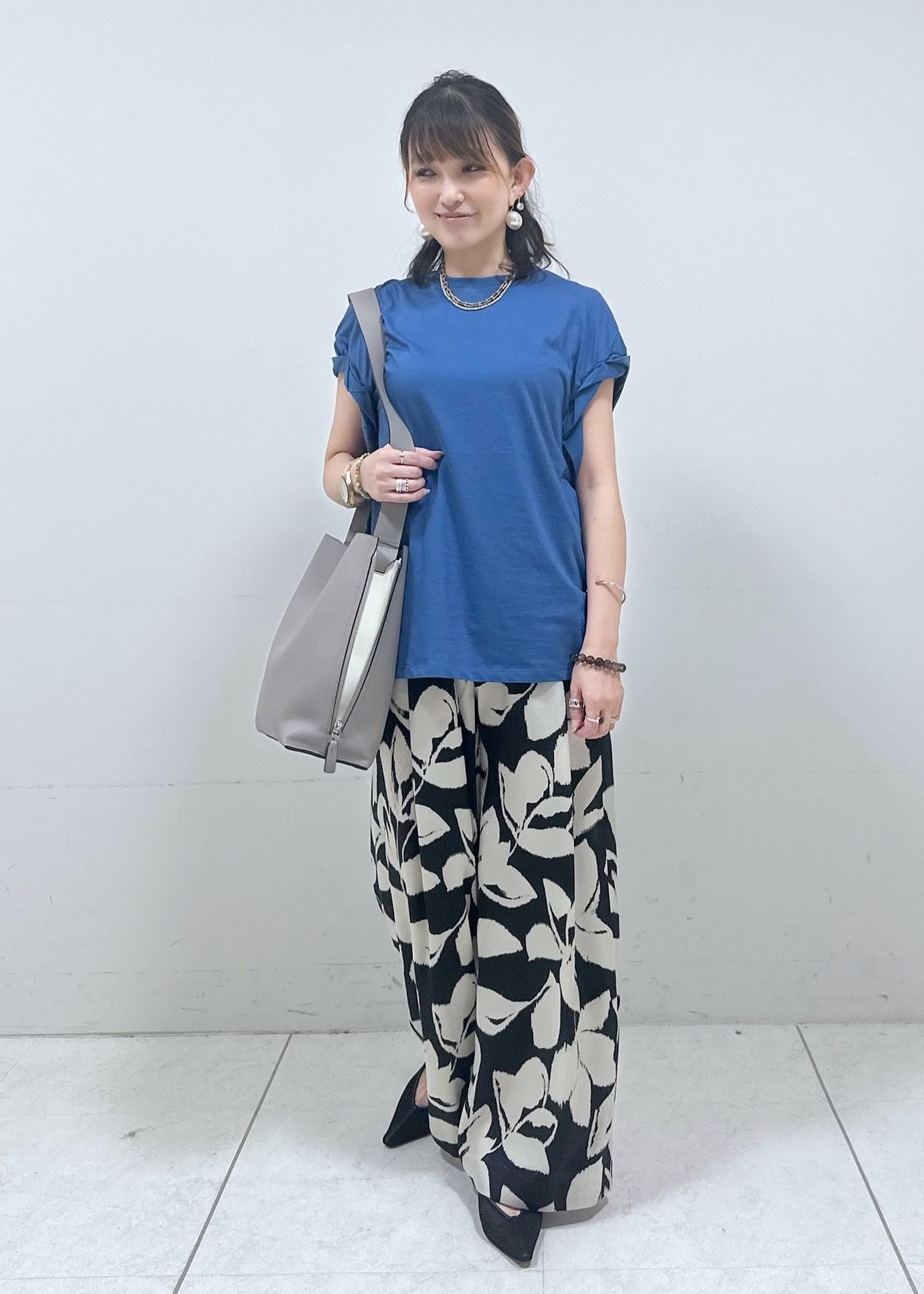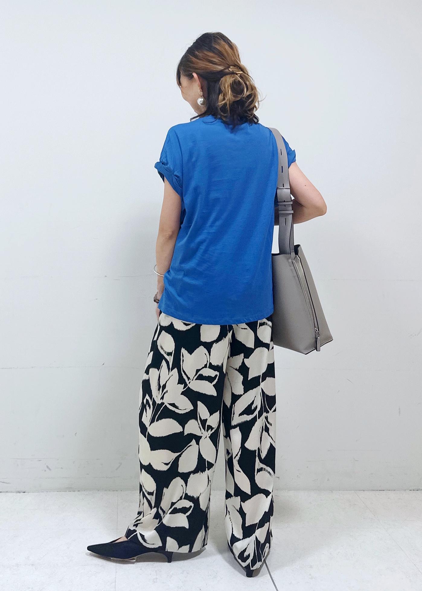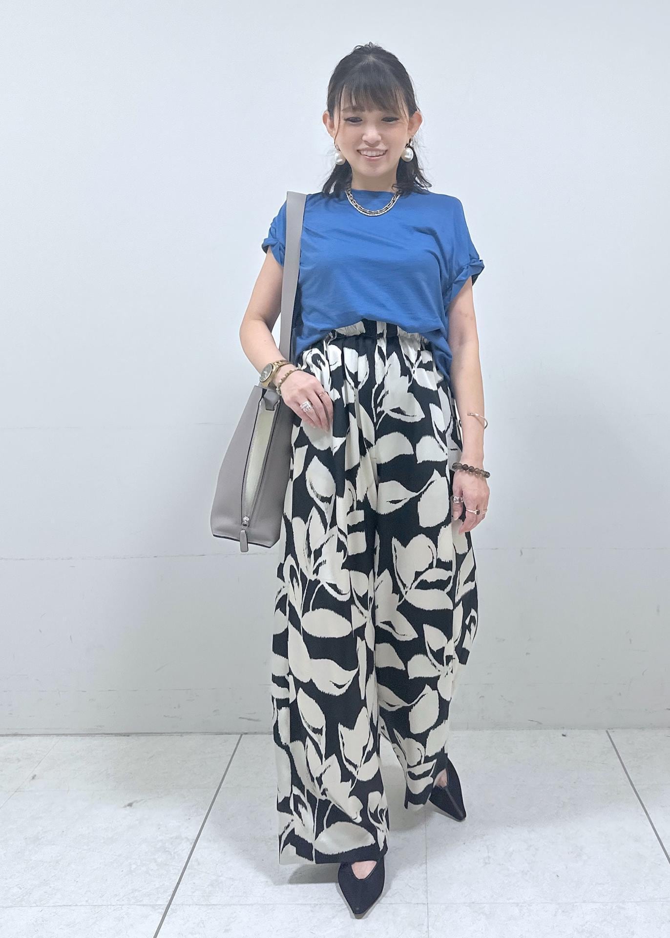 サラッとしたTシャツに、ロペでは定番になりつつある、フランスの生地メーカー『デヴォー』とのコラボパンツで、リラックス感もありつつ、秋に向けた晩夏コーデにしました!