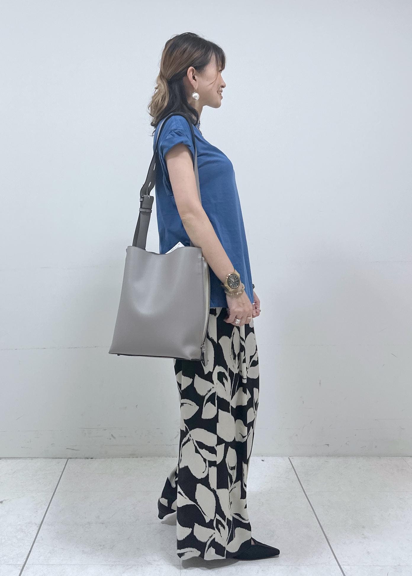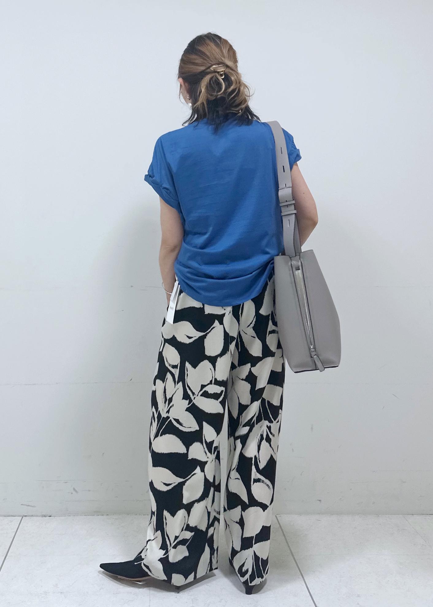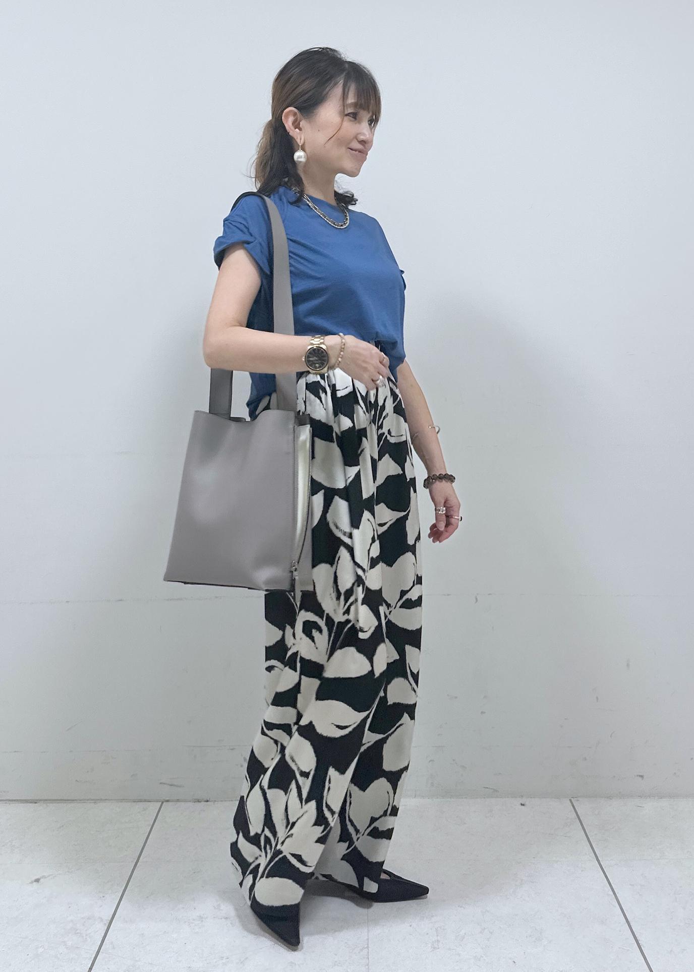 サラッとしたTシャツに、ロペでは定番になりつつある、フランスの生地メーカー『デヴォー』とのコラボパンツで、リラックス感もありつつ、秋に向けた晩夏コーデにしました!