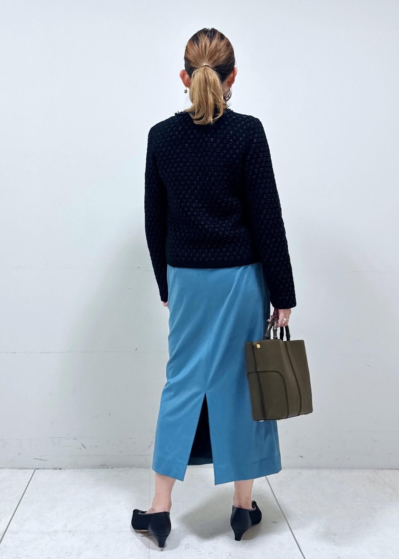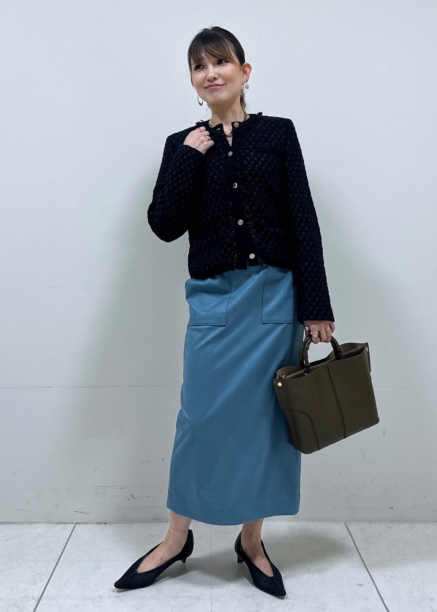 ツィード調に交編されたツィード調ニットに、カラースエードのスカートを合わせました!