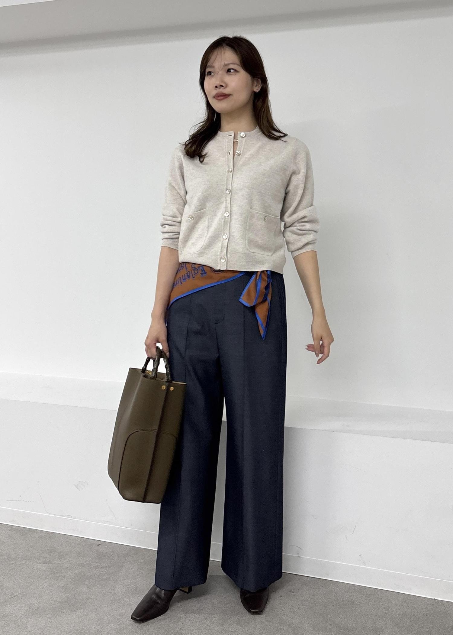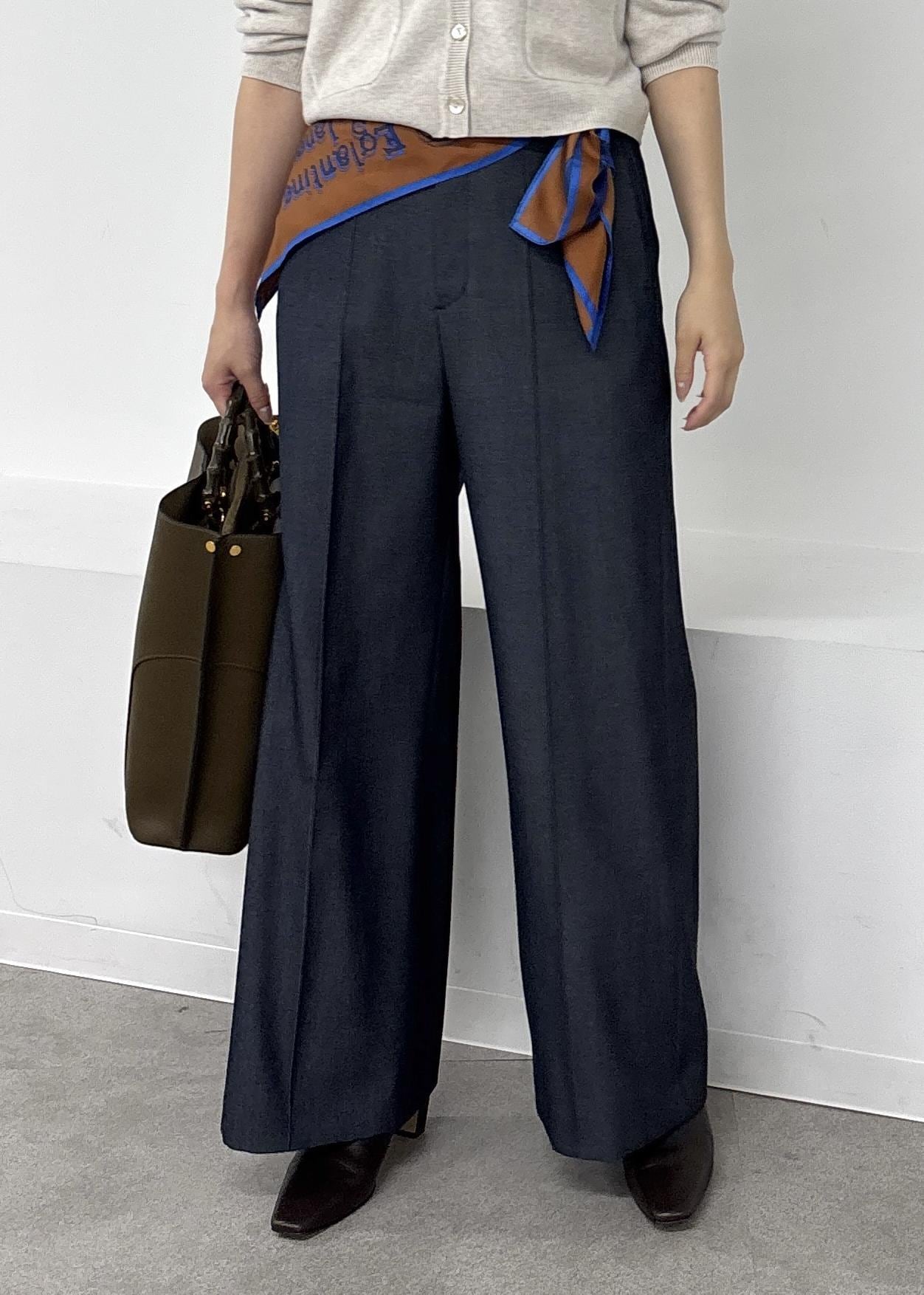 ROPÉ梳毛ギャバ プリーテッド ワイドパンツネイビー / 38¥29,700レビュータック無しのシルエットが綺麗なパンツ。ウール100%で暖かい着心地かつ、表面は起毛感無く肌あたりも滑らかです。程よく艶感もありシーズンの幅も広く合わせられると感じました。全体のサイズ感はジャスト。ウエストは後ろ側のみゴムで前側はぴしっと見え。骨盤が広めの体型ですが窮屈感は無く、着丈は私の身長でかかとから1cmほど上あたり。