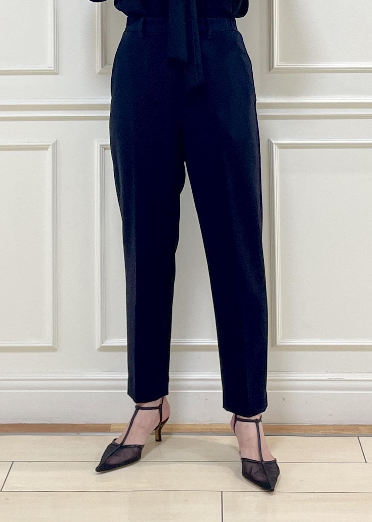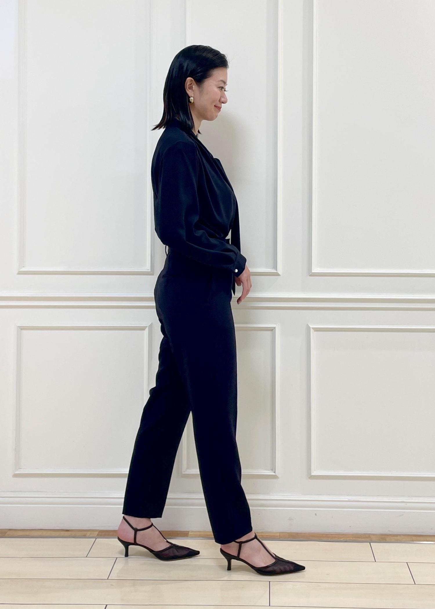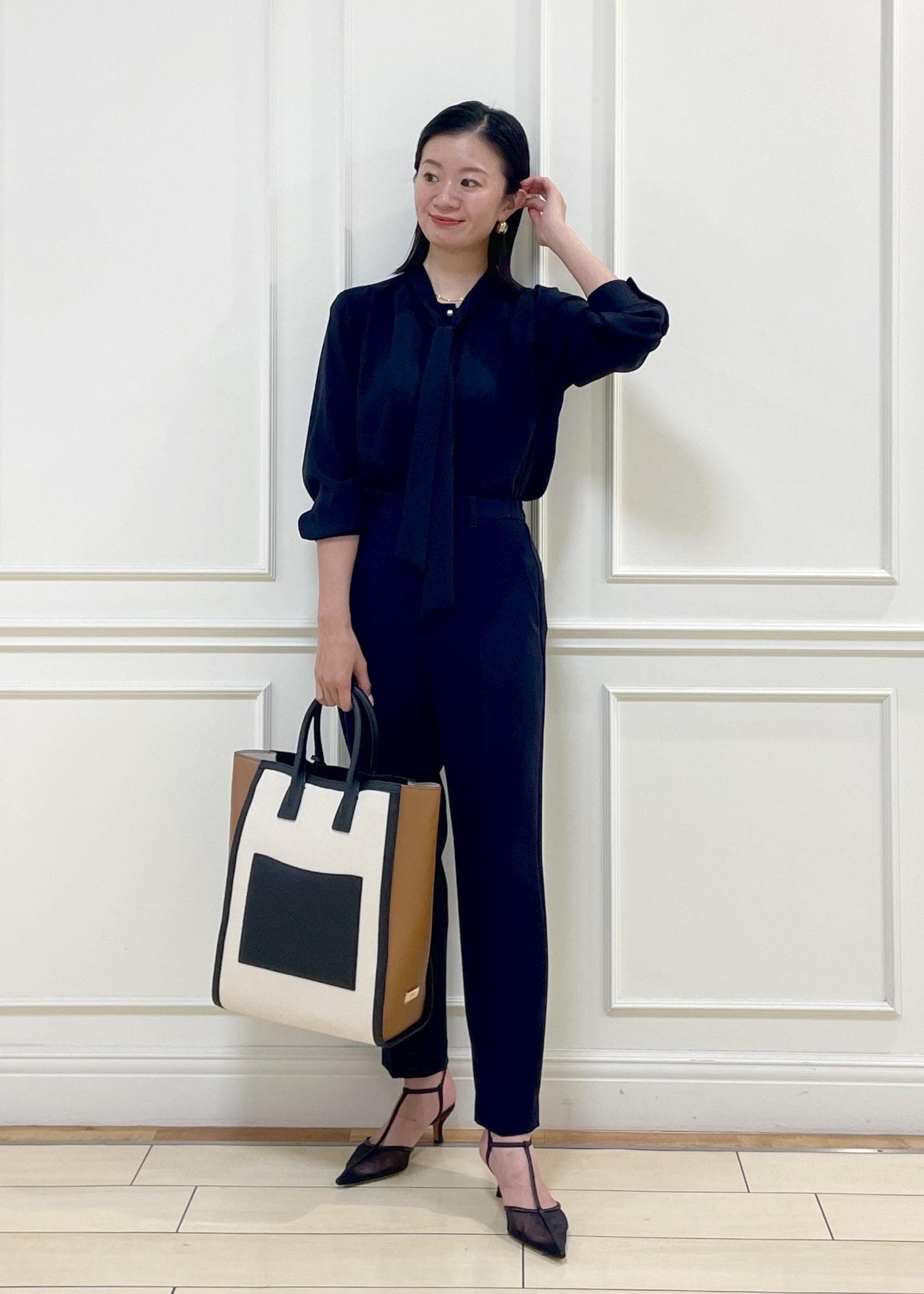 ネイビーのボウタイブラウスにテーパードパンツを合わせた、きちんと感のある綺麗めコーディネート。