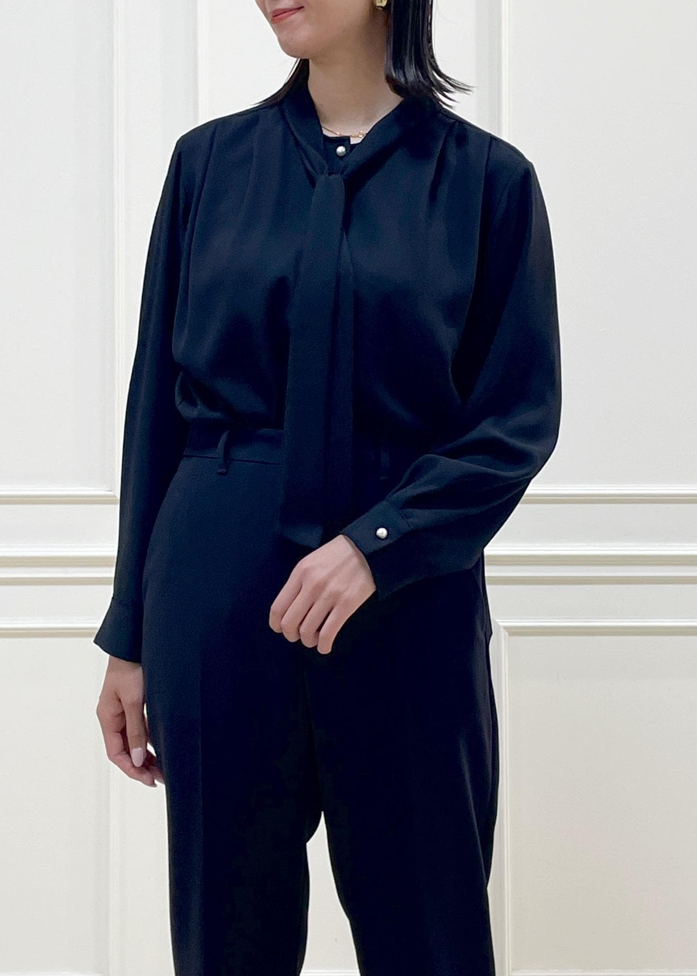 ROPÉボウタイブラウス/イージーケア・25AWネイビー / F¥22,000レビューほどよくゆったりしたシルエットで、体のラインを拾いにくいサイズ感。