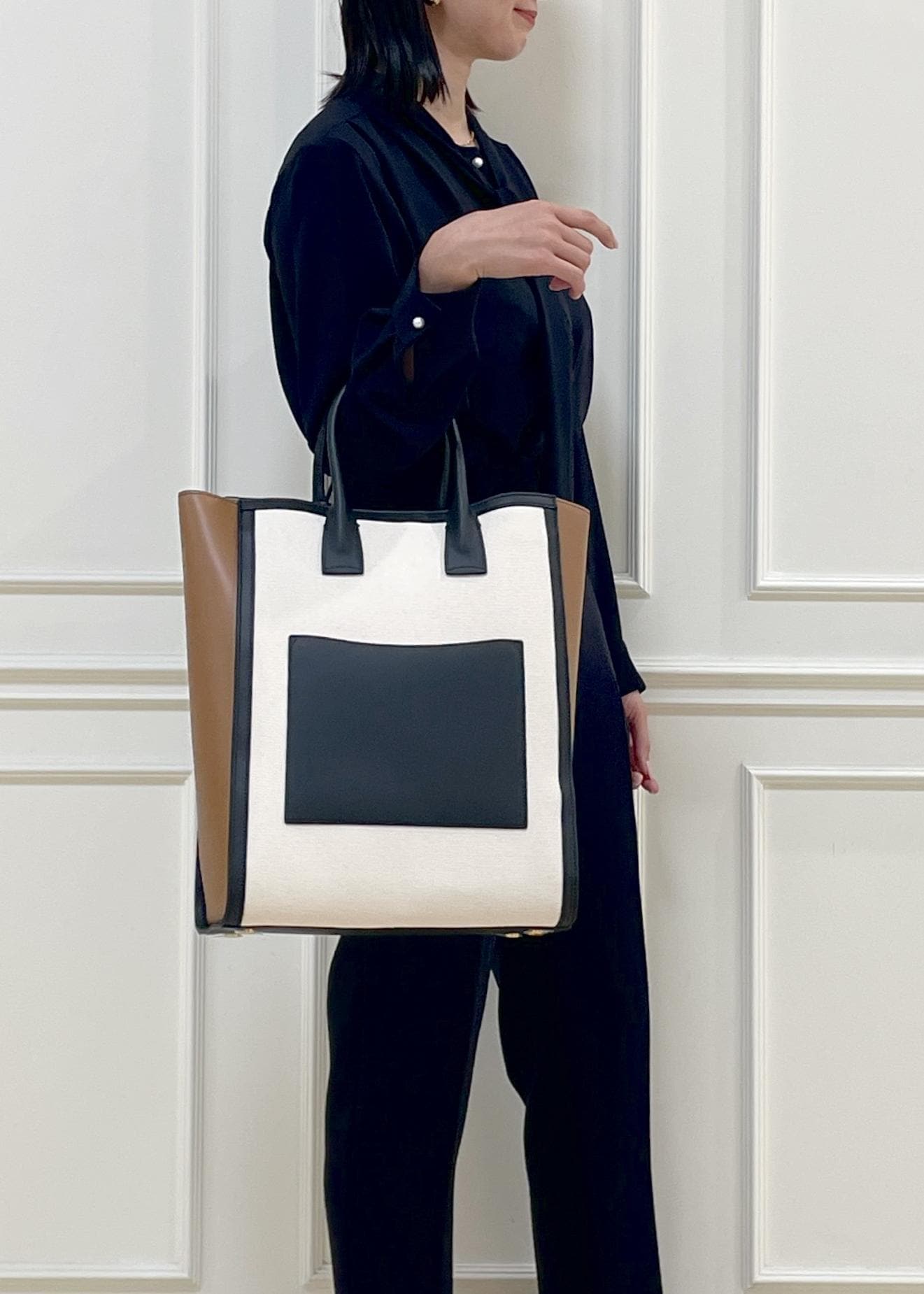 通勤スタイルにもぴったりなA4対応バッグは、キャンバス地と合皮の異素材ミックスでこなれ感をプラスし、堅くなりすぎず、程よい抜け感を出したスタイリングです。