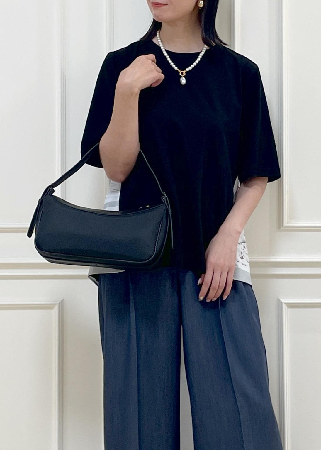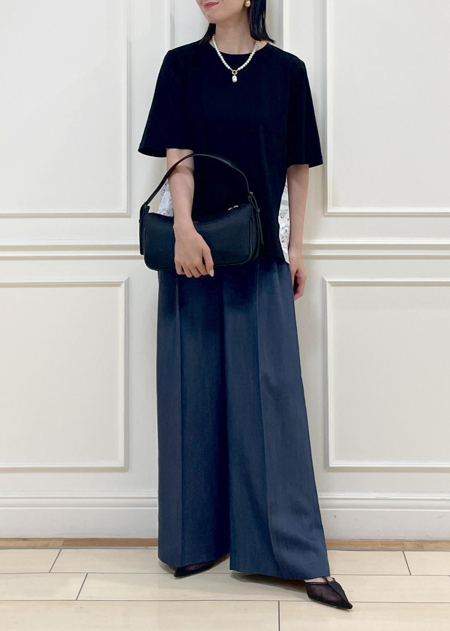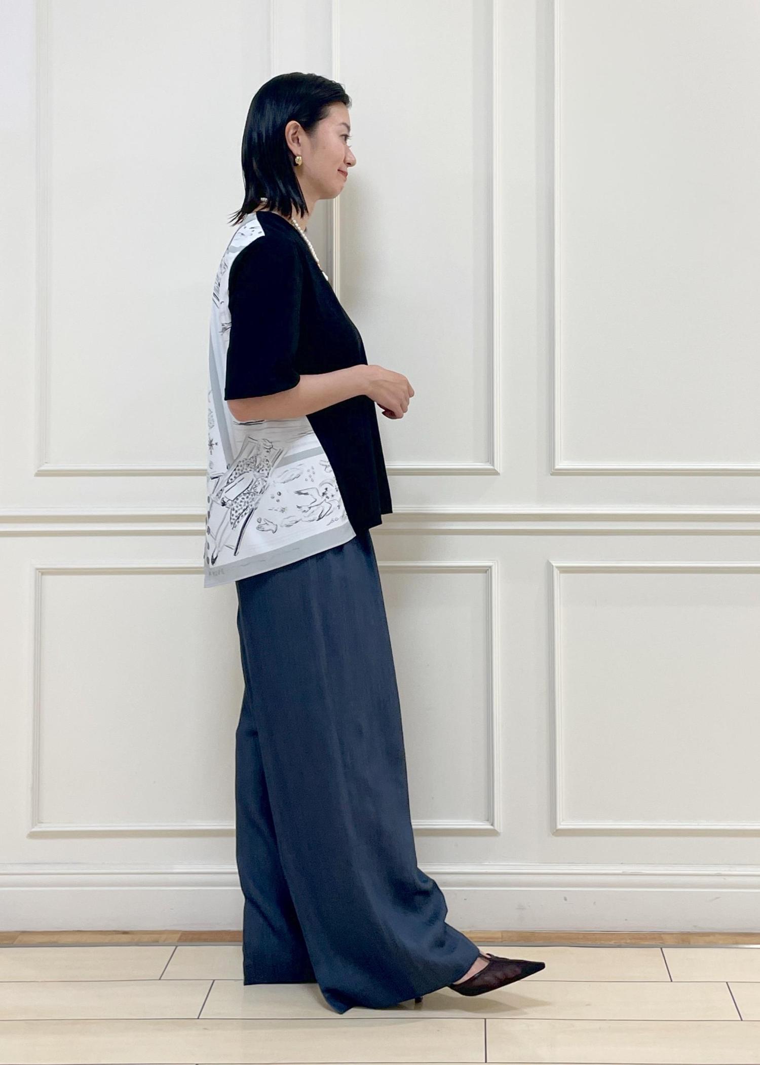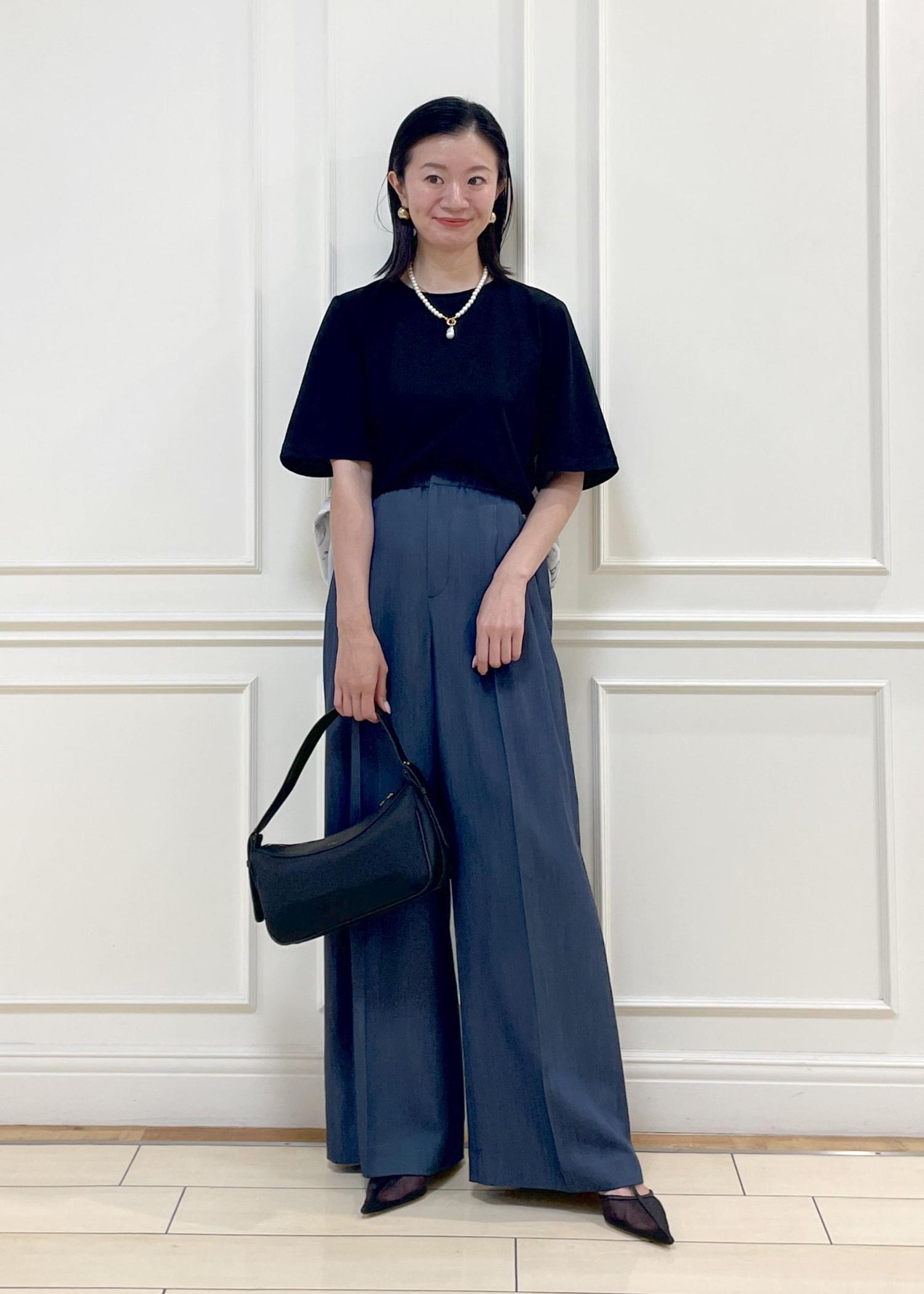 ボトムスには、抜け感のあるイージーワイドパンツを合わせて、リラックス感のある大人のこなれコーデにしてみました。