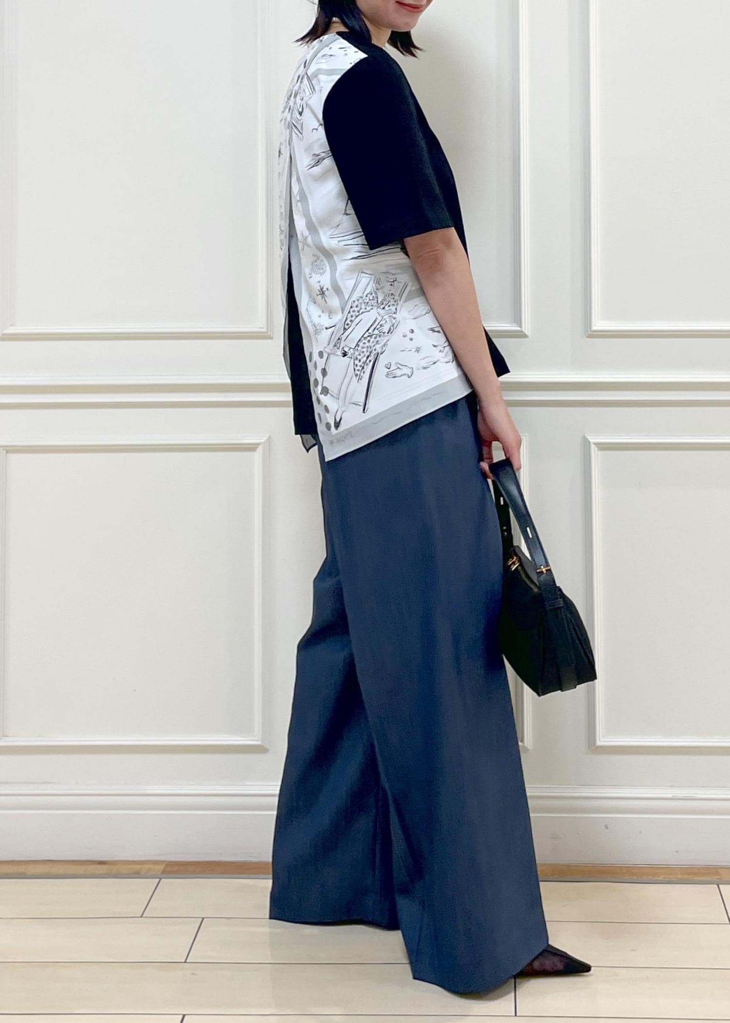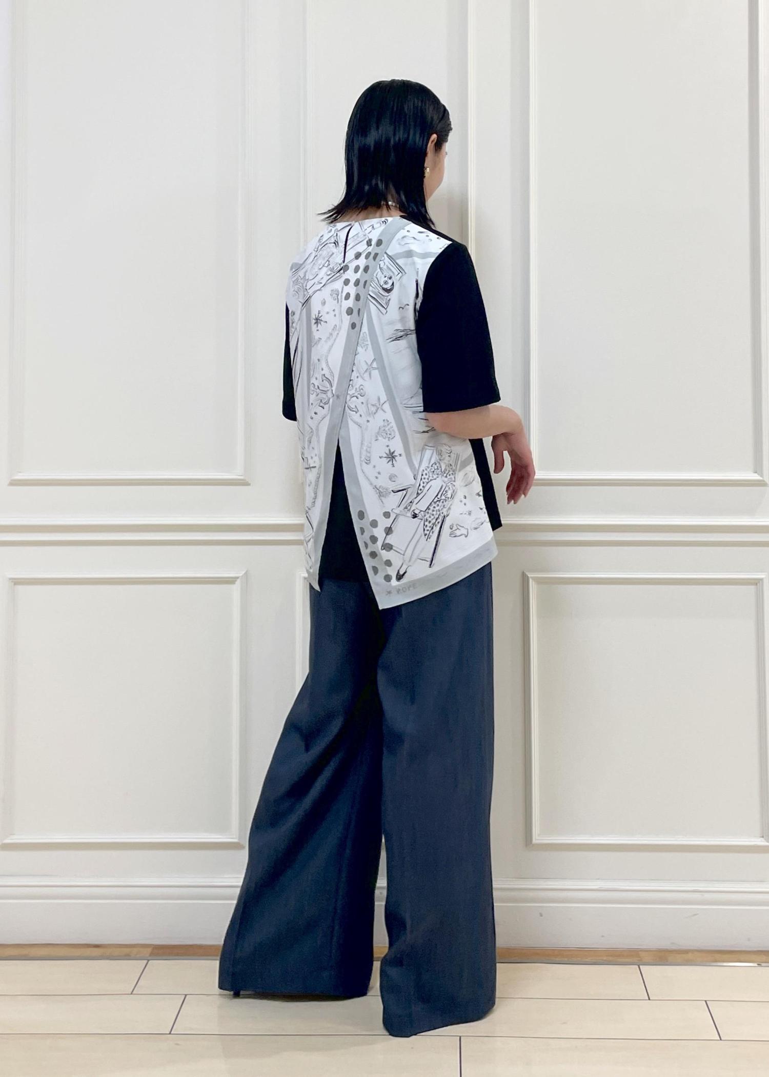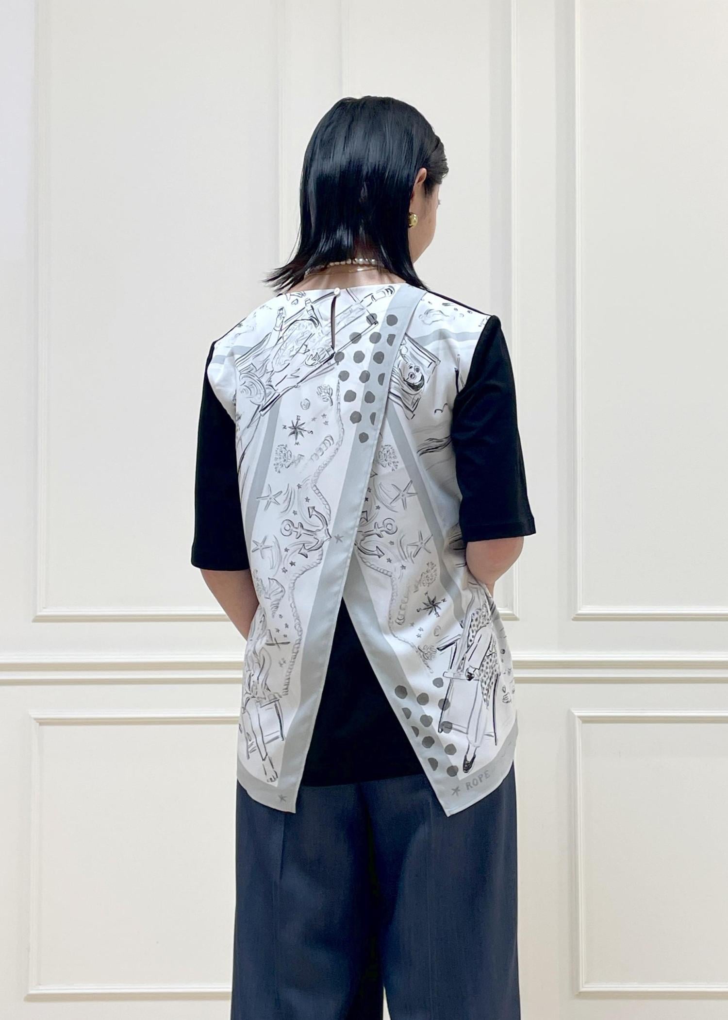 背面に大胆にあしらったスカーフ柄プリントが、シンプルな装いに華やかさをプラス。