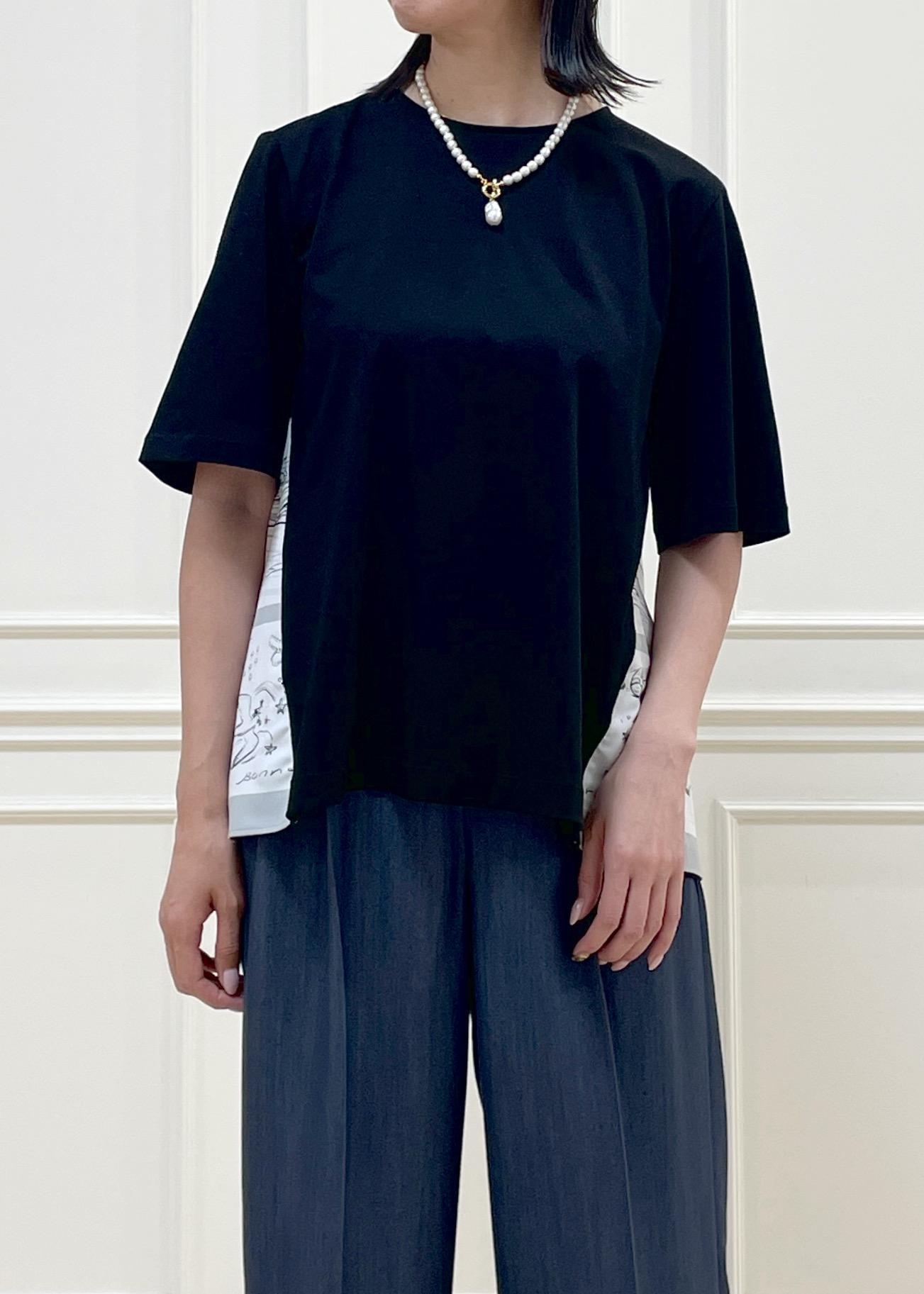 ROPÉ【洗える】【YUKO SAEKI for ROPE'・コラボ】スカーフ柄プリント Aラインカットソーブラック / F¥19,800レビュー背面に大胆にあしらったスカーフ柄プリントが、シンプルな装いに華やかさを添えるデザインカットソー。