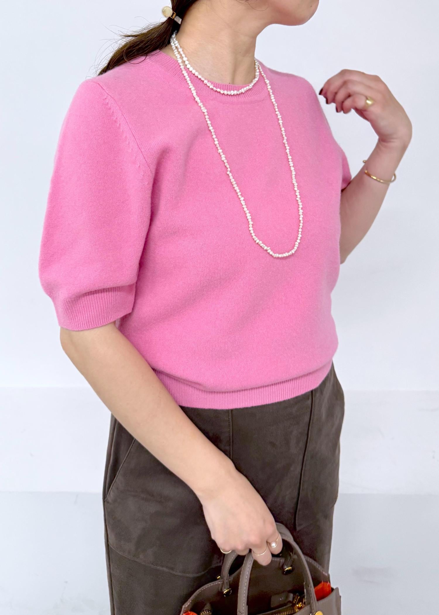 ROPÉウールカシミヤブレンド 5分袖ニットプルオーバー/イージーケアピンク系 / F¥19,800レビュー着丈は、骨盤でとまるくらいの長さなので、インでもアウトでもバランス良く着れます。