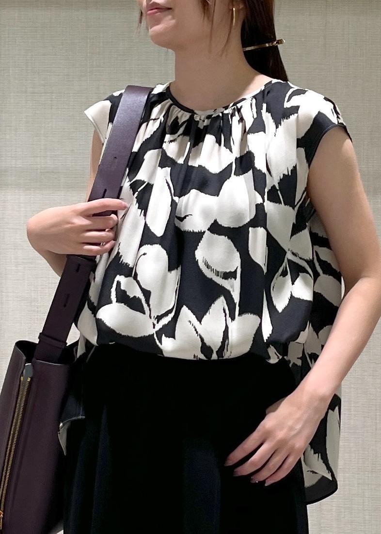 幾何柄のような大きな花柄プリントがアクセントのブラウスは、柔らかく落ち感のあるポリエステル生地でさらっとした着心地です。