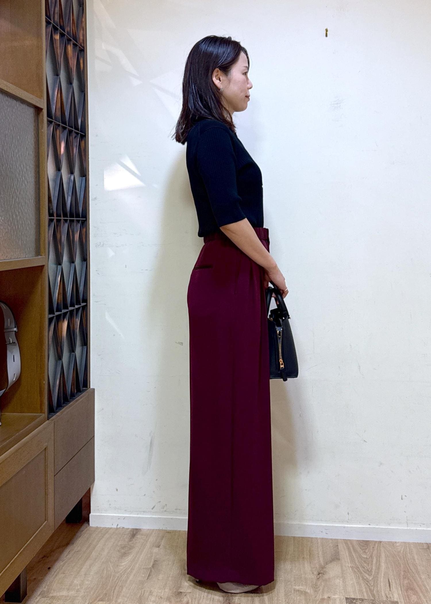 襟付きなのできちんと見えし、ボトムスにボルドーを合わせることで秋を意識したコーディネートに!