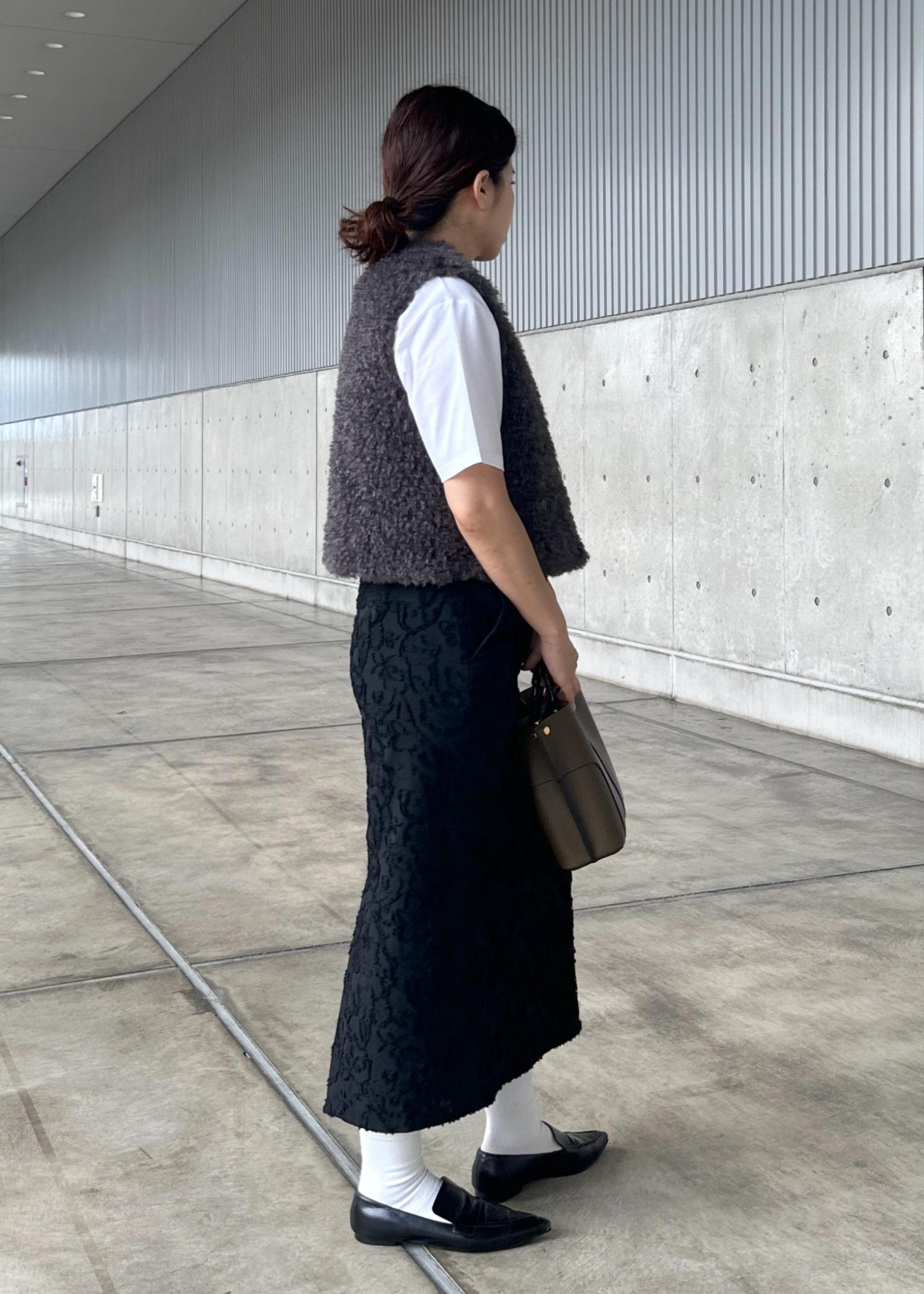 今年トレンドのフェイクファージレです。ショート丈のVネックで袖に分量のあるブラウスでももたつきにくい様にアームが広めに設定されています。