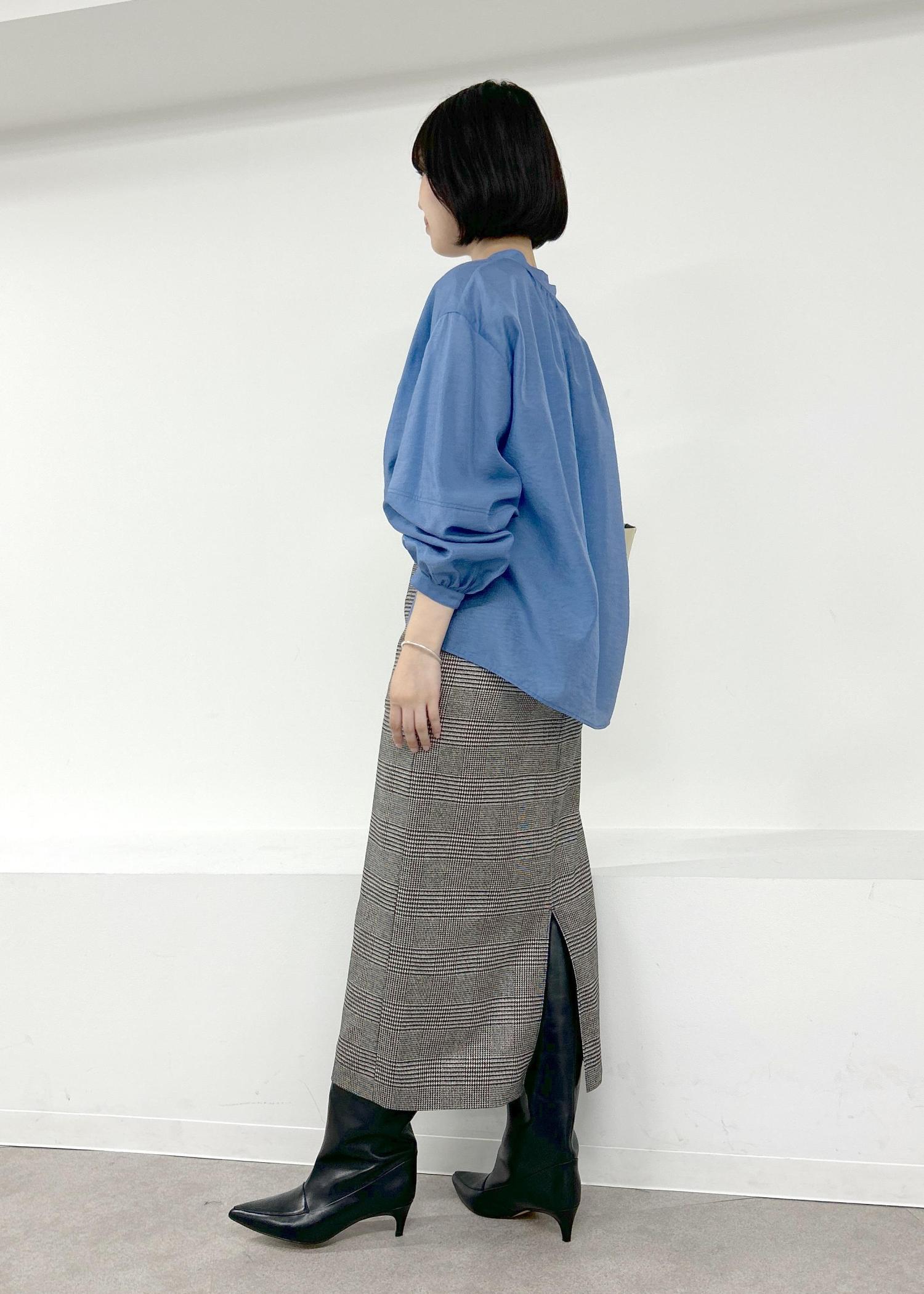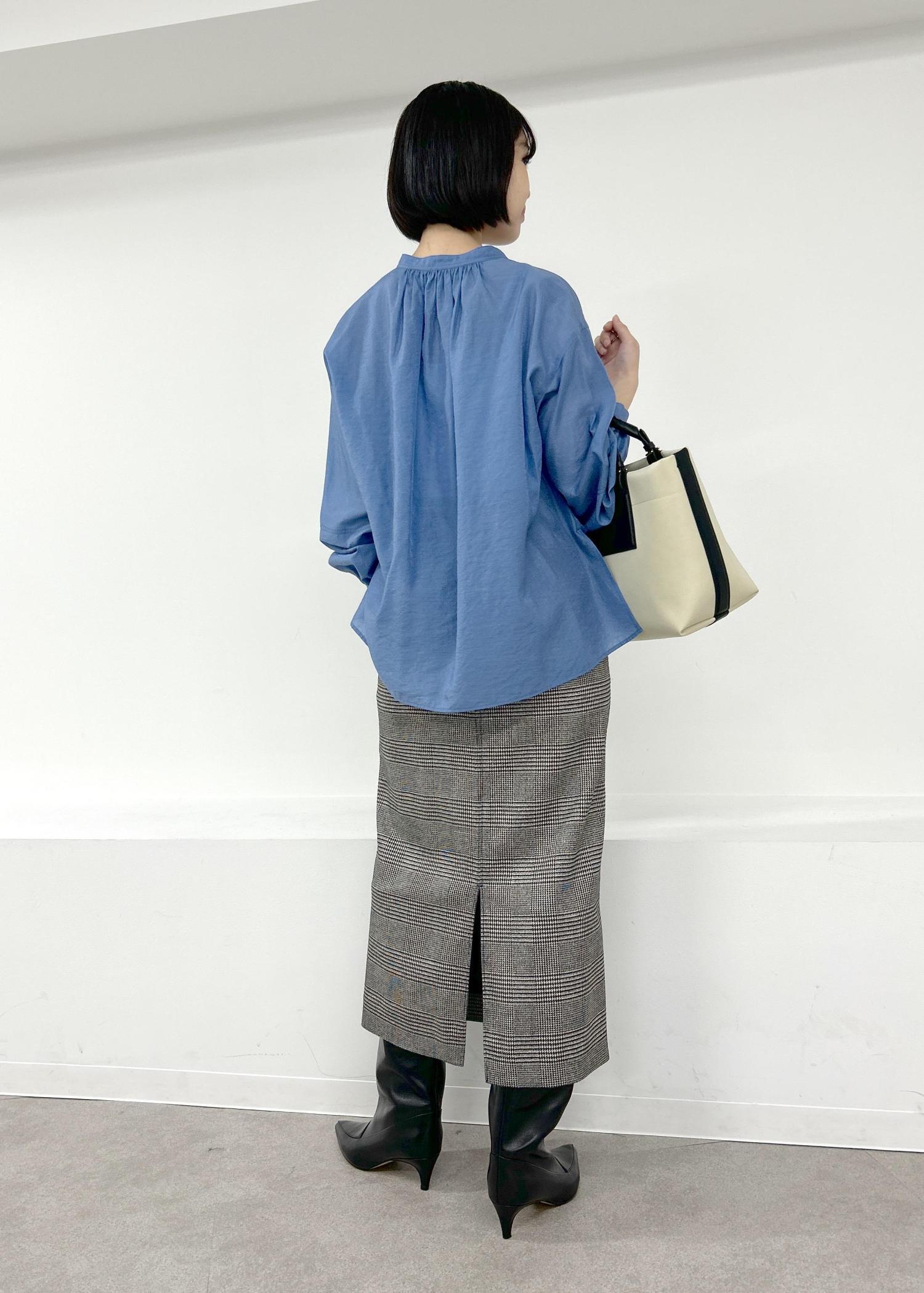 ROPÉキュプラシルクボリュームスリーブブラウス/イージーケアブルー系 / F¥19,800レビュー着丈が長めでヒップ隠れるくらいまであります。ボリューム袖で見頃もゆとりがあるデザインですが首周りはスタンドカラーでスッキリしているのでバランスがいいです。