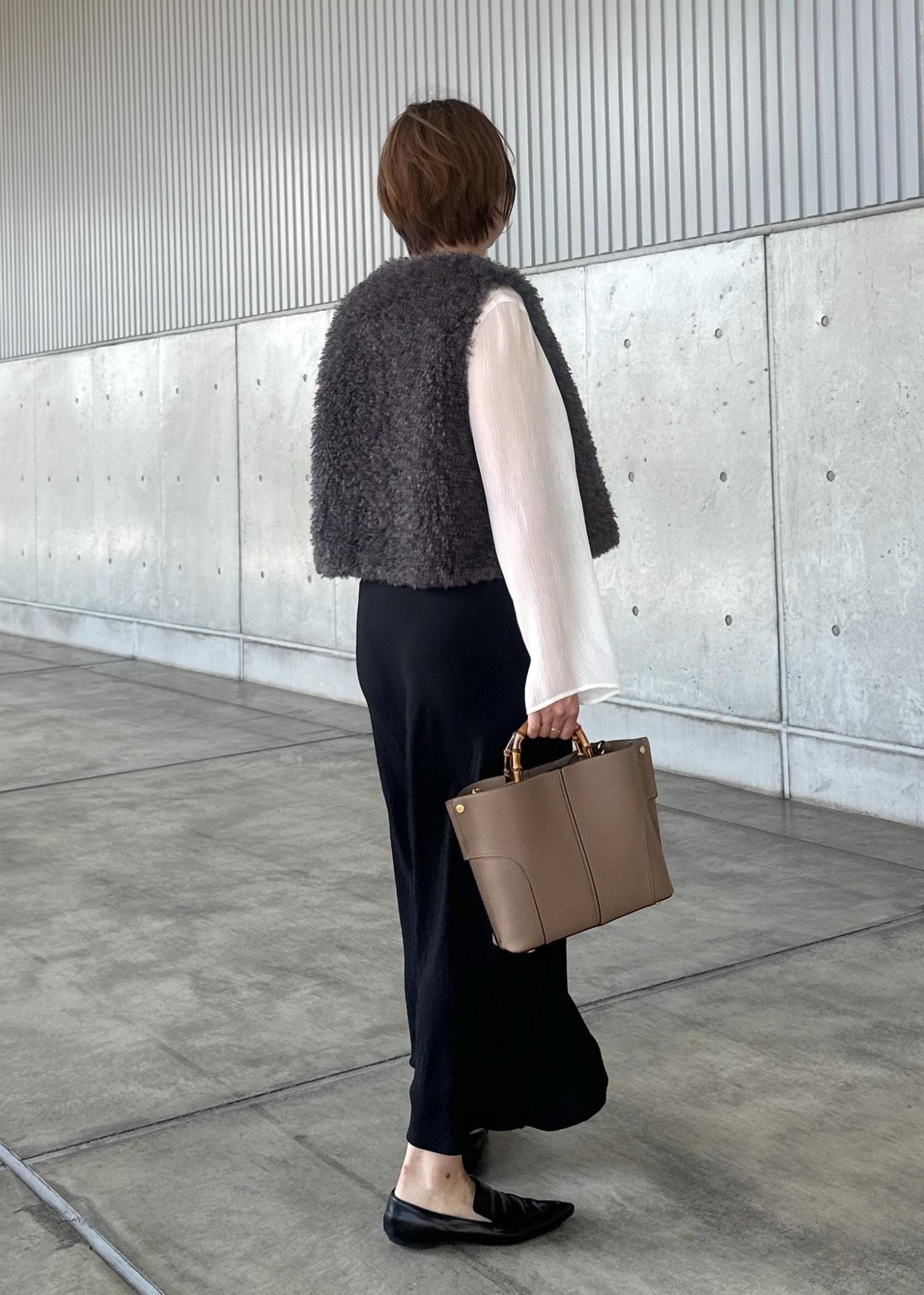 短めの着丈ですがカットソーやシャツとのレイヤードがしやすく、すっきり見えします。