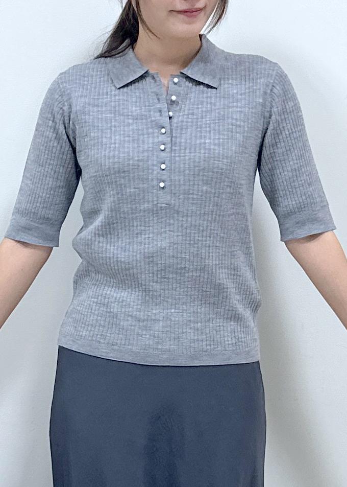 着丈は身長162cmでヒップにかかる長さで、パールボタンのクラシカルなポロ衿なので、きちんと感もあり女性らしいデザインです。