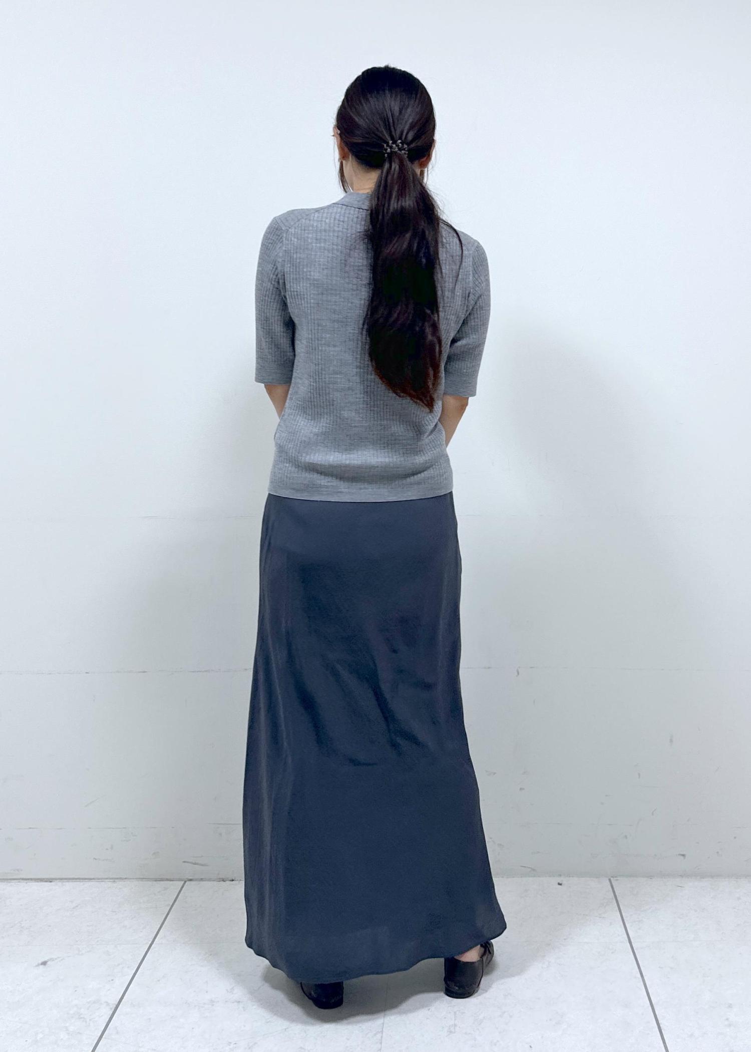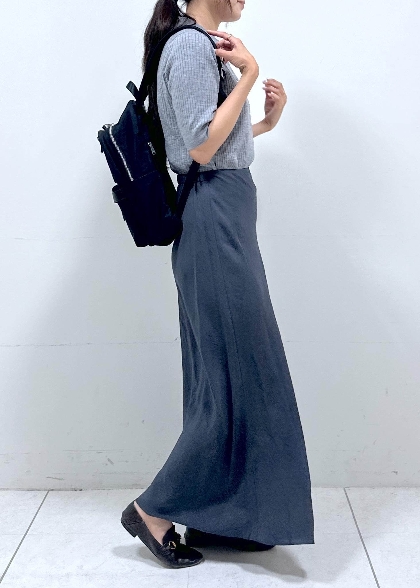 腰回りがすっきりとしたマーメイドシルエットで、ウエストが後ろゴムなので楽に着ていただけます◎